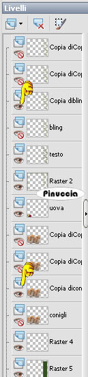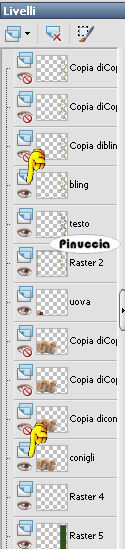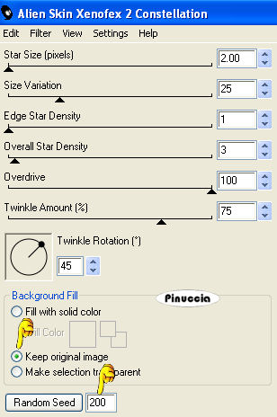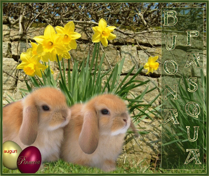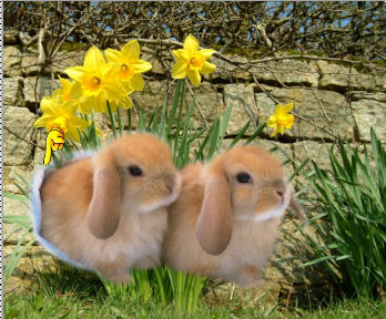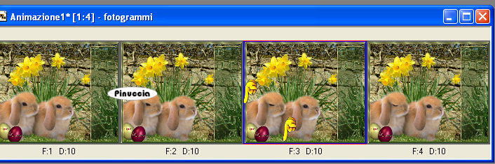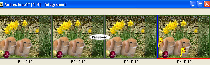 qui puoi trovare qualche risposta ai tuoi dubbi. Se l'argomento che ti interessa non è presente, ti prego di segnalarmelo. Questo tutorial è stato scritto con PSP X2, ma può essere eseguito anche con le altre versioni di PSP. Per tradurlo, l'ho eseguito con PSP X. Occorrente: Materiale qui Il tube è di Silke. L'immagine è di http://www.freefoto.com/browse/19-12-0?ffid=19-12-0"FreeFoto.com. Per prelevare foto da questo sito senza il copyright, ti sarà richiesto un indirizzo mail. Rispetta il lavoro degli autori e mantieni inalterati i tubes. Filtri: Alien Skin Xenofex qui Ti servirà anche Animation Shop qui Apri l'immagine "Narzissen.jpg". Se vuoi, puoi usare anche una tua immagine. Attiva lo strumento Selezione , rettangolo, sfumatura 0,e seleziona una parte dell'immagine. Modifica>Copia. Modifica>Incolla come nuova immagine. Le dimensioni dell'immagine dovrebbero essere circa 690 x 580. suggerimento per un'alternativa al passaggio precedente. Attiva lo strumento Ritaglio e ritaglia la parte scelta che ti servirà da base per il tutorial. Contemporaneamente, puoi controllare le dimensioni nella barra superiore degli strumenti. ![]() Apri SKF_Bunnys232.081.psp, e vai a Modifica>Copia. Torna al tuo lavoro e vai a Modifica>Incolla come nuovo livello. Immagine>Ridimensiona, all'80%, tutti i livelli non selezionato. Regola>Messa a fuoco>Metti a fuoco. Nel mio esempio, ho cancellato il mantello del coniglio. Attiva lo strumento Gomma ![]() ![]() e cancella il mantello. ![]() Sposta i conigli a sinistra.Rinomina questo livello "Conigli". Livelli>Duplica. Attiva lo strumento Pennello distorsione ![]() con i seguenti settaggi: ![]() e inizia a muovere le parti che vuoi animare. Nel mio esempio ho spostato in basso l'occhio del coniglio a sinistra e in alto il naso del coniglio a destra. Attiva il livello della copia e inizia a spostare le parti da animare. ![]() Livelli>Duplica. se ti appare un messaggio di azione automatica, clicca ok e continua. ![]() Adesso diminuisci il movimento dell'occhio e aumenta quello del naso. Livelli>Duplica. Aumenta gradualmente i due movimenti (a questo punto l'occhio del coniglio dovrebbe essere quasi chiuso. Questo è l'esempio del mio ultimo movimento. ![]() Ora puoi aggiungere le immagini per decorare la tag (puoi usare quelle fornite con il materiale, o altre immagini a scelta) e la tua firma. Vedi il mio esempio come guida. Quando hai fatto continua così: Livelli>Nuovo livello raster. Selezione>Seleziona tutto. Selezione>Modifica>Contrai, di 8 pixels. Imposta il colore di primo piano con il motivo oro ![]() Riempi la selezione con il motivo oro.Selezione>Modifica>Contrai, di 1 pixel. Premi sulla tastiera il tasto CANC ![]() Livelli>Nuovo livello raster. Selezione>Seleziona tutto. Selezione>Modifica>Contrai, 8 pixels. Selezione>Inverti. Imposta il colore di primo piano con un colore contrastante scelto dall'immagine. Io ho usato il verde scuro #324f1f. Riempi la selezione con il colore di primo piano.Selezione>Seleziona tutto. Selezione>modifica>Contrai di 1 pixel. Selezione>inverti. Riempi la selezione con il motivo oro.Selezione>Deseleziona. Livelli>Unisci>Unisci giù. Attiva lo strumento Testo e scegli un font.Io ho usato il font TobaccoRoadNF, dimensione 55, direzione verticale: ![]() imposta il colore di primo piano con il motivo oro e il colore di sfondo con il verde. Scrivi il primo testo. Livelli>Converti in livello raster. Scrivi il secondo testo. Livelli>Converti in livello raster. Posiziona i due testi come preferisci.Assicurati di essere posizionato sul livello superiore e vai a Livelli>Unisci>Unisci giù. Livelli>Duplica. Rinomina questo livello Bling. Livelli>Duplica, per 3 volte. Attiva il livello Bling. Selezione>Seleziona tutto. Selezione>Mobile. Selezione>Modifica>Contrai, di 2 pixels. Effetti>Plugins>Alien Skin Xenofex 2 - Constellation, con i seguenti settaggi: ![]() Attiva il livello Copia di Bling. Ripeti l'Effetto Constellation, con gli stessi settaggi, ma cliccando una volta su Random Seed. Chiudi questo livello. Attiva il livello copia (2) di Bling. Ripeti l'Effetto Constellation, cliccando su Random Seed. Chiudi il livello. Attiva il livello copia (3) di Bling. Ripeti l'Effetto Constellation, cliccando su Random Seed. Attiva il livello originale del testo. Effetti>Effetti 3D>Sfalsa ombra, con i seguenti settaggi, colore nero: ![]() Ripeti l'Effetto Sfalsa ombra, ma cambiando verticale e orizzontale con -1. Attiva il livello inferiore. Livelli>Nuovo livello raster. Attiva lo strumento Selezione , rettangolo,e traccia un rettangolo intorno al testo. Riempi la selezione con il motivo oro.Selezione>Modifica>Contrai, di 1 pixel. Premi sulla tastiera il tasto CANC. Livelli>Nuovo livello raster. Riempi la selezione con il colore usato per il testo e per la cornice.Selezione>Deseleziona. Abbassa l'opacità di questo livello al 40%. Assicurati che siano chiusi le copie di Bling e le copie dei conigli. Soltanto i livelli Conigli e Bling devono essere visibili. Posizionati su uno qualsiasi dei livelli visibili. ![]() Modifica>Copia Unione. Apri Animation Shop e vai a Modifica>Incolla>Incolla come nuova animazione. Torna in PSP. Chiudi i livelli Bling e Conigli. Apri i livelli della prima copia di Conigli e della prima copia di Bling. ![]() Modifica>Copia Unione. Torna in Animation Shop e vai a Modifica>Incolla>Incolla dopo il fotogramma corrente. Di nuovo in PSP. Chiudi i livelli della prima copia di Bling e Conigli. Apri i livelli della seconda copia di Bling e Conigli. Modifica>Copia Unione. Di nuovo in Animation Shop: Modifica>Incolla>Incolla dopo il fotogramma corrente. Ancora in PSP. Chiudi i livelli della seconda copia di Bling e Conigli. Apri i livelli della terza copia di Bling e Conigli. Modifica>Copia unione. Di nuovo in Animation Shop: Modifica>Incolla>Incolla dopo il fotogramma corrente. Clicca sul fotogramma 3. Attenzione: soltanto questo deve essere selezionato e avere la cornice blu: ![]() Modifica>Copia. Clicca sull'ultim