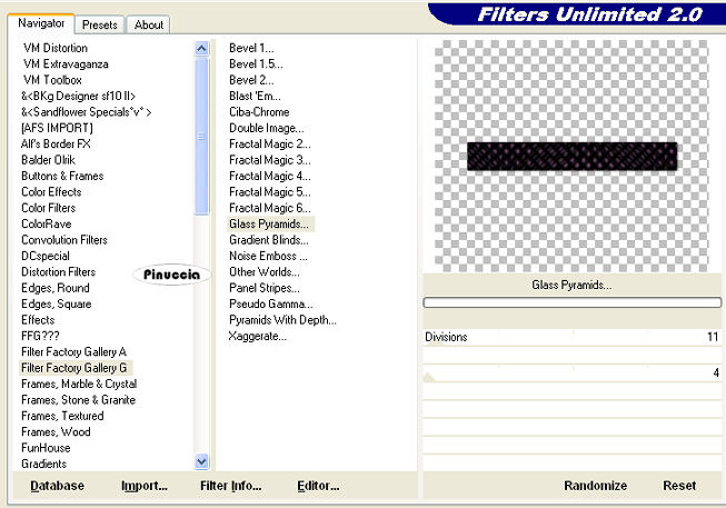 Effetti>Plugins>Filters Unlimited - Factory Gallery G - Glass Pyramides, con i settaggi standard.