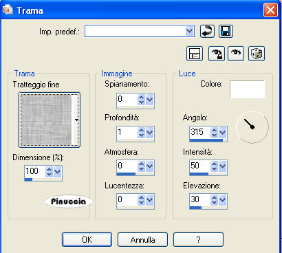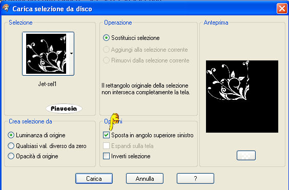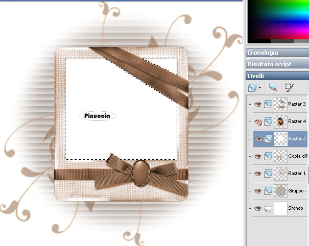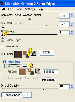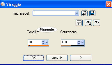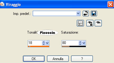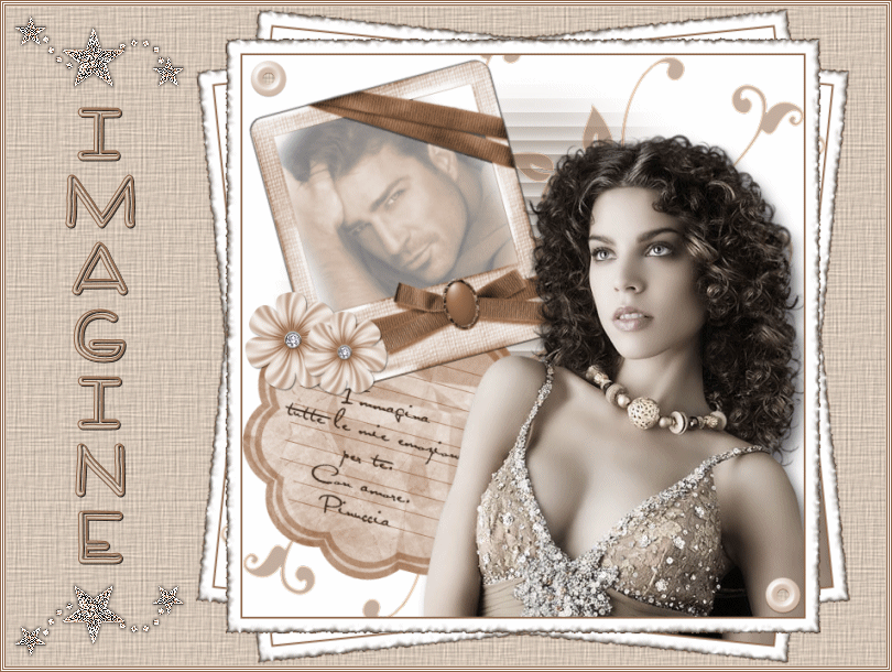qui puoi trovare qualche risposta ai tuoi dubbi. Se l'argomento che ti interessa non è presente, ti prego di segnalarmelo. Questo tutorial è stato scritto con PSP X2, ma può essere eseguito anche con le altre versioni di PSP. Per tradurlo, l'ho eseguito con PSP X. Occorrente: Materiale qui I tubes che ho usato sono di Jet, Cozy e Laufey. Il materiale scrap è di Sentimental Styles. Trovi i termini d'uso di Melissa nello zip. Rispetta il lavoro degli autori e mantieni inalterati i tubes. Filtri: Alien Skin Xenofex qui Un ringraziamento a Jet per la selezione Jet-Sel1.PspSelection (mettila nella cartella Selezioni). Metti la maschera nella cartella Maschere. Imposta il colore di primo piano con #928175, e il colore di sfondo con #d5c6b7. Apri una nuova immagine BIANCA 600 x 600 pixels. Livelli>Nuovo livello raster. Riempi con il colore di primo piano.Livelli>Carica/Salva maschera>Carica maschera da disco. Cerca e carica la maschera montiblindsmask.jpg: ![]() Livelli>Unisci>Unisci gruppo. Livelli>Nuovo livello raster. Selezione>Carica/Salva selezione>Carica selezione da disco. Cerca e carica la selezione Jet-sel1.PspSelection. ![]() Riempi la selezione con il colore #8f674a.Selezione>Deseleziona. ![]() Effetti>Effetti di bordo>Aumenta. Abbassa l'opacità di questo livello al 48%. Immagine>Rifletti. Livelli>Duplica. Immagine>Rifletti. Immagine>Capovolgi. Attiva il livello superiore. Apri SS_Imagine_Frame-with-Ribbon.pspimage, e vai a Modifica>Copia. Torna al tuo lavoro e vai a Modifica>Incolla come nuovo livello. Regola>Saturazione e tonalità>Viraggio: ![]() Attiva il livello sottostante. Apri Man-Laufey.psp, e vai a Modifica>Copia. Torna al tuo lavoro e vai a Modifica>Incolla come nuovo livello. Immagine>Ridimensiona, all'80%, tutti i livelli non selezionato. Sistema il tube nella cornice.Togli la visibilità a questo livello. Attiva il livello soprastante della cornice. Attiva lo strumento Bacchetta magica ![]() ![]() seleziona il centro della cornice e l'angolo in alto a destra. ![]() Selezione>modifica>Espandi, 2 pixels. Attiva il livello Raster 2. Riempi la selezione con il colore bianco.in modalità Nessuno, per riempire basterà un solo clic ![]() ![]() Mantieni selezionato. Attiva il livello Raster 4 (il tube dell'uomo). Rendilo nuovamente visibile. Selezione>modifica>Espandi - 2 pixels. Selezione>inverti. Premi sulla tastiera il tasto CANC ![]() Selezione>Deseleziona. Abbassa l'opacità di questo livello al 50%. Regola>Saturazione e tonalità>Viraggio, con i settaggi precedenti. Attiva il livello Raster 3 (la cornice). Livelli>Unisci>Unisci giù. Ripeti Livelli>Unisci>Unisci giù. se dopo questi passaggi la cornice "schiarisce", annulla l'unione dei livelli. Chiudi tutti i livelli tranne i tre livelli superiori (cornice, tube dell'uomo e livello bianco) e vai a Livelli>Unisci>Unisci visibile. Immagine>Ridimensiona, all'80%, tutti i livelli non selezionato. Immagine>Ruota per gradi - 15 gradi a sinistra: ![]() Sposta la cornice nell'angolo in alto a sinistra.Effetti>Effetti 3D>Sfalsa ombra, con i seguenti settaggi, colore nero: ![]() Ripeti l'Effetto Sfalsa ombra, ma cambiando verticale e orizzontale con -1. Attiva il livello Copia di Raster 1. Apri SS_Imagine_JournalBlock.pspimage, e vai a Modifica>copia. Torna al tuo lavoro e vai a Modifica>Incolla come nuovo livello. Regola>Saturazione e tonalità>Viraggio, con i settaggi precedenti. Attiva lo strumento Testo e scegli un bel font.Io ho usato Al Sandra - dimensione 20 - crea come vettore - colore di sfondo #483527. Scrivi un testo a scelta sul foglietto di carta. Con i nodi vettori dello strumento, se vuoi, puoi adattare le linee del testo a quelle del foglietto. Livelli>Converti in livello raster. Cambia la modalità di miscelatura di questo livello in Moltiplica. Livelli>Unisci>Unisci giù. Immagine>Ruota per gradi - 15 gradi a destra. ![]() Sposta l'immagine sul bordo a sinistra.Vedi il mio esempio per controllare la posizione. Apri jet-woman16-juni-20071.pspimage, e vai a Modifica>Copia. Torna al tuo lavoro e vai a Modifica>Incolla come nuovo livello. Sposta il tube nell'angolo in basso a destra.Regola>Saturazione e tonalità>Viraggio, con i settaggi precedenti. Effetti>Effetti 3D>sfalsa ombra, con i seguenti settaggi: ![]() Apri SS_Imagine_Flowers.pspimage, e vai a Modifica>Copia. Torna al tuo lavoro e vai a Modifica>Incolla come nuovo livello. Immagine>Ridimensiona, al 50%, tutti i livelli non selezionato. Attiva lo strumento Selezione , cerchio, sfumatura 0,e traccia una selezione del diamante al centro del fiore. fai attenzione: questa selezione ti serve perchè, colorizzando i petali, devi escludere l'area centrale. Quindi devi stare attenta a non uscire dal centro (in questo caso ti rimarrebbe una parte di fiore con un colore diverso), e devi stare attenta a inserire nella selezione il bordo del diamante (altrimenti questo cambierebbe colore insieme ai petali). ![]() Selezione>inverti. Regola>Saturazione e tonalità>Viraggio, con i settaggi precedenti. Sposta il fiore sulla cornice, vedi il mio esempio per controllare la posizione.Effetti>Effetti 3D>Sfalsa ombra, con i seguenti settaggi, colore nero. ![]() Livelli>Duplica. Immagine>Ridimensiona, all'85%, tutti i livelli non selezionato. Sposta il secondo fiore vicino al precedente, vedi il mio esempio.Livelli>Unisci>Unisci tutto. Immagine>Aggiungi bordatura, 2 pixel, simmetriche, con il colore #8f674a. Immagine>Aggiungi bordatura, 20 pixels, simmetriche, con il colore bianco. Controlla che i colori della paletta dei materiali siano:. colore di primo piano 8f674a: colore di sfondo 483527: Effetti>Plugins>Alien Skin - Xenofex 2 - Burnt Edges: clicca sulla palettina piccola per impostare quel colore nella palettina più grande: non preoccuparti per il valore Random Seed, che sarà comunque casuale. ![]() Clicca con la bacchetta magica , sfumatura e tolleranza 0, sul bordo esterno.![]() Selezione>Inverti. Modifica>Copia. Apri una nuova immagine trasparente 800 x 600 pixel