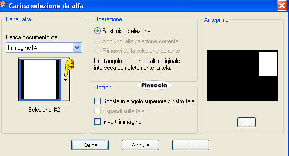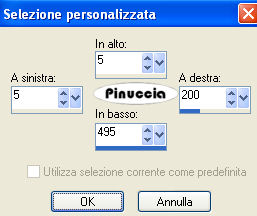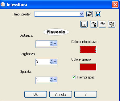 qui puoi trovare qualche risposta ai tuoi dubbi. Se l'argomento che ti interessa non è presente, ti prego di segnalarmelo. Questo tutorial è stato scritto con PSP X2, ma può essere eseguito anche con le altre versioni di PSP. Per tradurlo, l'ho eseguito con PSP X. Occorrente: Materiale qui I tubes che ho usato sono di Jet, Marif e Jeann. Rispetta il lavoro degli autori e mantieni inalterati i tubes. Filtro: Graphics Plus qui Metti la maschera 20-20.jpg nella cartella Maschere. Metti il motivo goldbeads.jpg nella cartella Motivi. Imposta il colore di primo piano con #c00000, e il colore di sfondo con il nero. Apri una nuova immagine trasparente 700 x 500 pixels, e riempila con il colore di primo piano.Livelli>Nuovo livello raster. Riempi con il colore nero.Livelli>Carica/Salva maschera>Carica maschera da disco. Cerca e carica la maschera 20.20.bmp: ![]() Livelli>Unisci>Unisci gruppo. Effetti>Effetti di trama>Intessitura, imposta colore intessitura e colore spazio con il colore di primo piano. ![]() Livelli>Nuovo livello raster. Attiva lo strumento Selezione , rettangolo, sfumatura 0,clicca sull'icona Selezione personalizzata ![]() e imposta i seguenti settaggi. ![]() Riempi la selezione con il nero.Mantieni selezionato. Livelli>Nuovo livello raster. Selezione>modifica>Contrai - 1 pixel. Riempi la selezione con il rosso.Selezione>Modifica>Contrai - 2 pixels. Premi sulla tastiera il tasto CANC ![]() Selezione>Modifica>Contrai - 1 pixel. Riempi la selezione con il nero.Selezione>Modifica>Contrai - 1 pixel. Premi sulla tastiera il tasto CANC. Selezione>Deseleziona. Livelli>Unisci>Unisci giù. Livelli>Duplica. Immagine>Rifletti. Livelli>Nuovo livello raster. Attiva lo strumento Selezione ,Selezione personalizzata ![]() ![]() Riempi la selezione con il rosso.Effetti>Plugins>Graphics Plus - Cross Shadow: ![]() Selezione>Modifica>Contrai - 2 pixels. Premi sulla tastiera il tasto CANC. Selezione>Deseleziona. Livelli>Duplica. Immagine>Rifletti. Livelli>Unisci>Unisci giù. Livelli>Duplica. Immagine>Capovolgi. Livelli>Unisci>Unisci giù. Attiva lo strumento Bacchetta magica , sfumatura e tolleranza 0,![]() Clicca nel riquadro superiore sinistro. Selezione>Carica/Salva selezione>Salva selezione su canale alfa. Puoi lasciare il nome che trovi: Selezione #1, clicca Salva. ![]() Selezione>Deseleziona. Seleziona il riquadro superiore destro. Selezione>Carica/Salva>Salva selezione su canale alfa. Selezione #2 - Salva. Selezione>Deseleziona. Clicca nel riquadro inferiore sinistro. Selezione>Carica/Salva selezione>Salva selezione su canale alfa. Selezione #3 - Salva. Selezione>Deseleziona. Clicca sul riquadro inferiore destro. Selezione>Carica/Salva selezione>Salva selezione su canale alfa. Selezione #4 - Salva. Selezione>Deseleziona. Attiva il livello Raster 2. Apri jet-leggs-hellokitty-februari-20081.psp, e vai a Modifica>Copia. Torna al tuo lavoro e vai a Modifica>Incolla come nuovo livello. Immagine>Ridimensiona, al 50%, tutti i livelli non selezionato. Regola>Messa a fuoco>Metti a fuoco. Sposta il tube nel riquadro superiore sinistro,in modo che rimanga una selezione piacevole all'interno della cornice rossa. ![]() Selezione>Carica/Salva selezione>Carica selezione da canale alfa. E' già presente Selezione #1. Devi soltanto cliccare Carica. ![]() Selezione>inverti. Premi sulla tastiera il tasto CANC. Selezione>Deseleziona. Attiva copia di Raster 2. Apri Jeann573.psp. Duplica il tube con shift+D. Immagine>Ridimensiona all'85%, tutti i livelli non selezionato. Selezione>Seleziona tutto. Selezione>Mobile. Selezione>Modifica>Sfuma - 15. ![]() Selezione>Inverti. Premi sulla tastiera il tasto CANC. Regola>Messa a fuoco>Metti a fuoco. Selezione>Deseleziona. Modifica>copia. Minimizza il tube, perchè ti servirà ancora. Torna al tuo lavoro e vai a Modifica>Incolla come nuovo livello. Sposta la donna nella cornice superiore destra,in modo che all'interno rimanga un bel ritaglio del suo viso. Selezione>Carica/Salva selezione>Carica selezione da canale alfa. Apri il menu cliccando sulla freccia a fianco del box, e seleziona Selezione#2 - Carica. ![]() Selezione>Inverti. Premi sulla tastiera il tasto CANC. Selezione>Deseleziona. Attiva il livello Raster 4 (il livello del tube nel primo riquadro a sinistra). Modifica>Incolla come nuovo livello (il tube della donna è ancora in memoria). Immagine>Rifletti. Sposta il tube nella cornice inferiore sinistra,lasciando visibile un'altra parte del corpo della donna. Selezione>Carica/Salva selezione>Carica selezione da canale alfa. Carica Selezione #3. Selezione>Inverti. Premi sulla tastiera il tasto CANC. Selezione>Deseleziona. Attiva il livello copia di Raster 2. Modifica>Incolla come nuovo livello (il tube della donna è ancora in memoria). Sposta il tube nella cornice inferiore destra,lasciando visibile un'altra parte del corpo della donna. Selezione>Carica/Salva selezione>Carica selezione da canale alfa. Carica Selezione #4. Selezione>Inverti. Premi sulla tastiera il tasto CANC. Selezione>Deseleziona. ![]() Attiva il livello Raster 4 (il livello del tube nel primo riquadro a sinistra). *** Livelli>Carica/Salva maschera>Carica maschera da disco. Cerca e carica la maschera 20-20.bmp, con i settaggi precedenti. Livelli>Unisci>Unisci gruppo. Regola>Messa a fuoco>Metti a fuoco. *** Attiva il livello della piccola immagine in alto a destra (Raster 5), e ripeti il passaggio da *** a ***. Ripeti il passaggio anche per i livelli 6 e 7. ![]() Attiva il livello gruppo Raster 2 (il livello della maschera). Apri jet-man1-april2007.psp, e vai a Modifica>Copia. Torna al tuo lavoro e vai a Modifica>Incolla come nuovo livello. Immagine>ridimensiona, all'80%, tutti i livelli non selezionato. Sposta il tube in alto vicino al bordo e un po' più a destra.Cambia la modalità di miscelatura di questo livello in Filtra, e abbassa l'opacità al 36%. Apri Marif_2007_11Novembre_misted_fleurs0169.psp, e vai a Modifica>Copia. Torna al tuo lavoro e vai a Modifica>Incolla come nuovo livello. Spos