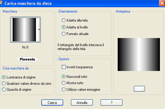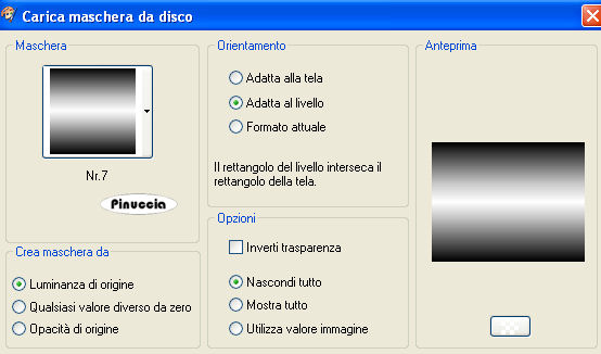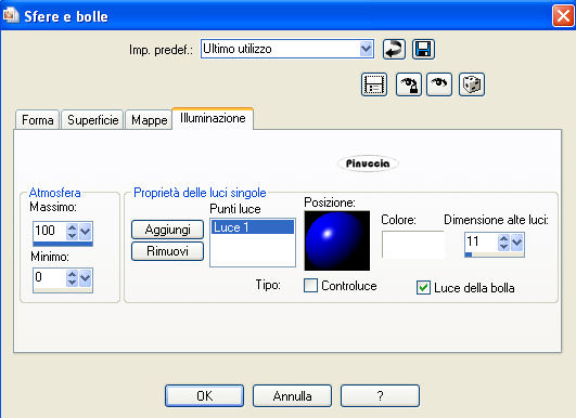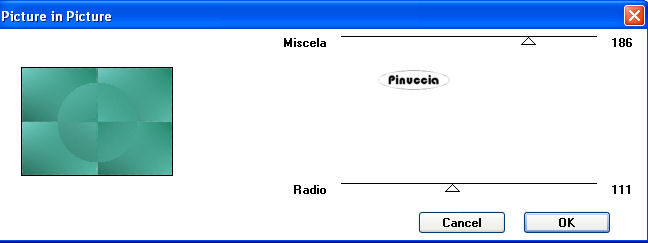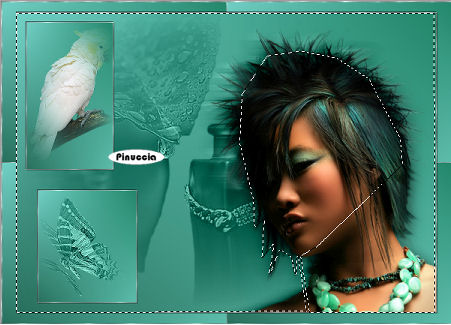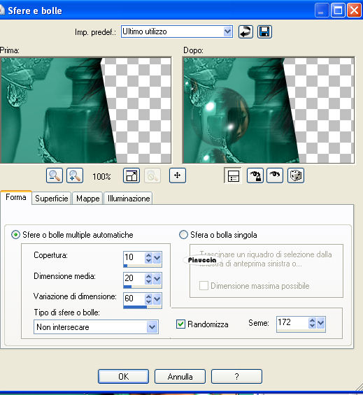 qui puoi trovare qualche risposta ai tuoi dubbi. Se l'argomento che ti interessa non è presente, ti prego di segnalarmelo. Questo tutorial è stato scritto con PSP X2, ma può essere eseguito anche con le altre versioni di PSP. Per tradurlo, l'ho eseguito con PSP X. Occorrente: Materiale qui I tubes che ho usato sono di ©nn, MTM(Brigitte) e SKF(Silke). Rispetta il lavoro degli autori e mantieni inalterati i tubes. Filtri: Italian Editors qui Metti le maschere nr.7 e nr.8 nella cartella Maschere. Metti il motivo Muster-silber nella cartella Motivi. Se lo apri e minimizzi nella tua area di lavoro, lo troverai nella lista dei motivi disponibili, quando ti servirà. Apri il file di sfondo hintergrundjade.jpg. Questa sarà la base del tuo lavoro. Apri SKF_Bottle259.07.psp. Immagine>Ridimensiona - 648 x 497 pixels. Modifica>Copia. Torna alla tua immagine di sfondo e vai a Modifica>Incolla come nuovo livello. Livelli>Carica/Salva maschera>Carica maschera da disco. Cerca e carica la maschera n.7: ![]() Livelli>Unisci>Unisci gruppo. Livelli>Carica/Salva maschera>Carica maschera da disco. Cerca e carica la maschera n.8: ![]() Livelli>Unisci>Unisci gruppo. Cambia la modalità di miscelatura di questo livello in Luminanza (esistente), e abbassa l'opacità al 95%. Apri Rahmen1.jpg. Livelli>Nuovo livello raster. Selezione>Seleziona tutto. Selezione>modifica>contrai - 1 pixel. Selezione>Inverti. Imposta il colore di primo piano su Motivi, april il menu cliccando sulla freccia a fianco del box, e seleziona il motivo argento Muster-Silber.jpg: ![]() Riempi il bordo con questo motivo.Selezione>Deseleziona. Apri Mtm_Dieren-86-vlinder-13 okt 2007.psp. Immagine>Ridimensiona - 290 x 207 pixels, tutti i livelli selezionato. Modifica>Copia. Torna alla piccola immagine e vai a Modifica>Incolla come nuovo livello. Posiziona il tube al centro.Livelli>Carica/Salva maschera>Carica maschera da disco. Carica nuovamente la maschera n.8, con i settaggi precedenti. Livelli>Unisci>Unisci gruppo. Ripeti ancora una volta. Cambia la modalità di miscelatura di questo livello in Luminanza (esistente). Effetti>Effetti di bordo>Aumenta. Livelli>Unisci>Unisci tutto. Modifica>Copia. Torna al tuo lavoro e vai a Modifica>Incolla come nuovo livello. Sposta l'immagine in basso a sinistra.![]() Effetti>Effetti 3D>Sfalsa ombra, con i seguenti settaggi, colore nero. ![]() Ripeti l'Effetto Sfalsa ombra, cambiando verticale e orizzontale con -1. Apri Rahmen2.jpg. Livelli>Nuovo livello raster. Selezione>Seleziona tutto. Selezione>modifica>contrai - 1 pixel. Selezione>Inverti. Riempi la selezione con il motivo argento.Selezione>Deseleziona. Apri @nn_300907_dieren_209_cacatuasulphurea_tdstudio1.psp. Immagine>Ridimensiona - 150 x 232 pixels. Modifica>Copia. Torna alla piccola immagine e vai a Modifica>Incolla come nuovo livello. Livelli>Disponi>Sposta giù. Immagine>Rifletti. Livelli>Carica/Salva maschera>Carica maschera da disco. Cerca e carica la maschera n.7, con i settaggi precedenti. Livelli>Unisci>Unisci gruppo. Livelli>Carica/Salva maschera>Carica maschera da disco. Cerca e carica la maschera n.8, con i settaggi precedenti. Livelli>Unisci>Unisci gruppo. Regola>Messa a fuoco>Metti a fuoco. Sistema l'uccello adeguatamente.Livelli>Duplica. Livelli>Unisci>Unisci tutto. Modifica>Copia. Torna al tuo lavoro, e vai a Modifica>Incolla come nuovo livello. Sposta l'immagine in alto a sinistra.![]() Effetti>Effetti 3D>Sfalsa ombra, con i settaggi precedenti. Ripeti l'Effetto Sfalsa ombra, cambiando verticale e orizzontale con -1. Apri @nn_130807_face_162_womanshorthair1_tdstudio_small1.psp, e vai a Modifica>Copia. Torna al tuo lavoro e vai a Modifica>Incolla come nuovo livello. Spostalo nell'angolo in basso a destra.Livelli>Duplica. Livelli>Disponi>Sposta giù. Effetti>Effetti di distorsione>Vento. ![]() Cambia la modalità di miscelatura di questo livello in Luminanza (esistente). Attiva il livello superiore. Effetti>Effetti 3D>Sfalsa ombra, con i seguenti settaggi, colore nero: ![]() Livelli>Nuovo livello raster. Selezione>Seleziona tutto. Selezione>Modifica>Contrai - 1 pixel. Selezione>Inverti. Riempi la selezione con il motivo argento.Selezione>Deseleziona. Livelli>Unisci>Unisci tutto. Metti da parte questa immagine per il momento. Apri una nuova immagine trasparente 750 x 536 pixels. Selezione>Seleziona tutto. Apri nuovamente Hintergrund.jpg e vai a Modifica>Copia. Torna all'immagine più grande e vai a Modifica>Incolla nella selezione. Livelli>Nuovo livello raster. Selezione>Seleziona tutto. Selezione>Modifica>Contrai - 1 pixel. Selezione>Inverti. Riempi la selezione con il motivo argento.Selezione>Deseleziona. Livelli>Unisci>Unisci giù. Effetti>Plugins>Italian Editors - Picture in Picture, con i settaggi standard. ![]() se nella lista del filtro non trovi questo effetto, vedi la spiegazione nella scheda relativa alla pagina dei filtri. Dopo l'applicazione del filtro la cornice argento sarà un po' sgranata. Aggiungi un nuovo bordo da 1 pixel e riempilo con il motivo argento: Livelli>Nuovo livello raster. Selezione>Seleziona tutto. Selezione>Modifica>Contrai - 1 pixel. Selezione>Inverti. Riempi la selezione con il motivo argento.Selezione>Deseleziona. Livelli>Unisci>Unisci giù. Attiva l'immagine che hai messo da parte prima e vai a Modifica>Copia. Torna a quest'ultimo lavoro (750x536) e vai a Modifica>Incolla come nuovo livello. ![]() Effetti>Effetti 3D>sfalsa ombra, con i seguenti settaggi, colore nero: ![]() Ripeti l'Effetto Sfalsa ombra, ma cambiando verticale e orizzontale con -1. Livelli>Unisci>Unisci tutto. ![]() Per realizzare l'effetto bolle, dovrai selezionare il viso della donna in modo che la cornice e l'immagine di sfondo rimangano fuori. Livelli>Duplica. Attiva lo strumento Selezione a mano libera e seleziona tutta l'area esterna al viso e interna alle cornici.![]() Effetti>Effetti artistici>Sfere e bolle: Imposta Forma con i seguenti settaggi, Selezionando Randomizza, l'effetto finale sarà casuale e, quindi non sarà ugual