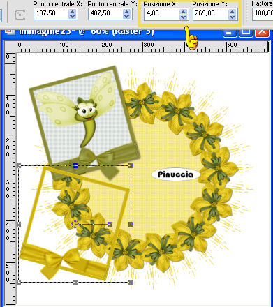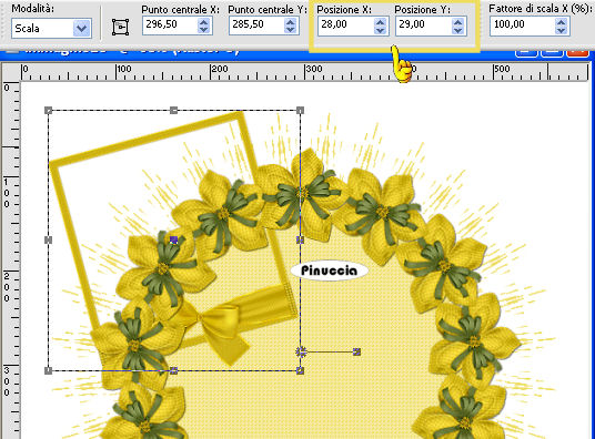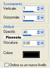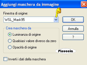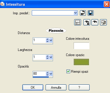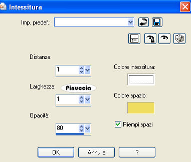 qui puoi trovare qualche risposta ai tuoi dubbi. Se l'argomento che ti interessa non è presente, ti prego di segnalarmelo. Questo tutorial è stato scritto con PSP X2, ma può essere eseguito anche con le altre versioni di PSP. Per tradurlo, l'ho eseguito con PSP X. Occorrente: Materiale qui Il tube principale è di Lelanie, con ©Jessica Finson. Grazie Jessica per il permesso. Il tube è di Lelanie e il tube Diamonds è di Biene. Rispetta il lavoro degli autori, mantieni inalterati i tubes e non cancellare il livello del copyright. Filtri: Mura's Meister qui Apri WSL_Mask95.jpg e minizzala nella tua area di lavoro. Imposta il colore di primo piano con #efdd60, e il colore di sfondo con il bianco (#ffffff). Apri una nuova immagine trasparente 600 x 600 pixels, e riempila con il bianco.Livelli>Nuovo livello raster. Riempi con il colore di primo piano.Livelli>Nuovo livello maschera>Da immagine. Apri il menu sotto la finestra di origine e vedrai i files aperti. Seleziona la maschera WSL_Mask95.jpg con i seguenti settaggi: ![]() Livelli>Unisci>Unisci gruppo. Apri MSG - Flowers - Flower 5.png e vai a Modifica>Copia. Torna al tuo lavoro e vai a Modifica>Incolla come nuovo livello. Immagine>Ridimensiona, al 35%, tutti i livelli non selezionato. Effetti>Plugins>Mura's Meister - Copies, con i seguenti settaggi: ![]() Regola>Messa a fuoco>Metti a fuoco. ![]() Effetti>Effetti 3D>sfalsa ombra, con i seguenti settaggi, colore nero: ![]() Attiva lo strumento Bacchetta magica , tolleranza 15, sfumatura 0,e clicca al centro della maschera. ![]() Attiva il livello sottostante (il livello gruppo maschera). Effetti>Effetti di trama>Intessitura, con i seguenti settaggi, imposta come colore spazio il colore di primo piano. ![]() Selezione>Deseleziona. Apri MSG - Flowers - frame 5.png e vai a Modifica>Copia. Torna al tuo lavoro e vai a Modifica>Incolla come nuovo livello. Immagine>Ridimensiona, al 50%, tutti i livelli non selezionato. Immagine>Ruota per gradi - 15 gradi a sinistra: ![]() Regola>Messa a fuoco>Metti a fuoco. Sposta la cornice in alto a sinistra.La mia posizione: Pos.x: 28,00 Pos.y: 29,00 attivando lo strumento Puntatore nella barra superiore potrai controllare la posizione del tube.![]() Livelli>Duplica e nascondi il livello della prima cornice. Regola>Tonalità e saturazione>Tonalità/Saturazione>Luminosità: ![]() Attiva lo strumento Bacchetta magica , sfumatura e tolleranza 0![]() Clicca al centro della cornice e nel piccolo foro sotto il fiocco. ![]() Selezione>Modifica>Espandi - 4 pixels. Livelli>Nuovo livello raster. Riempi con il bianco - non dimenticare il piccolo foro.Effetti>Effetti di trama>Intessitura, con i settaggi precedenti, ma cambia il colore spazio con #889a2e. ![]() Selezione>Deseleziona. Apri MSG - Flowers - dragonfly 2.png e vai a Modifica>Copia. Torna al tuo lavoro e vai a Modifica>Incolla come nuovo livello. Immagine>Ridimensiona, al 70%, tutti i livelli non selezionato. Immagine>ruota per gradi - 15 gradi a sinistra: ![]() Posiziona il tube nella cornice.Livelli>Unisci>Unisci giù. Immagine>Disponi>Sposta giù. Attiva il livello superiore. Livelli>Unisci>Unisci giù. Effetti>Effetti 3D>sfalsa ombra, con i seguenti settaggi, colore nero. ![]() Apri il il livello della cornice che hai chiuso prima e attivalo. Livelli>Disponi>Porta in alto. Immagine>Rifletti. Sposta la cornice in basso a sinistra.La mia posizione: Pos.x: 4,00 Pos.y: 269,00 ![]() Attiva lo strumento Bacchetta magica , sfumatura e tolleranza 0,e clicca al centro della cornice, senza dimenticare il foro sotto il fiocco. ![]() Selezione>Modifica>Espandi - 4 pixels. Livelli>Nuovo livello raster. Riempi con il colore bianco - non dimenticare il piccolo foro.Effetti>Effetti di trama>Intessitura, con gli stessi settaggi, ma con il colore spazio nuovamente impostato con il colore di primo piano. ![]() Selezione>Deseleziona. ![]() Apri MSG - Flowers - butterfly babe.png e vai a Modifica>copia. Torna al tuo lavoro e vai a Modifica>Incolla come nuovo livello. Immagine>Ridimensiona, al 65%, tutti i livelli non selezionato. Immagine>ruota per gradi - 15 gradi a destra: ![]() Posiziona il tube nella cornice.Livelli>Unisci>Unisci giù. Livelli>Disponi>Sposta giù. Attiva il livello superiore (la cornice gialla). Livelli>Unisci>Unisci giù. Effetti>Effetti 3D>sfalsa ombra, con i settaggi precedenti. ![]() Apri MSG - Flowers - fastener.png e vai a Modifica>Copia. Torna al tuo lavoro e vai a Modifica>Incolla come nuovo livello. Immagine>Rifletti. Immagine>ridimensiona, al 65%, tutti i livelli non selezionato. Attiva lo strumento Puntatore ![]() passando il mouse sull'immagine, quando vedrai l'icona dello strumento spostamento ![]() potrai spostare il tube; quando vedrai le due parentesi rotonde: ![]() potrai ruotare il tube; usando lo spostamento sistema il tube tra le due cornici: ![]() Effetti>Effetti 3D>sfalsa ombra, con i seguenti settaggi, colore nero: ![]() Apri MSG - Flowers - journal .png e vai a Modifica>copia. Torna al tuo lavoro e vai a Modifica>incolla come nuovo livello. Immagine>Ridimensiona, all'80%, tutti i livelli non selezionato. Immagine>Ruota per gradi - 15 gradi a destra: ![]() Sposta il tube nell'angolo in basso a destra.Regola>Messa a fuoco>Metti a fuoco. Effetti>Effetti 3D>sfalsa ombra, con i seguenti settaggi, colore nero: ![]() Se vuoi, puoi scrivere qualcosa sul foglio. Per il mio testo ho usato il font Bradley hand, dimensione 20. Quando hai scritto, puoi ruotare il testo con il puntatore nella stessa misura del foglio, in modo da allinearlo alle righe.Se vuoi, puoi saltare questo passaggio per il momento, e aggiungere il testo una volta che avrai posizionato tutti i tubes. In questo modo, saprai esattamente quale sarà lo spazio disponibile sul foglio. Apri MSG - Flowers - Bow 5.png e vai a Modifica>Copia. Torna al tuo lavoro e vai a Modifica>Incolla come nuovo livello. Immagine>Ridimensiona, al 75%, tutti i livelli non selezionato. Sposta il fiocco nell'angolo in alto a destra.Con il puntatore 