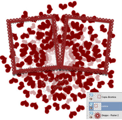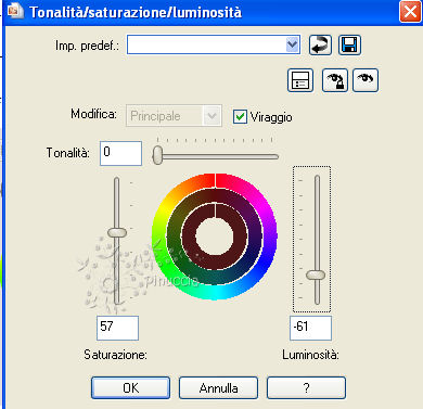 qui puoi trovare qualche risposta ai tuoi dubbi. Se l'argomento che ti interessa non è presente, ti prego di segnalarmelo. Questo tutorial è stato scritto con PSP X2, ma può essere eseguito anche con le altre versioni di PSP. Per tradurlo, ho usato PSP X. ©Biene - tutti i diritti riservati. Il © della traduzione è mio. Occorrente: A scelta il tube di una donna. Il resto del materiale qui Per il mio esempio ho usato tubes di Dina Irwin. lo scrapset usato nel tutorial originale è "A Victorian Love Affair" di http://candykissesdesignz.blogspot.com/"Candy Kisses Designz, ed è a pagamento e non l'ho usato per la traduzione. Tuttavia, se intendi usare questo scrapset, trovi ugualmente la traduzione della parte che lo riguarda. Se vuoi usare tuo materiale, salta il passaggio. In sostituzione di questo scrap ho usato elementi dello scrapset Color of the time di http://muriel1326.canalblog.com/Muriel1326 e http://trinicatscrea.blogspot.com/Trinity e dello scrapkit Heavy Pink della serie Mysterious Scrapgirl di Azyzam La cornice fa parte di uno scrap di Melissa (nello zip trovi i suoi termini d'uso). La maschera è di Vix Un ringraziamento ai creatori di tubes dei vari gruppi cui appartengo. Il watermark di ognuno è inserito nei tubes. Per favore, rispetta il lavoro degli autori: non cambiare il nome del file e non rimuovere il watermark. Il © appartiene agli artisti originali. ![]() Imposta il colore di primo piano con #800000, e il colore di sfondo con il bianco. Apri una nuova immagine trasparente 600 x 600 pixels, e riempila con il colore bianco.Livelli>Nuovo livello raster. Riempi con il colore di primo piano.Livelli>Carica/Salva maschera>Carica maschera da disco. Cerca e carica la maschera Vix_Mask176.jpg: ![]() Livelli>Unisci>Unisci gruppo. Effetti>Effetti di bordo>Aumenta. Immagine>Ridimensiona, al 110%, tutti i livelli non selezionato. Apri SE_BentPhoto_3.pspimage e vai a Modifica>copia. Torna al tuo lavoro e vai a Modifica>Incolla come nuovo livello. Regola>Tonalità e Saturazione>Tonalità/Saturazione/Luminosità: ![]() Immagine>Ridimensiona, al 75%, tutti i livelli non selezionato. Sposta la cornice in alto a sinistra, pressappoco come nel mio esempio.Rinomina questo livello "Cornice". Livelli>Duplica. Immagine>Rifletti. Attiva nuovamente il livello "cornice". Attiva lo strumento Bacchetta magica , sfumatura e tolleranza 0,e clicca al centro della cornice per selezionarla. ![]() Selezione>Modifica>Espandi - 5 pixels. Livelli>Nuovo livello raster. Riempi con il colore nero.Rinomina questo livello "viso". Selezione>Carica/Salva selezione>Salva selezione su canale alfa. Puoi lasciare il nome di default Selezione#1, e clicca Salva. ![]() Selezione>Deseleziona. Livelli>Disponi>Sposta giù. Livelli>Duplica. Immagine>Rifletti. Attiva nuovamente il livello "viso". Apri il tuo tube. Puoi copiare l'intero tube o una selezione del viso. Modifica>Copia. Torna al tuo lavoro e vai a Modifica>Incolla come nuovo livello. Posiziona l'immagine nell'area della cornice.Selezione>Carica/Salva selezione>Carica selezione da canale alfa. Troverai la selezione che hai salvato prima. Devi soltanto cliccare Carica. ![]() Selezione>Inverti. Premi sulla tastiera il tasto CANC. Selezione>Deseleziona. Abbassa l'opacità di questo livello al 45%. Livelli>Duplica. Immagine>Rifletti. Livelli>Disponi>Sposta giù. Attiva nuovamente il livello superiore. ![]() quanto segue si riferisce alle istruzioni per l'uso dello scrapkit a pagamento. Dallo scrapkit apri redrose.png e vai a Modifica>Copia. Torna al tuo lavoro e vai a Modifica>Incolla come nuovo livello. Immagine>Ridimensiona, al 30%, tutti i livelli non selezionato. Regola>Messa a fuoco>Metti a fuoco. Sposta la rosa sul bordo destro della cornice.Effetti>Effetti 3D>sfalsa ombra, con i seguenti settaggi, colore nero. ![]() Livelli>Duplica. Immagine>Ruota per gradi - 30 gradi a destra: ![]() Attiva il livello sottostante. Dallo scrapkit apri blackrose.png vai a Modifica>Copia. Torna al tuo lavoro e vai a Modifica>Incolla come nuovo livello. Immagine>Ridimensiona, al 30%, tutti i livelli non selezionato. Immagine>Ruota per gradi - 30 gradi a sinistra: ![]() Regola>Messa a fuoco>Metti a fuoco. Effetti>Effetti 3D>sfalsa ombra, con i settaggi precedenti. Sposta questo fiore a destra sull'altra rosa.Livelli>Duplica. Immagine>Rifletti. Attiva nuovamente il livello superiore. Se necessario, correggi le posizioni dei fiori per sistemarli meglio. Apri flowerbow.png. vai a Modifica>Copia. Torna al tuo lavoro e vai a Modifica>Incolla come nuovo livello. Immagine>Ridimensiona, al 35%, tutti i livelli non selezionato. Regola>Messa a fuoco>Metti a fuoco. Spostalo in basso a sinistra.Effetti>Effetti 3D>sfalsa ombra, con i settaggi precedenti. ![]() Dallo scrapkit apri mask.png vai a Modifica>Copia. Torna al tuo lavoro e vai a Modifica>Incolla come nuovo livello. Immagine>Ridimensiona, al 45%, tutti i livelli non selezionato. Regola>Messa a fuoco>Metti a fuoco. Sposta il tube in basso a sinistra.Effetti>Effetti 3D>sfalsa ombra, con i settaggi precedenti. ![]() Dallo scrapkit apri butterfly.png e vai a Modifica>Copia. Torna al tuo lavoro e vai a Modifica>Incolla come nuovo livello. Immagine>Ridimensiona, al 45%, tutti i livelli non selezionato. Regola>Messa a fuoco>Metti a fuoco. Immagine>Rifletti. Sposta la farfalla in alto a sinistra della cornice.Effetti>Effetti 3D>sfalsa ombra, con i seguenti settaggi, colore nero. Dallo scrapkit apri butterfly2.png e vai a Modifica>Copia. Torna al tuo lavoro e vai a Modifica>Incolla come nuovo livello. Immagine>Ridimensiona, al 45%, tutti i livelli non selezionato. Regola>Messa a fuoco>Metti a fuoco. Sposta la farfalla in alto a destra della cornice.Effetti>Effetti 3D>sfalsa ombra, con i settaggi precedenti. ![]() Se vuoi, puoi aggiungere altre farfalle. ![]() Apri il tube della donna e vai a Modifica>Copia. Torna al tuo lavoro e vai a Modifica>Incolla come nuovo livello. Posiziona il tube al centro tra le cornici.Effetti>Effetti 3D>Sfals