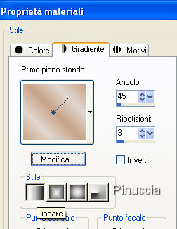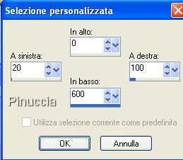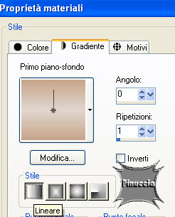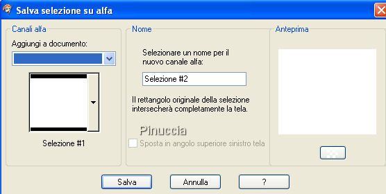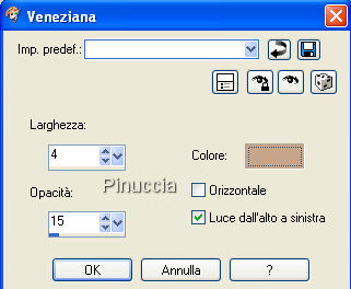 qui puoi trovare qualche risposta ai tuoi dubbi. Se l'argomento che ti interessa non è presente, ti prego di segnalarmelo. Questo tutorial è stato scritto con PSP X2, ma può essere eseguito anche con le altre versioni di PSP. Per tradurlo, l'ho eseguito con PSP X. Occorrente: Materiale qui Per qusto tutorial ho usato due tube e una selezione di Jet. Rispetta il lavoro degli autori e mantieni inalterati i tubes. Filtri: Graphics Plus qui Metti la selezione Jet-sel1.PspSelection nella cartella Selezioni. Imposta il colore di primo piano con #c7a58a, e il colore di sfondo con #e1d6cf. Passa il colore di primo piano a Gradiente di primo piano/sfondo, con i seguenti settaggi: ![]() Apri una nuova immagine trasparente 484 x 424 pixels, e riempila con il gradiente.Regola>Sfocatura>Sfocatura gaussiana, raggio 15. ![]() Selezione>Seleziona tutto. Seleziona>Carica/Salva selezione>Salva selezione su canale alfa. Assegna un nome alla selezione (puoi anche lasciare quello che trovi). Salva. ![]() Selezione>Deseleziona. Apri il tube jet-flower2-januari-20081.psp, e vai a Modifica>Copia. Torna al tuo lavoro e vai a Modifica>Incolla come nuovo livello. Immagine>Rifletti. Il fiore dovrebbe essere al posto giusto. Guarda il mio esempio per controllare la posizione. ![]() Selezione>Carica/Salva selezione>Carica selezione da canale alfa. E' già presente la selezione che hai salvato prima. Devi soltanto cliccare Carica. ![]() Selezione>Inverti. Premi sulla tastiera il tasto CANC ![]() Selezione>Deseleziona. Cambia la modalità di miscelatura di questo livello in Luminanza (esistente), e abbassa l'opacità al 40%. Apri il tube jet-woman23-januari-20081.pspimage, e vai a Modifica>Copia. Torna al tuo lavoro e vai a Modifica>Incolla come nuovo livello. Immagine>Ridimensiona, all'80%, tutti i livelli non selezionato. Livelli>Duplica. Attiva il livello originale del tube. Effetti>Effetti di distorsione>Vento - da destra, intensità 80: ![]() Abbassa l'opacità di questo livello al 65%. Attiva il livello superiore (la copia del tube). Effetti>Effetti 3D>Sfalsa ombra, con i seguenti settaggi. ![]() Livelli>Nuovo livello raster. Selezione>Seleziona tutto. Immagine>Dimensioni tela - 486 x 426, mantieni proporzioni selezionato: ![]() Selezione>Inverti. Riporta il colore di primo piano a Colore e riempi la selezione con il colore di primo piano.Effetti>Plugins>Graphics Plus - Cross Shadow, con i settaggi standard. ![]() Selezione>Seleziona tutto. Livelli>Nuovo livello raster. Immagine>Dimensione tela - 490 x 430 pixels. Selezione>Inverti. Riporta il colore di primo piano a Gradiente e cambia i settaggi: ![]() Riempi la selezione con il gradiente.Selezione>Seleziona tutto. Immagine>Dimensione tela - 492 x 432 pixels. Selezione>Inverti. Riempi la selezione con il colore di primo piano.ricordati di reimpostare da Gradiente a Colore Effetti>Plugins>Graphics Plus - Cross Shadow, con i settaggi standard. Selezione>Seleziona tutto. Selezione>Carica/Salva selezione>Salva selezione su canale alfa. Assegna un nome alla selezione (ma puoi lasciare quello che vedi), e clicca Salva. ![]() Immagine>Dimensioni tela - 800 x 600 pixels. Selezione>Inverti. Livelli>Nuovo livello raster. Riempi la selezione con il gradiente.Selezione>Deseleziona. Livelli>Disponi>Porta sotto. Livelli>Nuovo livello raster. Selezione>Carica/Salva selezione>Carica selezione da disco. Cerca e carica la selezione Jet-sel1.PspSelection. ![]() Riempi la selezione con il colore di primo piano.Selezione>Deseleziona. Livelli>Duplica. Immagine>Rifletti. Livelli>Unisci>Unisci giù. Effetti>Effetti di bordo>Erodi. Cambia la modalità di miscelatura di questo livello in Moltiplica, e abbassa l'opacità al 10%. Livelli>Duplica. Immagine>Capovolgi. Attiva il livello di copia di Raster 3. Selezione>Carica/Salva selezione>Carica selezione da canale alfa. Seleziona la Selezione #2 che hai salvato prima e Carica. Selezione>inverti. Premi sulla tastiera il tasto CANC. Attiva il livello superiore. Livelli>Nuovo livello raster. Attiva lo strumento Selezione , rettangolo, sfumatura 0,clicca sull'icona Selezione personalizzata ![]() e imposta i seguenti settaggi: ![]() Riempi la selezione con il colore di primo piano.Effetti>Plugins>Graphics Plus - Cross Shadow, con i settaggi standard. Selezione>modifica>Contrai di 1 pixel. Premi sulla tastiera il tasto canc. Mantieni selezionato. Livelli>Nuovo livello raster. Riempi la selezione con il gradiente.Selezione>Deseleziona. Effetti>Effetti di trama>Veneziana, con i seguenti settaggi, colore di primo piano. ![]() Livelli>Unisci>Unisci giù. Effetti>Effetti 3D>Sfalsa ombra, con i seguenti settaggi, colore nero. ![]() Livelli>Duplica. Immagine>Rifletti. Livelli>Unisci>Unisci giù. Apri accents_Dani05.psp. Posizionati sul livello Ebene 3 e vai a Modifica>Copia. Torna al tuo lavoro e vai a Modifica>Incolla come nuovo livello. Immagine>Ruota per gradi - 90 gradi a destra, tutti i livelli non selezionato. ![]() Posiziona questo livello sulla striscia a sinistra,contro il bordo e al centro. Livelli>Duplica. Sposta questo livello in basso, usando le frecce della tastiera per fare in modo che i due livelli siano perfettamente allineati.sull'uso delle frecce applicato allo strumento spostamento vedi qui Livelli>Duplica, e ripeti in modo che tutta la striscia sia coperta. Livelli>Unisci>Unisci giù. Ripeti Livelli>Unisci>Unisci giù e la striscia sarà in un unico livello. Effetti>Effetti 3D>Sfalsa ombra, con i seguenti settaggi, colore nero. ![]() Effetti>Effetti di bordo>Aumenta. Livelli>Duplica. Immagine>Rifletti. Adesso dovresti attivare il livello sotto Raster 1, ma così facendo non vedresti il tube che stai per aggiungere. Quindi questo passaggio lo farai dopo. Attiva nuovamente accents_Dani05.psp. Posizionati sul livello Ebene 4 e vai a Modifica>Copia. Torna al tuo lavoro e vai a Modifica>Incolla come nuovo livello. Sposta la decorazione in al centro,in modo che sia visibile soltanto la parte superiore. ![]() Cambia la modalità di mis
