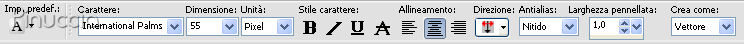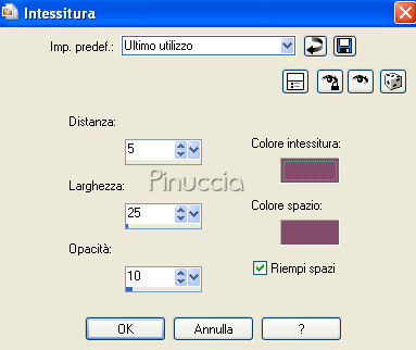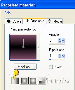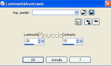 qui puoi trovare qualche risposta ai tuoi dubbi. Se l'argomento che ti interessa non è presente, ti prego di segnalarmelo. Questo tutorial è stato scritto con PSP X2, ma può essere eseguito anche con le altre versioni di PSP. Per tradurlo, l'ho eseguito con PSP X. Occorrente: Materiale qui Il tube Face è di Micki, il tube del profumo è di Jet, il tube del fiore è di Nightangel. Ho anche usato un elemento scrap di Scrappy Expressions. Nello zip trovi i termini d'uso di Melissa. Rispetta il lavoro degli autori e mantieni inalterati i tubes. Filtri: Graphics Plus qui Imposta il colore di primo piano con #814d6b, e il colore di sfondo con il nero (#000000). Passa il colore di primo piano a Gradiente di primo piano/sfondo, con i seguenti settaggi. ![]() Apri una nuova immagine trasparente 700 x 500 pixels, e riempila con il gradiente.Regola>Sfocatura>Sfocatura gaussiana, raggio 15. ![]() Apri il tube In_purple_Shades_na_17.02.2007.psp, e vai a Modifica>Copia. Torna al tuo lavoro e vai a Modifica>Incolla come nuovo livello. Immagine>Ruota per gradi - 90 gradi a sinistra, tutti i livelli non selezionato. ![]() Sposta questo tube in basso contro il bordo destro.Livelli>Carica/Salva maschera>Carica maschera da disco. Cerca e carica la maschera 20-20.bmp: ![]() Livelli>Unisci>Unisci gruppo. Cambia la modalità di miscelatura di questo livello in Luminanza, e abbassa l'opacità al 40%. Effetti>Effetti di bordo>Aumenta. Apri il tube HD_face12.psp, e vai a Modifica>Copia. Torna al tuo lavoro e vai a Modifica>Incolla come nuovo livello. Sposta questo tube a sinistra, contro il bordo.Livelli>Carica/Salva maschera>Carica maschera da disco. Carica nuovamente la maschera 20-20 con i settaggi precedenti: ![]() Livelli>Unisci>Unisci gruppo. Apri il tube jet-parfum-mei-20071.pspimage, e vai a Modifica>Copia. Torna al tuo lavoro e vai a Modifica>Incolla come nuovo livello. Immagine>Rifletti. Immagine>Ridimensiona, all'85%, tutti i livelli non selezionato. Sposta il flacone a destra contro il bordo.Cambia la modalità di miscelatura di questo livello in Luminanza, e abbassa l'opacità al 35%. Apri SE_Glitter_04.pspimage, e vai a Modifica>Copia. Torna al tuo lavoro e vai a Modifica>Incolla come nuovo livello. Immagine>Rifletti. Immagine>Capovolgi. Sposta il glitter nell'angolo in basso a sinistra.Regola>Luminosità e contrasto: ![]() Livelli>Unisci>Unisci tutto. Immagine>Aggiungi bordatura, 1 pixel, simmetriche, con il colore nero. Selezione>Seleziona tutto. Immagine>Aggiungi bordatura, 10 pixels, simmetriche, con il colore di primo piano. Selezione>Inverti. Effetti>Plugins>Graphics Plus - Cross Shadow, con i settaggi standard. ![]() Effetti>Effetti di trama>Veneziana: ![]() Selezione>Deseleziona. Immagine>Aggiungi bordatura, 1 pixel, simmetriche, con il colore nero. Selezione>Seleziona tutto. Immagine>Aggiungi bordatura, 3 pixels, simmetriche, con il colore di primo piano. Selezione>Inverti. Effetti>Effetti di trama>Intessitura: ![]() Selezione>Deseleziona. Immagine>Aggiungi bordatura, 1 pixel, simmetriche, con il colore nero. Selezione>Seleziona tutto. Immagine>Aggiungi bordatura, 10 pixels, simmetriche, con il colore di primo piano. Selezione>Inverti. Effetti>Plugins>Graphics Plus - Cross Shadow, con i settaggi standard. Selezione>Deseleziona. Immagine>Aggiungi bordatura, 1 pixel, simmetriche, con il colore nero. Selezione>Seleziona tutto. Immagine>Aggiungi bordatura, 3 pixels, simmetriche, con il colore di primo piano. Selezione>Inverti. Effetti>Effetti di trama>Intessitura, con i settaggi precedenti. Selezione>Deseleziona. Immagine>Aggiungi bordatura, 1 pixel, simmetriche, con il colore nero. Selezione>Seleziona tutto. Immagine>Aggiungi bordatura, 18 pixels, simmetriche, con il colore di primo piano. Selezione>Inverti. Effetti>Plugins>Graphics Plus - Cross Shadow, con i settaggi standard. Effetti>Effetti di trama>Veneziana, con i settaggi precedenti. Selezione>Deseleziona. Selezione>Seleziona tutto. Selezione>Modifica>Contrai, di 50 pixels. Effetti>Effetti 3D>Ritaglio: ![]() Ripeti l'Effetto Ritaglio ma cambiando verticale e orizzontale con -3. Selezione>Deseleziona. Attiva lo strumento Testo , e scegli un font.Io ho usato il font International Palms con i seguenti settaggi: ![]() Inverti i colori nella paletta dei materiali: ![]() Scrivi il tuo testo. Immagine>Ruota per gradi - 90 gradi a sinistra, tutti i livelli non selezionato. Posiziona il testo sul flacone di profumo. Livelli>Converti in livello raster. Effetti>Plugins>Graphics Plus - Cross Shadow, con i settaggi standard. Immagine>Aggiungi bordatura, 1 pixel, simmetriche, con il colore nero. Aggiungi il tuo nome e/o il tuo watermark. Livelli>Unisci>Unisci tutto e salva in formato jpg. ![]() Se hai problemi o dubbi, o trovi un link non funzionante, o anche soltanto per un saluto, scrivimi 13 Febbraio 2008 |
