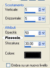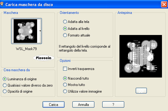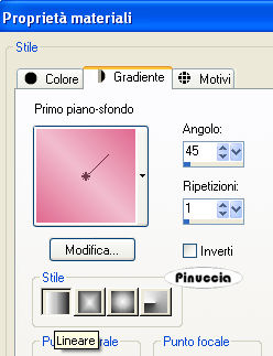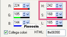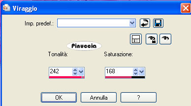qui puoi trovare qualche risposta ai tuoi dubbi. Se l'argomento che ti interessa non è presente, ti prego di segnalarmelo. Questo tutorial è stato scritto con PSP X2, ma può essere eseguito anche con le altre versioni di PSP. Per tradurlo, l'ho eseguito con PSP X. Occorrente: Un tube a scelta. Il resto del materiale qui Il tube che ho usato è di Lori Rhae. La maschera è di WSL Il materiale scrap è di Scrapkit Jasmine's Princess (nello zip trovi i suoi Termini d'uso). Ho usato anche elementi scrap dallo Scrapkit Sexy Cute di http://simplysensationalscraps.blogspot.comSimplySensationalScraps. Rispetta il lavoro degli autori, non cambiare i nomi dei files e non cancellare il livello del watermark. Metti la maschera WSL_Mask79.jpg nella cartella Maschere. Apri una nuova immagine trasparente 600 x 600 pixels, e riempila con il bianco.Scegli dal tuo tube un colore scuro e impostalo come colore di primo piano. Il mio #e06990. Come colore di sfondo scegli un colore della stessa tonalità. Il mio #f1bdce. Livelli>Nuovo livello raster. Riempi con il colore di primo piano.Livelli>Carica/Salva maschera>Carica maschera da disco. Cerca e carica la maschera WSL_Mask79.jpg. ![]() Livelli>Unisci>Unisci gruppo. Regola>Messa a fuoco>Accentua messa a fuoco. Apri jbs2_jp_glitter frame 1.png e vai a Modifica>Copia. Torna al tuo lavoro e vai a Modifica>Incolla come nuovo livello. Immagine>Ridimensiona, al 60%, tutti i livelli non selezionato. Regola>Messa a fuoco>Metti a fuoco. Sposta la cornice in alto a sinistra.![]() Passa il colore di primo piano a Gradiente di primo piano/sfondo, con i seguenti settaggi: ![]() Attiva lo strumento Bacchetta magica , sfumatura e tolleranza 0![]() Clicca all'interno delle tre cornici. Selezione>Modifica>Espandi - 2 pixels. Livelli>Nuovo livello raster. Riempi la selezione con il gradiente.Selezione>Deseleziona. Livelli>Disponi>Sposta giù. Attiva il tuo tube e vai a Modifica>Copia. Torna al tuo lavoro e vai a Modifica>Incolla come nuovo livello. Posiziona il tube sulla prima cornice a sinistra,in modo che all'interno di questa rimanga la parte del tube che vuoi lasciare visibile. Attiva il livello delle cornici. Clicca con la bacchetta magica sulla prima cornice per selezionarla.![]() Selezione>Modifica>Espandi - 2 pixels. Selezione>Inverti. Attiva il livello del tube e premi sulla tastiera il tasto CANC ![]() Ripeti la stessa procedura per le altre due cornici. Gioca con le modalità di miscelatura dei tre livelli. Nel mio esempio ho abbassato l'opacità della prima al 50%, ho cambiato la modalità di miscelatura della seconda in Filtra, e la modalità di miscelatura della terza in Schiarisci. ![]() Chiudi i due livelli inferiori e posizionati su uno dei livelli visibili. Livelli>Unisci>Unisci visibile. Riapri i livelli inferiori e attiva il livello superiore. Effetti>Effetti 3D>Sfalsa ombra, con i seguenti settaggi, colore nero: ![]() Apri jbs2_jp_flower 1.png e vai a Modifica>Copia. Torna al tuo lavoro e vai a Modifica>Incolla come nuovo livello. Immagine>Ridimensiona, al 35%, tutti i livelli non selezionato. Regola>Messa a fuoco>Metti a fuoco. Sposta il fiore in basso a sinistra.Effetti>Effetti 3D>Sfalsa ombra, con i seguenti settaggi, colore nero: ![]() Attiva lo strumento Bacchetta magica , tolleranza 20, sfumatura 0,e clicca nel grigio al centro del fiore. Selezione>Modifica>Espandi - 2 pixels. Selezione>Inverti. Prendi nota dei valori di tonalità e saturazione del tuo colore di primo piano. Nel mio caso: ![]() Regola>Tonalità e saturazione>Viraggio, e trascrivi i valori nelle caselle corrispondenti: ![]() Selezione>Deseleziona. Apri jbs2_jp_flower 3.png e vai a Modifica>Copia. Torna al tuo lavoro e vai a Modifica>Incolla come nuovo livello. Immagine>Ridimensiona, al 45%, tutti i livelli non selezionato. Regola>Messa a fuoco>Metti a fuoco. Sposta il fiore in basso a sinistra sull'altro fiore.Effetti>Effetti 3D>Sfalsa ombra, con i settaggi precedenti. Se vuoi, puoi duplicare questo livello, ridimensionarlo o cambiare il colore del fiore: come preferisci e come ti sembra meglio. Apri heartchain1.psp e vai a Modifica>Copia. Torna al tuo lavoro e vai a Modifica>Incolla come nuovo livello. Immagine>Ridimensiona, al 45%, tutti i livelli non selezionato. Regola>Messa a fuoco>Metti a fuoco. Sposta il cuore a sinistra sopra le cornici.Attiva lo strumento Bacchetta magica , tolleranza 10, sfumatura 0,e clicca nella parte colorata del cuore per selezionarla. ![]() Regola>Tonalità e saturazione>Viraggio, con i settaggi precedenti. Selezione>Deseleziona. Attiva lo strumento Selezione , rettangolo, sfumatura 0,e seleziona la catena, lasciando due-tre anelli, come nell'esempio: ![]() Premi sulla tastiera il tasto CANC. Selezione>Deseleziona. Posiziona il cuore sul bordo della cornice.Apri pinkdiamond_biene.pspimage e vai a Modifica>Copia. Torna al tuo lavoro e vai a Modifica>Incolla come nuovo livello. Posizionalo sull'ultimo anello della catena, vedi l'esempio finale.Livelli>Unisci>Unisci giù. Effetti>Effetti 3D>Sfalsa ombra, con i seguenti settaggi, colore nero: ![]() Livelli>Duplica. Immagine>Rifletti. Posiziona questo cuore a destra.Apri 10deco70.psp e vai a Modifica>Copia. Torna al tuo lavoro e vai a Modifica>Incolla come nuovo livello. Immagine>Ridimensiona, al 40%, tutti i livelli non selezionato. Regola>Messa a fuoco>Metti a fuoco. Sposta le farfalle in alto a destra.Effetti>Effetti 3D>Sfalsa ombra, con i settaggi precedenti. Apri il tuo tube e vai a Modifica>Copia. Torna al tuo lavoro e vai a Modifica>Incolla come nuovo livello. Effetti>Effetti 3D>Sfalsa ombra, con i seguenti settaggi, colore nero: ![]() Apri pinkbow_bienemademe.pspimage e vai a Modifica>Copia. Torna al tuo lavoro e vai a Modifica>Incolla come nuovo livello. Immagine>Ridimensiona, al 90%, tutti i livelli non selezionato. Immagine>Ruota per gradi - 5 gradi a sinistra. ![]() Sposta il fiocco in alto a sinistra della cornice.Regola>Messa a fuoco>Metti a fuoco. Livelli>Duplica. Immagine>Rifletti. Posi