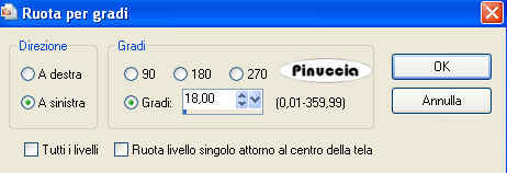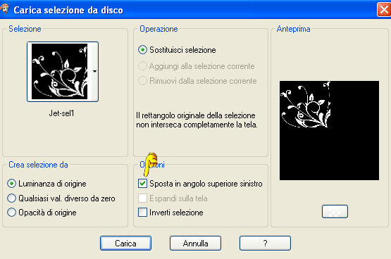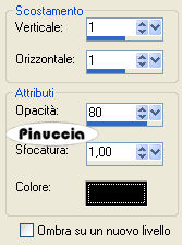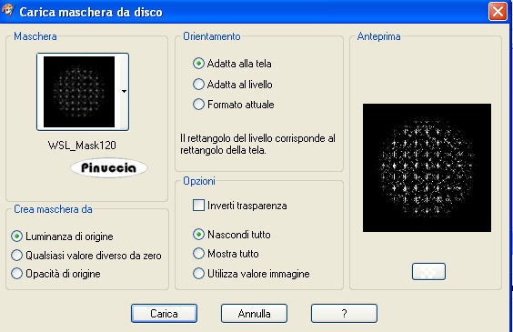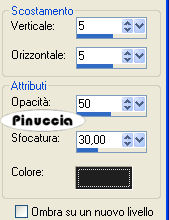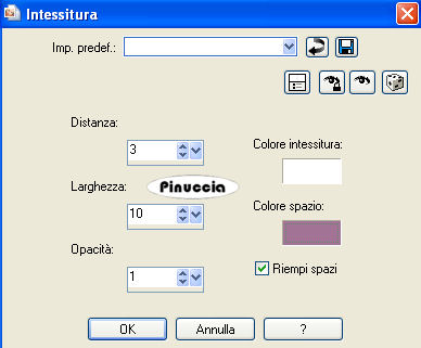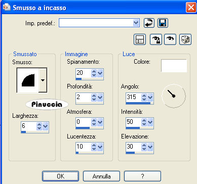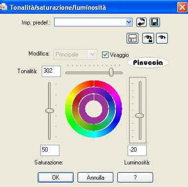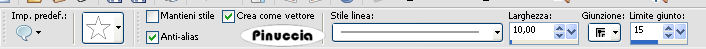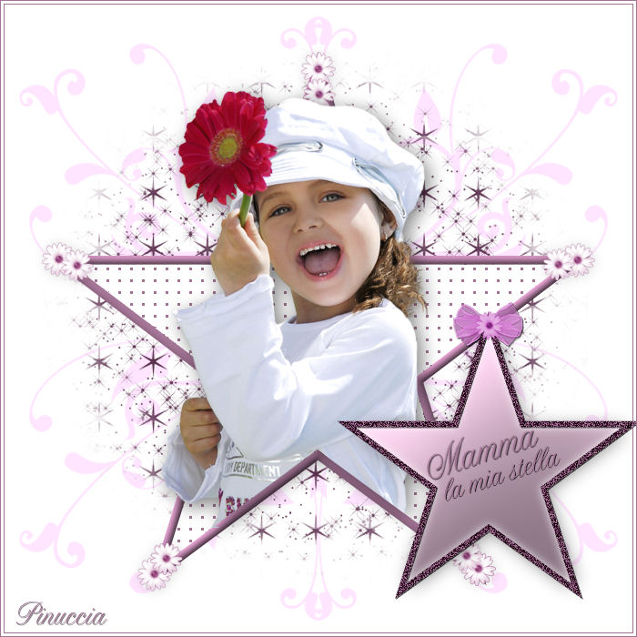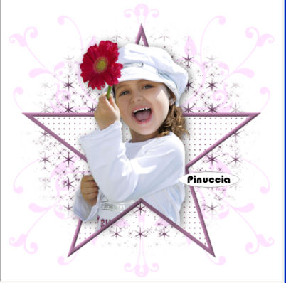qui puoi trovare qualche risposta ai tuoi dubbi. Se l'argomento che ti interessa non è presente, ti prego di segnalarmelo. Questo tutorial è stato scritto con PSP X2, ma può essere eseguito anche con le altre versioni di PSP. Per tradurlo, l'ho eseguito con PSP X. Occorrente: Materiale qui Il tube è di Gerry e la selezione di Jet. Non conosco gli autori del fiore e del fiocco. Rispetta il lavoro degli autori e mantieni inalterati i tubes. Filtri: Graphics Plus qui Ti servirà anche Animation Shop qui Metti la Selezione nella cartella Selezioni, e la Maschera nella cartella Maschere. Apri una nuova immagine trasparente 700 x 700 pixels, e riempila con il colore bianco.Imposta il colore di primo piano con #a27394, e il colore di sfondo con #5a2e4d. Livelli>Nuovo livello raster. Riempi con il colore di sfondo.Livelli>Carica/Salva maschera>Carica maschera da disco. Cerca e carica la maschera WSL Mask120. ![]() Livelli>Unisci>Unisci gruppo. Chiudi il colore di sfondo. Attiva lo strumento Forme predefinite e seleziona Stella 2 (la stella a cinque punte).![]() Traccia la forma, partendo dall'angolo in alto a sinistra, più o meno a 70-80 pixels dal bordo. ![]() Oggetti>Allinea>Centra nella tela. Livelli>Converti in livello raster. Effetti>Effetti 3D>Smusso a incasso: ![]() Attiva lo strumento Bacchetta magica ![]() ![]() e clicca al centro della stella per selezionarlo. Livelli>Nuovo livello raster. Riempi la selezione con il colore bianco.Livelli>Disponi>Sposta giù. Apri Gerry-Kids4-19 april 20081.psp, e vai a Modifica>Copia. Torna al tuo lavoro e vai a Modifica>Incolla come nuovo livello. Sposta il tube un po' più a sinistra.![]() Ingrandisci l'immagine almeno al 200%, attivando lo zoom o usando la rotellina del mouse,attiva lo strumento Selezione a mano libera ,e traccia una selezione come nell'esempio. ![]() Premi sulla tastiera il tasto CANC ![]() Selezione>Deseleziona. Livelli>Duplica. Livelli>Disponi>Porta in alto. Effetti>Effetti 3D>Sfalsa ombra, con i seguenti settaggi, colore nero: ![]() Attiva il livello Raster 3 (il livello della stella bianca). Effetti>Effetti di trama>Intessitura: colore intessitura: bianco; colore spazio: colore di primo piano. ![]() Attiva il livello Raster 1 (il livello bianco di sfondo). Selezione>Carica/salva selezione>Carica selezione da disco. Cerca e carica la selezione Jet-Sel1: attenzione! seleziona opzione: sposta in angolo superiore sinistro: ![]() Livelli>Nuovo livello raster. Riempi la selezione con #ffe5ff.Selezione>Deseleziona. Immagine>Ridimensiona, al 95%, tutti i livelli non selezionato. Attiva lo strumento Spostamento ![]() e sposta il livello con la freccia 3 passi a destra. sull'uso delle frecce applicato allo strumento Spostamento vedi qui Livelli>Duplica. Immagine>Rifletti. Livelli>Unisci>Unisci giù. Livelli>Duplica. Immagine>Rifletti. ![]() Attiva il livello Raster 2 (il livello della forma). Apri flower.pspimage, e vai a Modifica>Copia. non chiuderlo perchè ti servirà ancora. Torna al tuo lavoro e vai a Modifica>Incolla come nuovo livello. Regola>Tonalità e Saturazione>Viraggio: ![]() Sposta il fiore sulle punta destra esterna della stella.Livelli>Duplica e ripeti per posizionare i fiori su tutte le punte della stella. Quando hai finito, cominciando dal livello superiore vai a Livelli>Unisci>Unisci giù, e ripeti finchè non avrai i livelli dei fiori in un unico livello. Effetti>Effetti 3D>Sfalsa ombra, con i seguenti settaggi, colore nero: ![]() Livelli>Duplica. Immagine>Ridimensiona, al 90%, tutti i livelli non selezionato. Livelli>Unisci>Unisci giù. Attiva il livello superiore. Passa il colore di sfondo a colore di primo piano e chiudi il colore di sfondo. Attiva lo strumento Forme predefinite e seleziona nuovamente Stella 2,cambiando la dimensione a 7 pixels. Traccia una piccola stella a destra della stella grande. Controlla il mio esempio come orientamento. ![]() Livelli>Converti in livello raster. Rinomina questo livello "Disturbo". Attiva lo strumento Bacchetta magica ![]() ![]() e clicca al centro della stella per selezionarlo. Modifica>Espandi - 1 pixel. Livelli>Nuovo livello raster. Riempi la selezione con il bianco.Livelli>Nuovo livello raster. Riempi la selezione con il colore #c3a5ba.Selezione>Deseleziona. Effetti>Plugins>Graphics Plus - Cross Shadow, con i seguenti settaggi. ![]() Regola>Sfocatura>Sfocatura gaussiana - raggio 5. ![]() Livelli>Unisci>Unisci giù. Livelli>Disponi>Sposta giù. Effetti>Effetti 3D>sfalsa ombra, con i seguenti settaggi, colore nero: ![]() Attiva lo strumento Testo e imposta un font, crea come vettore.Per il mio esempio ho usato il font Altast Greeting, dimensione 48 per la prima riga, e dimensione 36, per la seconda. Dovrai regolare la dimensione a seconda del testo, del font e della versione di PSP che stai usando. Vedi alcuni appunti sui font qui Scrivi la prima riga del testo. Livelli>Converti in livello raster. Scrivi la seconda riga del testo. Livelli>Converti in livello raster. Livelli>Unisci>Unisci giù. Immagine>Ruota per gradi - 18 gradi a sinistra, tutti i livelli non selezionato. ![]() Sistema il testo dentro la stella.Attiva il livello "Disturbo". Effetti>Effetti 3D>Sfalsa ombra, con i seguenti settaggi, colore nero. ![]() Livelli>Duplica, 2 volte. Attiva nuovamente il livello "Disturbo". Regola>Aggiungi/Rimuovi disturbo>Aggiungi disturbo: ![]() Attiva il livello Copia di Disturbo. Ripeti Regola>Aggiungi/Rimuovi disturbo>Aggiungi disturbo e aumenta il disturbo a 60. Chiudi questo livello. Attiva il livello Copia (2) di Disturbo. Ripeti Regola>Aggiungi/Rimuovi disturbo>Aggiungi disturbo e aumenta il disturbo a 70. Chiudi questo disturbo. Apri bow.pspimage, e vai a Modifica>Copia. Torna al tuo lavoro e vai a Modifica>Incolla come nuovo livello. Regola>Tonalità e Saturazione>Tonalità-Saturazione-Luminosità: ![]() Sposta il fiocco sulla punta della piccola stella.Effetti>Effetti 3D>Sfalsa ombra, con i settaggi precedenti. Attiva nuovamente il tube flower.pspimage, e vai a Mod