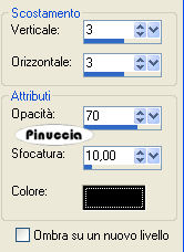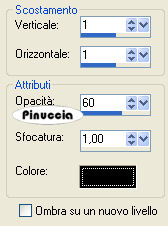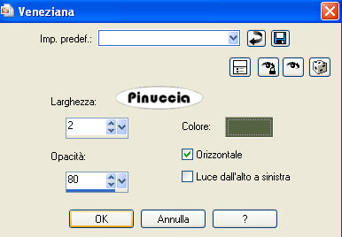 qui puoi trovare qualche risposta ai tuoi dubbi. Se l'argomento che ti interessa non è presente, ti prego di segnalarmelo. Questo tutorial è stato scritto con PSP X2, ma può essere eseguito anche con le altre versioni di PSP. Per tradurlo, l'ho eseguito con PSP X. Occorrente: Materiale qui I tubes che ho usato sono di Suzi Sgai, SKF(Silke), Foxleap e un file di testo di Biene. Rispetta il lavoro degli autori e mantieni inalterati i tubes. Filtri: Graphics Plus qui Metti la maschera 20-20.bmp nella cartella Maschere. Imposta il colore di primo piano con #566343, e il colore di sfondo con #7d8f61. Apri una nuova immagine trasparente 700 x 500 pixels, e riempila con il colore di primo piano.Effetti>Plugins>Graphics Plus - Cross Shadow, con i seguenti settaggi. ![]() Regola>Sfocatura>Sfocatura gaussiana, raggio 40. ![]() Effetti>Plugins>Graphics Plus - Cross Shadow, con i settaggi precedenti. Apri SKF_Bottle259.07.psp. Attiva lo strumento Selezione a mano libera , da punto a punto,sfumatura e spianamento 0, e traccia una selezione come nell'esempio. nascondi eventualmente il livello del watermark, per vedere meglio: ![]() Modifica>Copia. Torna al tuo lavoro e vai a Modifica>Incolla come nuovo livello. Immagine>Ridimensiona, al 110%, tutti i livelli non selezionato. Sposta l'immagine a sinistra.Effetti>Effetti di bordo>Aumenta. Cambia la modalità di miscelatura di questo livello in Luminanza (esistente), e abbassa l'opacità di questo livello al 22%. Livelli>Duplica. Immagine>Rifletti. Abbassa l'opacità di questo livello al 30%. ![]() Apri SS_319.psp, e vai a Modifica>Copia. Torna al tuo lavoro e vai a Modifica>Incolla come nuovo livello. Immagine>Rifletti. Livelli>Carica/Salva maschera>Carica maschera da disco. Cerca e carica la maschera 20-20.bmp, con i seguenti settaggi: ![]() Livelli>Unisci>Unisci gruppo. Sposta la mano un po' più in alto, vedi il mio esempio.Cambia la modalità di miscelatura di questo livello in Luminanza (Esistente), e abbassa l'opacità al 54%. Apri SS_316.psp, e vai a Modifica>Copia. Torna al tuo lavoro e vai a Modifica>Incolla come nuovo livello. Immagine>Ridimensiona, al 90%, tutti i livelli non selezionato. Livelli>Carica/Salva maschera>Carica maschera da disco. Cerca e carica la maschera 20-20.bmp, con i settaggi precedenti. Livelli>Unisci>Unisci gruppo. Sposta la donna a sinistra.Cambia la modalità di miscelatura di questo livello in Luminanza (esistente). Apri misted_bladeofgrass-foxleap.psp, e vai a Modifica>Copia. Torna al tuo lavoro e vai a Modifica>Incolla come nuovo livello. Sposta il tube nell'angolo in basso a destra.Cambia la modalità di miscelatura di questo livello in Luminanza (esistente). Attiva il livello Raster 2. Attiva lo strumento Gomma , con i seguenti settaggi:![]() Cancella dal viso della donna i segni della foglia. ![]() Attiva il livello Copia di Raster 2. Cancella il segno scuro sulle dita. ![]() Livelli>Unisci>Unisci tutto. Selezione>Seleziona tutto. Immagine>Aggiungi bordatura, 1 pixel, simmetriche, con il colore di primo piano. Selezione>inverti. Effetti>Plugins>Graphics Plus - Cross Shadow, con i settaggi standard. ![]() Effetti>Effetti 3D>Sfalsa ombra, con i seguenti settaggi, colore nero: ![]() Ripeti l'Effetto Sfalsa ombra, cambiando verticale e orizzontale con -1. Selezione>Seleziona tutto. Immagine>Aggiungi bordatura, 23 pixels, simmetriche, con il colore di primo piano. Effetti>Plugins>Graphics Plus - Cross Shadow, con i primi settaggi. ![]() Effetti>Effetti di trama>Veneziana: ![]() Effetti>Effetti di bordo>Aumenta. Selezione>Seleziona tutto. Immagine>Aggiungi bordatura, 1 pixel, simmetriche, con il colore di primo piano. Selezione>Inverti. Effetti>Plugins>Graphics Plus - Cross Shadow, di nuovo con i settaggi standard. ![]() Effetti>Effetti 3D>Sfalsa ombra, con i seguenti settaggi, colore nero: ![]() Ripeti l'Effetto Sfalsa ombra, cambiando verticale e orizzontale con -1. Selezione>Deseleziona. Apri wordart_nature_biene.pspimage, e vai a Modifica>copia. Torna al tuo lavoro e vai a Modifica>Incolla come nuovo livello. Cambia la modalità di miscelatura di questo livello in Luminanza (Esistente). Apri Butterfly2.psp, e vai a Modifica>copia. Torna al tuo lavoro e vai a Modifica>Incolla come nuovo livello. Cambia la modalità di miscelatura di questo livello in Luminanza (Esistente). Effetti>Effetti 3D>Sfalsa ombra, con i seguenti settaggi, colore nero: ![]() Sposta la farfalla a destra, con una parte sul bordo dell'immagine.Aggiungi il tuo nome e/o il tuo watermark. Livelli>Unisci>Unisci tutto, e salva in formato jpg. ![]() Se hai problemi o dubbi, o trovi un link non funzionante, o anche soltanto per un saluto, scrivimi 23 Maggio 2008 |