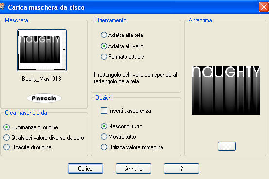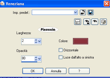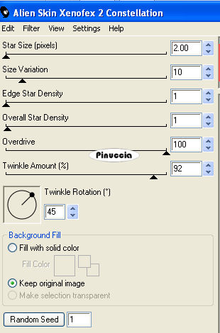 qui puoi trovare qualche risposta ai tuoi dubbi. Se l'argomento che ti interessa non è presente, ti prego di segnalarmelo. Questo tutorial è stato scritto con PSP X2, ma può essere eseguito anche con le altre versioni di PSP. Per tradurlo, l'ho eseguito con PSP X. Occorrente: Materiale qui Il tube è di Native Nancy. Rispetta il lavoro degli autori e mantieni inalterati i tubes. Filtri: Graphics Plus qui Alien Skin Xenofex qui Ti servirà anche Animation Shop qui Metti la maschera nella cartella Maschere. Imposta il colore di primo piano con #8a323d, e il colore di sfondo con il nero (#000000). Apri una nuova immagine trasparente 700 x 500 pixels, e riempila con il colore di sfondo.Livelli>Nuovo livello raster. Riempi il livello con il colore di primo piano.Effetti>Plugins>Graphics Plus - Cross Shadow, con i seguenti settaggi. ![]() Regola>Sfocatura>Sfocatura gaussiana, raggio 40. ![]() Livelli>Carica/Salva maschera>Carica maschera da disco. Cerca e carica la maschera Becky_Mask013.jpg. ![]() Effetti>Effetti di bordo>Aumenta. Livelli>Unisci>Unisci gruppo. Regola>Messa a fuoco>Metti a fuoco. Apri 711.jpg, e vai a Modifica>Copia. Torna al tuo lavoro e vai a Modifica>Incolla come nuovo livello. Immagine>Ridimensiona, al 95%, tutti i livelli non selezionato. Sposta l'immagine sul bordo in basso a sinistra.Cambia la modalità di miscelatura di questo livello in Luce diffusa. Effetti>Effetti di bordo>Aumenta. Livelli>Unisci>Unisci tutto. Immagine>Aggiungi bordatura, 2 pixels, simmetriche, con il colore nero. Selezione>Seleziona tutto. Immagine>Aggiungi bordatura, 2 pixels, simmetriche, con il colore di primo piano. Selezione>Inverti. Effetti>Plugins>Graphics Plus - Cross Shadow, con i settaggi precedenti. Selezione>Deseleziona. Immagine>Aggiungi bordatura, 2 pixels, simmetriche, con il colore nero. Selezione>Seleziona tutto. Immagine>Aggiungi bordatura, 2 pixels, simmetriche, con il colore di primo piano. Selezione>Inverti. Effetti>Plugins>Graphics Plus - Cross Shadow, con i settaggi precedenti. Selezione>Seleziona tutto. Immagine>Aggiungi bordatura, 42 pixels, simmetriche, con il colore nero. Selezione>Inverti. Effetti>Effetti di trama>Veneziana, con i seguenti settaggi, colore di primo piano: ![]() Effetti>Plugins>Graphics Plus - Cross Shadow, con i settaggi precedenti. Selezione>Seleziona tutto. Immagine>Aggiungi bordatura, 2 pixels, simmetriche, con il colore di primo piano. Selezione>Inverti. Effetti>Plugins>Graphics Plus - Cross Shadow, con i settaggi precedenti. Selezione>Deseleziona. Apri NN Racer Girl Mei 08 85%1.psp, e vai a Modifica>Copia. Torna al tuo lavoro e vai a Modifica>Incolla come nuovo livello. Immagine>Ridimensiona, al 67%, tutti i livelli non selezionato. Immagine>Rifletti. Sposta il tube a destra.Regola>Messa a fuoco>Metti a fuoco. Livelli>Duplica. Livelli>Disponi>Sposta giù. Effetti>Effetti di distorsione>Vento, da destra, intensità 100. ![]() Regola>Sfocatura>Sfocatura gaussiana, raggio 15. ![]() Attiva il livello superiore. Effetti>Effetti 3D>Sfalsa ombra, con i seguenti settaggi, colore nero: ![]() Se vuoi, questo è il momento di aggiungere il tuo nome e/o il tuo watermark. Attiva il livello di sfondo. Attiva lo strumento Bacchetta magica , tolleranza 18, sfumatura 0.Clicca sulle lettere della maschera. Per alcune lettere dovrai cliccare due volte per selezionarle completamente. ![]() Selezione>Modifica>Contrai - 1 pixel. Effetti>Plugins>Alien Skin - Xenofex - Constellation, con i seguenti settaggi: ![]() Selezione>Deseleziona. Modifica>Copia Unione. Se stai usando PSP X2 Modifica>Copia speciale>Copia unione. Apri Animation Shop. e vai a Modifica>Incolla>Incolla come nuova animazione. Torna in PSP. Modifica>Annulla Azione Deseleziona. Modifica>Annulla Azione Constellation. Effetti>Plugins>Alien Skin Xenofex 2 - Constellation, con i settaggi precedenti, ma clicca una volta su Random Seed. Selezione>Deseleziona. Modifica>Copia Unione. Torna in Animation Shop e vai a Modifica>Incolla>Incolla dopo il fotogramma corrente. Di nuovo in PSP. Modifica>Annulla azione Deseleziona. Modifica>Annulla azione Constellation. Effetti>Plugins>Alien Skin Xenofex 2 - Constellation, con i settaggi precedenti, ma clicca una volta su Random Seed. Selezione>Deseleziona. Modifica>Copia Unione. Torna in Animation Shop e vai a Modifica>Incolla>Incolla dopo il fotogramma corrente. Controlla il risultato cliccando su Visualizza e salva in formato gif.L'esempio senza animazione: ![]() ![]() Se hai problemi o dubbi, o trovi un link non funzionante, o anche soltanto per un saluto, scrivimi 5 Giugno 2008 |