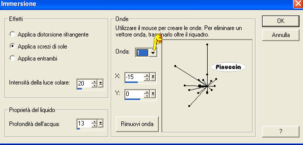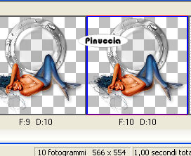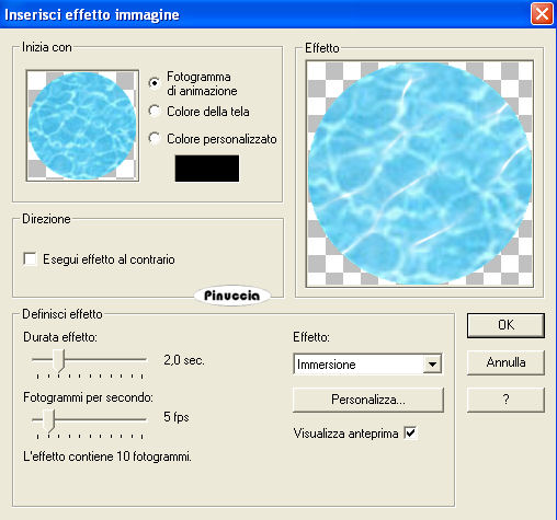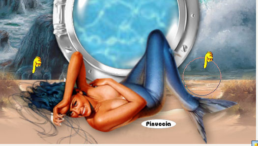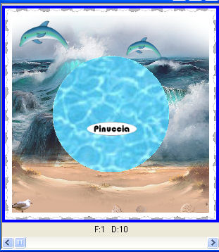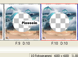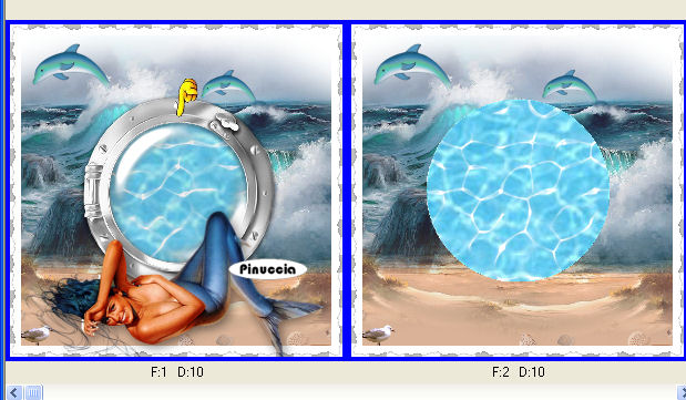 qui puoi trovare qualche risposta ai tuoi dubbi. Se l'argomento che ti interessa non è presente, ti prego di segnalarmelo. Questo tutorial è stato scritto con PSP X2, ma può essere eseguito anche con le altre versioni di PSP. Per tradurlo, l'ho eseguito con PSP X. Occorrente: Un tube a scelta. Il resto del materiale qui JBL_121906_OceanFoam.pspimage è un tube di JBL. Non conosco l'autore del tube dei delfini. Il resto del materiale fa parte della collezione di ©Biene. Rispetta il lavoro degli autori e mantieni inalterati i tubes. Filtri: Filters Unlimited qui Photo Aging kit qui Per usare Photo Aging Kit, bisogna importarlo in Filters Unlimited. Come fare vedi qui Apri una nuova immagine BIANCA 600 x 600 pixels. Livelli>Duplica. Apri JBL_121906_OceanFoam.pspimage e vai a Modifica>Copia. Torna al tuo lavoro e vai a Modifica>Incolla come nuovo livello. Abbassa l'opacità di questo livello all'87%. ![]() Livelli>Nuovo livello raster. Attiva lo strumento Selezione ![]() clicca sull'icona Selezione personalizzata ![]() e imposta i seguenti settaggi. ![]() Riempi la selezione con #d9b297.Selezione>Deseleziona. Apri strand1.psd e vai a Modifica>Copia. Torna al tuo lavoro e vai a Modifica>Incolla come nuovo livello. Spostalo in basso.![]() Apri wasserfläche.pspimage e vai a Modifica>Copia. Torna al tuo lavoro e vai a Modifica>Incolla come nuovo livello. Immagine>Ridimensiona, all'80%, tutti i livelli non selezionato. Selezione>Seleziona tutto. Selezione>Mobile. Selezione>Immobilizza. Apri wasser_biene_nautica.jpg e vai a Modifica>Copia. Torna al tuo lavoro e vai a Modifica>Incolla nella selezione. Selezione>Deseleziona. Regola>Messa a fuoco>Metti a fuoco. Apri il tube porthole_nautica.pspimage e vai a Modifica>Copia. Torna al tuo lavoro e vai a Modifica>Incolla come nuovo livello. Regola>Tonalità e saturazione>Viraggio: ![]() Effetti>Effetti 3D>Sfalsa ombra, con i seguenti settaggi, colore nero: ![]() ![]() Apri il tuo tube e vai a Modifica>Copia. Torna al tuo lavoro e vai a Modifica>Incolla come nuovo livello. Posizionalo sulla sabbia.Effetti>Effetti 3D>Sfalsa ombra, con i seguenti settaggi, colore nero. ![]() Attiva il livello Raster 3 (il livello della spiaggia). Attiva lo strumento Gomma - dimensione 60 - opacità 15, e cancella con cautela il segno netto tra la spiaggia e l'acqua. ![]() ![]() Attiva il livello Raster 1. Apri cc_dolphin.psp e vai a Modifica>Copia. Torna al tuo lavoro e vai a Modifica>Incolla come nuovo livello. Immagine>Rifletti. Immagine>Ridimensiona, una volta al 70% e una volta all'85%, tutti i livelli non selezionato. Regola>Messa a fuoco>Metti a fuoco. Spostalo nell'angolo in alto a sinistra, sopra un'onda.Attenzione: non troppo vicino al bordo! Livelli>Duplica. Immagine>Ridimensiona, al 70%, tutti i livelli non selezionato. Spostalo a destra, sopra un'altra onda.Attiva nuovamente lo strumento Gomma , dimensione tra 40 e 50, opacità 15,e cancella con cautela una parte delle pinne in modo da dare l'impressione che il delfino esca dall'onda. ![]() Attiva il livello superiore. Apri beachthings_biene.pspimage e scegli le immagini per decorare la spiaggia. Naturalmente, puoi adattare le dimensioni a tuo piacimento. Alle varie immagini applica un leggero Effetto Sfalsa ombra, con il colore nero. ![]() Quindi, su ogni conchiglia puoi usare la gomma per cancellare parte delle conchiglie in modo che sembrino affossate sulla sabbia. Se vuoi, questo è il momento di aggiungere il tuo nome e/o il tuo watermark. Quando hai finito, attiva il livello Raster 4 (l'acqua), e portalo al primo posto: Livelli>Disponi>Porta in alto. Attiva il livello Raster 5 e vai a Livelli>Disponi>Porta in alto. Attiva il livello Raster 6 e vai a Livelli>Disponi>Porta in alto. Chiudi i tre livelli superiori. Attiva uno dei livelli visibili e vai a Livelli>Unisci>Unisci visibile. Effetti>Plugins>Filters Unlimited - Photo Aging Kit - Photo Frame 01. Attiva lo strumento Bacchetta magica ![]() tolleranza 10 - sfumatura 0 e clicca sul bordo nero per selezionarlo. Selezione>Modifica>Espandi - 1 pixels. Premi sulla tastiera il tasto CANC. Selezione>Inverti. Effetti>Effetti 3D>Sfalsa ombra, con i seguenti settaggi, colore nero: ![]() Selezione>Deseleziona. Riapri i tre livelli superiori. Attiva il livello Raster 4 (il livello dell'acqua). Selezione>Seleziona tutto. Selezione>Mobile. Selezione>Immobilizza. Attiva il livello Uniti e premi sulla tastiera il tasto CANC. Selezione>Deseleziona. Attiva il livello Raster 6 (il livello del tube della sirena). Livelli>Unisci>Unisci giù. Questa dovrebbe essere la paletta dei livelli. ![]() Attiva nuovamente il livello dell'acqua (raster 4). Modifica>Copia. Apri Animation Shop. Modifica>Incolla>Incolla come nuova animazione. Effetti>Inserisci effetto immagine - Immersione: ![]() Clicca su Personalizza e imposta le onde da 1 a 11 come sotto descritto e clicca ok: ![]() onda 1.  x:-15; y:0 onda 2.  x:0; y:23 onda 3.  x:0; y:-12 onda 4.  x:-18; y:-14 onda 5.  x:-17; y:12 onda 6.  x:19; y:14 onda 7.  x:15; y:0 onda 8.  x:8; y:10 onda 9.  x:0; y:-14 onda 10.  x:9; y:-8 onda 11.  x:-8; y:12 Clicca sul primo fotogramma ed eliminalo. Avrai così un'animazione composta da 10 fotogrammi. ![]() clicca sul primo fotogramma per selezionarlo e vai a Modifica>Seleziona tutto. Torna in PSP. Attiva il livello Uniti e vai a Modifica>Copia. Torna in Animation Shop e vai a Modifica>Incolla>Incolla come nuova animazione. Modifica>Duplica, e ripeti finchè non avrai 10 fotogrammi. ![]() Clicca sul primo fotogramma per selezionarlo e vai a Modifica>Seleziona tutto. Torna all'animazione dell'acqua (che hai già selezionato prima) e vai a Modifica>Copia. Torna alla seconda animazione e vai a Modifica>Incolla>Incolla nel fotogramma selezionato. Posiziona l'acqua nello spazio vuoto al centro e, quando sei certo di aver trovato la posizione corretta, rilascia il tasto del mouse. ![]() ![]() Torna in PSP. Attiva il livello Raster 5 (il livello con l'oblò e il tube) e vai a Modifica>C