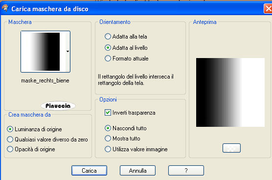 qui puoi trovare qualche risposta ai tuoi dubbi. Se l'argomento che ti interessa non è presente, ti prego di segnalarmelo. Questo tutorial è stato scritto con PSP X2, ma può essere eseguito anche con le altre versioni di PSP. Per tradurlo, ho usato PSP X. ©Biene - tutti i diritti riservati. Il © della traduzione è mio. Occorrente: Tre immagini a scelta a scelta. Il resto del materiale qui Per il mio esempio ho usato immagini http://michellemonique.deviantart.com ©Michelle Monique. Le sue foto non si possono usare, senza il suo permesso. Un ringraziamento ai creatori di tubes dei vari gruppi cui appartengo. Il watermark di ognuno è inserito nei tubes. Per favore, rispetta il lavoro degli autori: non cambiare il nome del file e non rimuovere il watermark. Il © appartiene agli artisti originali. ![]() Metti le maschere 20-20.bmp e maske_rechts_biene.jpg nella cartella Maschere. Apri la prima immagine (la mia Expiration_by_michellemonique.jpg). Immagine>Ridimensiona, a 700 x 559 pixels. Questa sarà la base del lavoro. Apri la seconda immagine (Phoenix_by_michellemonique.jpg). Attiva lo strumento Selezione , rettangolo,e traccia una selezione come nell'esempio. ![]() Modifica>Copia. Torna alla prima immagine e vai a Modifica>Incolla come nuovo livello. Immagine>Ridimensiona, al 70%, tutti i livelli non selezionato. Regola>Messa a fuoco>Metti a fuoco. Livelli>Carica/Salva maschera>Carica maschera da disco. Cerca e carica la maschera 20-20: ![]() Livelli>Unisci>Unisci gruppo. Carica nuovamente la maschera 20-20. Livelli>Unisci>Unisci gruppo. Ancora: Livelli>Carica/Salva maschera>Carica maschera da disco. Cerca e carica la maschera maske_rechts_biene: ![]() Livelli>Unisci>Unisci gruppo. Carica nuovamente la maschera maske_rechts_biene. Livelli>Unisci>Unisci gruppo. Posiziona l'immagine nell'angolo in alto a destra.Ingrandisci l'immagine al 200%, attivando lo strumento Zoom o usando la rotellina del mouse.Attiva lo strumento Gomma , dimensione da 20 a 28, opacità 10,e cancella le tracce che disturbano l'immagine al centro. ![]() Apri la terza immagine (Phoenix_Tear_by_michellemonique.jpg). Immagine>Ruota a sinistra. se stai usando PSP 9: Immagine>Ruota - 90 gradi in senso antiorario. Modifica>Copia. Torna al tuo lavoro e vai a Modifica>Incolla come nuovo livello. Immagine>Ridimensiona, al 70%, tutti i livelli non selezionato. Regola>Messa a fuoco>Metti a fuoco. Livelli>Carica/Salva maschera>Carica maschera da disco. Cerca e carica la maschera 20-20, con i settaggi precedenti. Livelli>Unisci>Unisci gruppo. Sposta il viso a sinistra.![]() Livelli>Unisci>Unisci tutto. Duplica l'immagine usando la combinazione di tasti maiuscola+D e metti da parte l'originale. Attiva la copia. Livelli>Duplica. Regola>Sfocatura>Sfocatura gaussiana - raggio 10. ![]() Livelli>Nuovo livello raster. Selezione>Seleziona tutto. Selezione>modifica>Contrai - 1 pixel. Selezione>Inverti. Passa il colore di primo piano a Motivi e seleziona un motivo oro. Riempi la selezione con questo motivo.Selezione>Deseleziona. Livelli>Duplica, e attiva il livello sottostante. Regola>Tonalità e saturazione>Tonalità/Saturazione/Luminosità. ![]() Attiva nuovamente il livello superiore e abbassa l'opacità al 38%. Livelli>Unisci>Unisci tutto. Attiva l'immagine che hai messo da parte prima. Immagine>Ridimensiona, al 93%, tutti i livelli selezionato. Regola>Messa a fuoco>Metti a fuoco. Livelli>Nuovo livello raster. Selezione>Seleziona tutto. Selezione>modifica>Contrai - 1 pixel. Selezione>Inverti. Riempi la selezione con il motivo oro.Selezione>Deseleziona. Livelli>Duplica. Attiva il livello sottostante. Regola>Tonalità e Saturazione>Tonalità/Saturazione/Luminosità, con i settaggi precedenti. Attiva il livello superiore e abbassa l'opacità al 38%. Livelli>Unisci>Unisci tutto. Modifica>Copia. Attiva l'immagine più grande e vai a Modifica>Incolla come nuovo livello. Effetti>Effetti 3D>Sfalsa ombra, con il colore nero. ![]() Ripeti l'Effetto Sfalsa ombra, cambiando verticale e orizzontale con -2. Mantieni il colore di primo piano ipostato sul motivo oro e chiudi il colore di sfondo. Attiva lo strumento Testo e scegli un font.Per il mio testo ho usato il font Engravers MT - pennellata 1 (regola la dimensione a seconda del testo e della versione di PSP che stai usando). Scrivi il tuo testo. Oggetti>Allinea orizz. nella tela. Livelli>Converti in livello raster. Sposta il testo in basso.Livelli>Duplica. Livelli>Disponi>Sposta giù. Regola>Tonalità e saturazione>Tonalità/Saturazione>Luminosità, con i settaggi precedenti. Effetti>Effetti 3D>Sfalsa ombra, con il colore nero. ![]() Attiva il livello soprastante e abbassa l'opacità al 60%. Aggiungi il tuo nome e/o il tuo watermark, senza dimenticare eventuali © delle immagini usate. Livelli>Unisci>Unisci tutto e salva in formato jpg. Se hai problemi o dubbi, o trovi un link non funzionante, o anche soltanto per un saluto, scrivimi