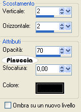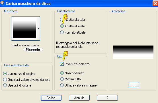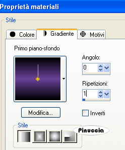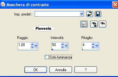qui puoi trovare qualche risposta ai tuoi dubbi. Se l'argomento che ti interessa non è presente, ti prego di segnalarmelo. Questo tutorial è stato scritto con PSP X2, ma può essere eseguito anche con le altre versioni di PSP. Per tradurlo, l'ho eseguito con PSP X. Occorrente: Materiale qui Ho usato un tube di Sabi © Adiene art. Ho usato anche tube di Silke(SKF), Gini, Shirl e Deena. Rispetta il lavoro degli autori e mantieni inalterati i tubes. Filtri: Graphics Plus - Cross Shadow qui Metti la maschera maske_unten_biene.jpg nella cartella Maschere. Apri una nuova immagine trasparente 600 x 450 pixels. Imposta il colore di primo piano con il nero, e il colore di sfondo con #684399. Passa il colore di primo piano a Gradiente di primo piano/sfondo, stile lineare: ![]() Riempi l'immagine trasparente con il gradiente.Apri SKF_Landscape021.07.psp e vai a Modifica>Copia. Torna al tuo lavoro e vai a Modifica>Incolla come nuovo livello. Livelli>Carica/Salva maschera>Carica maschera da disco. Cerca e carica la maschera maske_unten_biene.jpg: ![]() Livelli>Unisci>Unisci gruppo. Sposta il tube in basso a destra, come nel mio esempio.La mia posizione: Pos.x: 149,00 Pos.y: 263,00 attivando lo strumento Puntatore (sulla tastiera: tasto D),il tube verrà circondato dalla griglia e nella barra superiore degli strumenti potrai controllare la posizione. ![]() Cambia la modalità di miscelatura di questo livello in Luminanza (esistente), e abbassa l'opacità al 40%. Livelli>Duplica. Immagine>Rifletti. Attiva lo strumento Gomma , dimensione 68, opacità 10,e cancella (su entrambi i livelli) i bordi netti dei tubes. ![]() Apri HauntedMansion_MistedByGini_09-30-05.psp e vai a Modifica>Copia. Torna al tuo lavoro e vai a Modifica>Incolla come nuovo livello. Spostalo in alto contro il bordo.Cambia la modalità di miscelatura di questo livello in Luminanza (esistente). Regola>Messa a fuoco>Maschera di contrasto: ![]() Apri Deena_BatsAndMoon.psp e vai a Modifica>Copia. Torna al tuo lavoro e vai a Modifica>Incolla come nuovo livello. Immagine>Rifletti. Immagine>Ridimensiona, all'85%, tutti i livelli non selezionato. Sposta la luna nell'angolo in alto a destra.Regola>Messa a fuoco>Maschera di contrasto, con i settaggi precedenti, 2 volte. Cambia la modalità di miscelatura di questo livello in Luminanza, e abbassa l'opacità al 40%. Apri Copy_by_Adiene_Myrrhiana.psp. Attiva il livello "Tube" e vai a Modifica>Copia. Torna al tuo lavoro e vai a Modifica>Incolla come nuovo livello. Immagine>Rifletti. Immagine>Ridimensiona, al 75%, tutti i livelli non selezionato. Regola>Messa a fuoco>Metti a fuoco. Sposta il tube a sinistra.![]() Livelli>Duplica. Livelli>Disponi>Sposta giù. Effetti>Effetti di distorsione>Vento - da sinistra, intensità 100. ![]() Regola>Sfocatura>Sfocatura gaussiana - raggio 20. ![]() Cambia la modalità di miscelatura di questo livello in Dissolvi, e abbassa l'opacità al 24%. Attiva lo strumento Gomma , dimensione 68, opacità 100,e cancella dal tube della luna, i puntini apparsi per effetto del cambio della modalità di miscelatura. ![]() Attiva il livello superiore. Effetti>Effetti 3D>Sfalsa ombra, con i seguenti settaggi, colore nero: ![]() Apri CandyMunchingGhostsShirlSmall.psp e vai a Modifica>Copia. Torna al tuo lavoro e vai a Modifica>Incolla come nuovo livello. Immagine>Ridimensiona, al 50%, tutti i livelli non selezionato. Cambia la modalità di miscelatura di questo livello in Luminanza. Regola>Messa a fuoco>Metti a fuoco. Effetti>Effetti 3D>Sfalsa ombra, con i settaggi precedenti. Attiva lo strumento Selezione a mano libera , da punto a punto,sfumatura e spianamento 0, e traccia una selezione come nell'esempio sotto. ![]() Livelli>Nuovo livello raster. Riempi la selezione con il colore di sfondo.Selezione>Deseleziona. Livelli>Disponi>Sposta giù. Attiva il livello superiore. Attiva lo strumento Testo , scegli un font sottile,e scrivi il copyright del tube (vedi il mio esempio). nello zip trovi un file di testo con l'indicazione corretta del copyright Aggiungi il tuo nome e/o il tuo watermark. Livelli>Unisci>Unisci tutto. Selezione>Seleziona tutto. Immagine>Aggiungi bordatura, 1 pixel, simmetriche, con il colore lilla di sfondo. Selezione>Inverti. Effetti>Plugins>Graphics Plus - Cross Shadow, con i seguenti settaggi: ![]() Selezione>Deseleziona. Immagine>Aggiungi bordatura, 8 pixels, simmetriche, con il colore nero. Selezione>Seleziona tutto. Immagine>Aggiungi bordatura, 1 pixel, simmetriche, con il colore lilla di sfondo. Selezione>Inverti. Effetti>Plugins>Graphics Plus - Cross Shadow, con i settaggi precedenti. Selezione>Deseleziona. Attiva lo strumento Bacchetta magica ,tolleranza 10, sfumatura 0, e clicca su tutte le lettere Clicca sulle lettere dell'insegna in basso. Con alcune lettere sarà facile, con altri sarà necessario cliccare più volte per selezionarle tutte. ![]() Modifica>Copia. Livelli>Nuovo livello raster. Modifica>Incolla nella selezione. Effetti>Effetti 3D>Sfalsa ombra, con i seguenti settaggi, colore nero: ![]() Selezione>Deseleziona. Livelli>Unisci>Unisci tutto, e salva in formato jpg. ![]() Se hai problemi o dubbi, o trovi un link non funzionante, o anche soltanto per un saluto, scrivimi 19 Settembre 2008 |