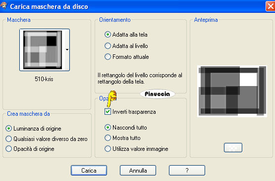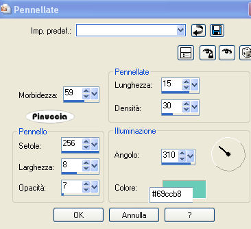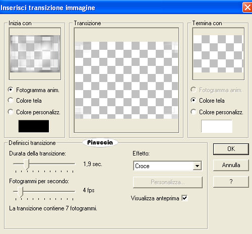 qui puoi trovare qualche risposta ai tuoi dubbi. Se l'argomento che ti interessa non è presente, ti prego di segnalarmelo. Questo tutorial è stato scritto con PSP X2, ma può essere eseguito anche con le altre versioni di PSP. Per tradurlo, l'ho eseguito con PSP X. Occorrente: Un tube a scelta. Il resto del materiale qui Il tube che ho usato è di Alejandra Rosales. Il tube del fiore è di Jet La maschera è di Kris Rispetta il lavoro degli autori e mantieni inalterati i tubes. Filtri: Graphics Plus qui Ti servirà anche Animation Shop qui Metti la maschera nella cartella Maschere. Metti il motivo argento nella cartella Motivi. Apri una nuova immagine trasparente 600 x 450 pixels, e riempila con il nero.Apri jet-flower1-augustus-2007.psp e vai a Modifica>Copia. Torna al tuo lavoro e vai a Modifica>Incolla come nuovo livello. Immagine>Ridimensiona, all'85%, tutti i livelli non selezionato. Immagine>Ruota per gradi - 12 gradi a sinistra: ![]() Sposta il fiore a sinistra, contro il bordo.Regola>Messa a fuoco>Metti a fuoco. Effetti>Effetti di bordo>Aumenta di più. Abbassa l'opacità di questo livello al 65%. Livelli>Duplica. Immagine>Rifletti. Livelli>Unisci>Unisci giù. Sposta il livello in basso contro il bordo.![]() Livelli>Duplica. Livelli>Disponi>Sposta giù. Effetti>Effetti di distorsione>Vento - da sinistra - intensità 80. ![]() Ripeti l'Effetto Vento, questa volta da destra: ![]() Regola>Sfocatura>Sfocatura gaussiana - raggio 15. ![]() Effetti>Effetti di bordo>Aumenta di più. Nella paletta dei livelli cambia la modalità di miscelatura di questo livello in Dissolvi, e abbassa l'opacità al 24%. Attiva il livello superiore. Apri il tuo tube e vai a Modifica>Copia. Torna al tuo lavoro e vai a Modifica>Incolla come nuovo livello. Ridimensionalo (Immagine>Ridimensiona...), se e quanto necessario. Livelli>Duplica. Livelli>Disponi>Sposta giù. Effetti>Effetti tecniche di disegno>Pennellate, con i seguenti settaggi, colore #69ccb8. ![]() Effetti>Effetti di distorsione>Vento, con i settaggi precedenti. Ripeti l'Effetto Vento da sinistra. Regola>Sfocatura>Sfocatura gaussiana - raggio 30. ![]() Attiva lo strumento Selezione ![]() clicca sull'icona Selezione personalizzata ![]() e imposta i seguenti settaggi: ![]() Regola>Sfocatura>Sfocatura gaussiana - raggio 50. ![]() Selezione>Deseleziona. Livelli>Nuovo livello raster. Passa il colore di primo piano a Motivi e seleziona il motivo Muster silber.jpg. ![]() Riempi il livello con il motivo argento.Regola>Sfocatura>Sfocatura gaussiana - raggio 25. ![]() Effetti>Plugins>Graphics Plus - Cross Shadow: ![]() Livelli>Carica/Salva maschera>Carica maschera da disco. Cerca e carica la maschera 510-kris.pspimage: ![]() Effetti>Effetti di bordo>Aumenta. Livelli>Unisci>Unisci gruppo. Effetti>Effetti di bordo>Aumenta. Rinomina questo livello "Maschera". Livelli>Nuovo livello raster. Selezione>Seleziona tutto. Selezione>Modifica>Contrai - 5 pixels. Selezione>Inverti. Riempi la selezione con il nero.Selezione>Seleziona tutto. Selezione>modifica>Contrai - 2 pixels. Livelli>Nuovo livello raster. Riempi la selezione con il motivo argento.Selezione>Modifica>Contrai - 1 pixel. Premi sulla tastiera il tasto CANC ![]() Selezione>Deseleziona. Livelli>Unisci>Unisci giù. Rinomina questo livello "Cornice". Se vuoi, questo è il momento di aggiungere il tuo nome e/o il tuo watermark. Nascondi il livello "Maschera" e posizionati su uno degli altri livelli. Modifica>Copia Unione. Apri Animation Shop e vai a Modifica>Incolla>Incolla come nuova animazione. Modifica>Duplica e ripeti finchè non avrai 8 fotogrammi. Clicca sul primo fotogramma per selezionarlo e vai a Modifica>Seleziona tutto. Torna in PSP. Rendi nuovamente visibile il livello "Maschera" e attivalo. Modifica>Copia. Torna in Animation Shop e vai a Modifica>Incolla>Incolla come nuova animazione. Effetti>Inserisci transizione immagine. Seleziona Croce con i seguenti settaggi: ![]() Avrai un'animazione composta da 8 fotogrammi. Clicca sul primo fotogramma per selezionarlo e vai a Modifica>Selezione tutto e poi Modifica>Copia. Attiva la prima animazione (che hai già selezionato) e vai a Modifica>Incolla>Incolla nel fotogramma corrente. Posiziona la maschera e, quando sei certo di aver trovato la posizione corretta - esattamente al centro - rilascia il tasto del mouse. se non sei soddisfatto, vai a Modifica>Annulla incolla e ripeti Torna in PSP. Attiva il livello "Cornice" e vai a Modifica>Copia. Torna in Animation Shop e vai a Modifica>Incolla>Incolla come nuova animazione. Modifica>Duplica, e ripeti finchè non avrai 8 fotogrammi. Clicca sul primo fotogramma per selezionarlo e vai a Modifica>Seleziona tutto e poi Modifica>Copia. Attiva il tuo lavoro e vai a Modifica>Incolla>Incolla nel fotogramma selezionato. Posiziona la cornice intorno all'immagine e, quando sei certo di aver trovato la posizione corretta, rilascia il tasto del mouse. Animazione>Proprietà fotogramma, e imposta la velocità a 45. ![]() Clicca sull'ultimo fotogramma per selezionarlo. Soltanto questo deve essere selezionato e avere la cornice blu. Animazione>Proprietà fotogramma, e imposta la velocità a 80. ![]() Controlla il risultato cliccando su Visualizza e salva in formato gif.![]() Se hai problemi o dubbi, o trovi un link non funzionante, o anche soltanto per un saluto, scrivimi 4 Settembre 2008 |