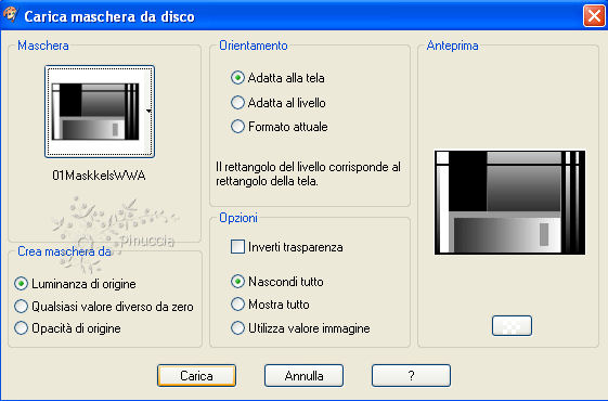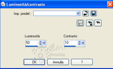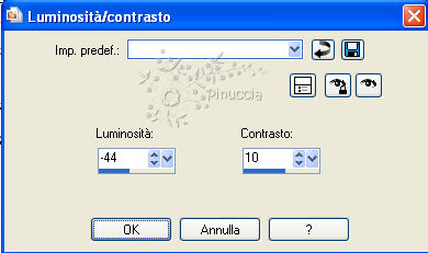 qui puoi trovare qualche risposta ai tuoi dubbi. Se l'argomento che ti interessa non è presente, ti prego di segnalarmelo. Questo tutorial è stato scritto con PSP X2, ma può essere eseguito anche con le altre versioni di PSP. Per tradurlo, ho usato PSP X. ©Biene - tutti i diritti riservati. Il © della traduzione è mio. Occorrente: A scelta il tube di una donna. Il resto del materiale qui per il mio esempio ho usato un tube ©Hellonlegs - Exclusive Tube. Non si possono usare questi tubes senza il permesso dell'autore. Gli altri tubes sono di MTM-Brigitte, Yoka e Donna K. Un ringraziamento ai creatori di tubes dei vari gruppi cui appartengo. Il watermark di ognuno è inserito nei tubes. Per favore, rispetta il lavoro degli autori: non cambiare il nome del file e non rimuovere il watermark. Il © appartiene agli artisti originali. Metti la maschera 01MaskkelsWWA.jpg nella cartella Maschere. Imposta il colore di primo piano con #883e69, e il colore di sfondo con #f8b7de. Apri background_sensualdelight_biene.jpg. Duplica l'immagine usando la combinazione di tasti maiuscola+D e chiudi l'originale. La copia sarà la base del tuo lavoro. Livelli>Duplica. Regola>Luminosità e contrasto>Luminosità e contrasto: ![]() Livelli>Carica/Salva maschera>Carica maschera da disco. Cerca e carica la maschera 01MaskkelsWWA.jpg ![]() Effetti>Effetti di bordo>Aumenta. Livelli>Unisci>Unisci gruppo. Effetti>Effetti 3D>Sfalsa ombra, con il colore #883e69. ![]() Apri Yoka-MistedFlowers0112091.psp e vai a Modifica>Copia. Torna al tuo lavoro e vai a Modifica>Incolla come nuovo livello. Livelli>Disponi>Sposta giù. Cambia la modalità di miscelatura di questo livello in Luminanza (esistente). Attiva nuovamente il livello superiore. Apri Mtm-Plant015-Wolgras-24 sept 2007.psp e vai a Modifica>Copia. Torna al tuo lavoro e vai a Modifica>Incolla come nuovo livello. Immagine>Ridimensiona, all'80%, tutti i livelli non selezionato. Regola>Messa a fuoco>Metti a fuoco. Posizionalo correttamente nel rettangolo superiore.Attiva lo strumento Selezione , rettangolo, sfumatura 0,e traccia una selezione come nell'esempio. ![]() Selezione>Inverti. Premi sulla tastiera il tasto CANC. Selezione>Deseleziona. Cambia la modalità di miscelatura di questo livello in Luminanza (esistente). Apri il tuo tube e vai a Modifica>Copia. Torna al tuo lavoro e vai a Modifica>Incolla come nuovo livello. Spostalo a destra, contro il bordo.Livelli>Duplcia. Livelli>Disponi>Sposta giù. Effetti>Effetti di distorsione>Vento - da destra - intensità 80. ![]() Regola>Sfocatura>Sfocatura gaussiana - raggio 20. ![]() Cambia la modalità di miscelatura di questo livello in Indebolisci, Abbassa l'opacità di questo livello all'85%. Attiva nuovamente il livello superiore. Inverti i colori nella paletta dei materiali. Attiva lo strumento Testo e scegli un font.Per il mio testo ho usato il font An Unfortunate Event De Warped, dimensione 100, pennellata 1. Scrivi il tuo testo e posizionalo. Selezione>Da oggetto vettoriale. Selezione>Modifica>Contrai - 1 pixel. Livelli>Converti in livello raster. Modifica>Copia. Livelli>Nuovo livello raster. Modifica>Incolla nella selezione. Attiva il livello sottostante e premi sulla tastiera il tasto CANC. Selezione>Deseleziona. Attiva nuovamente il livello superiore e abbassa l'opacità al 35%. Attiva di nuovo il livello sottostante. Livelli>Duplica. Effetti>Effetti 3D>Sfalsa ombra, con il colore nero. ![]() Apri donnaK_accents3048-3.png e vai a Modifica>copia. Torna al tuo lavoro e vai a Modifica>Incolla come nuovo livello. Immagine>Capovolgi. Immagine>Ridimensiona, al 75%, tutti i livelli non selezionato. Regola>Tonalità e saturazione>Viraggio. ![]() Regola>Luminosità e contrasto>Luminosità e contrasto - 2 volte: ![]() Sposta la decorazione a sinistra, vedi il mio esempio per orientarti.Attiva lo strumento Gomma , dimensione 15, opacità 10,e cancella con cura il gambo del fiore. Regola>Messa a fuoco>Metti a fuoco - 2 volte. Aggiungi il tuo nome e/o il tuo watermark, senza dimenticare eventuali copyright delle immagini usate,. Livelli>Unisci>Unisci tutto. Immagine>Aggiungi bordatura, 1 pixel, simmetriche, con il colore di primo piano. Selezione>Seleziona tutto. Immagine>Aggiungi bordatura, 5 pixels, simmetriche, con il colore di sfondo. Selezione>Inverti. Livelli>Nuovo livello raster. Apri nuovamente l'immagine di sfondo e vai a Modifica>Copia. Torna al tuo lavoro e vai a Modifica>Incolla nella selezione. Selezione>Deseleziona. Livelli>Unisci>Unisci tutto e salva in formato jpg. Se hai problemi o dubbi, o trovi un link non funzionante, o anche soltanto per un saluto, scrivimi.