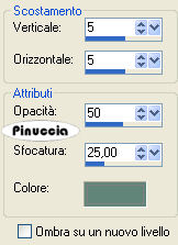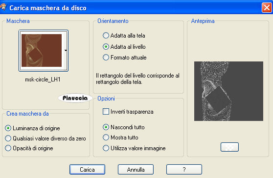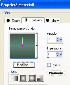 qui puoi trovare qualche risposta ai tuoi dubbi. Se l'argomento che ti interessa non è presente, ti prego di segnalarmelo. Questo tutorial è stato scritto con PSP X2, ma può essere eseguito anche con le altre versioni di PSP. Occorrente: Materiale qui I tubes che ho usato sono di Suzi Sgai, Jet, Silke (SKF) e Angie. Rispetta il lavoro degli autori e mantieni inalterati i tubes. Metti le maschere nella cartella Maschere. Apri il motivo Muster-silber e minimizzalo nella tua area di lavoro. Lo troverai nella lista dei motivi disponibili quando ti servirà. Imposta il colore di primo piano con un colore scuro e il colore di sfondo con un colore chiaro. Io ho usato #3f5447 e #62857a. Passa il colore di primo piano a Gradiente di primo piano/sfondo, con i seguenti settaggi: ![]() Apri una nuova immagine trasparente 800 x 600 pixels, e riempila con il gradiente.Livelli>Nuovo livello raster. Riempi anche questo livello con il gradiente.Livelli>Carica/Salva maschera>Carica maschera da disco. Cerca e carica la maschera msk-circle_LH1.jpg, con i seguenti settaggi: ![]() Livelli>Unisci>Unisci gruppo. avrai dei dubbi, perchè non vedrai niente. Aspetta il passo successivo prima di preoccuparti Effetti>Effetti 3D>Sfalsa ombra, con i seguenti settaggi: ![]() Sposta questo livello un po più a sinistra, contro il bordo.Facendo questo, sul lato opposto rimarrà una piccola striscia chiara sul bordo destro. Livelli>Nuovo livello raster. Attiva lo strumento Selezione a mano libera , da punto a punto, sfumatura e spianamento 0,e seleziona il quadrato della maschera: ![]() Riempi la selezione con il gradiente.Livelli>Nuovo livello raster. Passa il colore di sfondo a Motivi, e seleziona il motivo argento Muster-silber. ![]() Riempi il livello con il motivo argento.ricorda che hai impostato il motivo come colore di sfondo. Per riempire con il colore di sfondo, devi cliccare con il tasto destro del mouse. Se hai problemi a riempire uno spazio così ristretto attiva lo zoom o usa la rotellina del mouse per allargare l'immagineSelezione>modifica>contrai, di 1 pixel. Premi sulla tastiera il tasto CANC ![]() Mantieni selezionato. Posizionati sul livello sottostante. Livelli>Nuovo livello raster. Apri MAR-J2008-02.psp, e vai a Modifica>Copia. Torna al tuo lavoro e vai a Modifica>Incolla nella selezione. Selezione>Deseleziona. Attiva il livello Raster 3 (il livello del bordino argento). Livelli>Duplica. Sposta la copia del bordino in alto, usando le frecce della tastiera, in modo da evitare spostamenti orizzontali sull'uso delle frecce con lo strumento spostamento vedi qui Guarda il mio esempio per controllare lo spostamento. Livelli>Disponi>Sposta giù, e ripeti ancora 2 volte. ![]() ![]() Attiva il livello Raster 2. Livelli>Duplica. Sposta lo sfondo sulla cornice superiore.Livelli>Disponi>Sposta giù, e ripeti una volta. ![]() ![]() Apri SKF_BrokenHeart1912.07.psp. Immagine>Ridimensiona, al 30%, tutti i livelli non selezionato. Modifica>Copia. Torna al tuo lavoro e vai a Modifica>Incolla come nuovo livello. Sposta il cuore nella cornice superiore (vedi l'esempio finale).Cambia la modalità di miscelatura di questo livello in Luminanza (esistente). Attiva il livello Gruppo Raster 2 (la maschera). Apri jet-man1-januari-2008.psp, e vai a Modifica>copia. Torna al tuo lavoro e vai a Modifica>Incolla come nuovo livello. Sposta il tube un po' più in basso e a sinistra,(le spalle non devono toccare la cornice superiore). Livelli>Carica/Salva maschera>Carica maschera da disco. Cerca e carica la maschera Mask.jpg: ![]() Livelli>Unisci>Unisci gruppo. Cambia la modalità di miscelatura di questo livello in Luminanza (esistente), e abbassa l'opacità 1l 15%. Attiva il livello superiore. Apri SS_842_Misted.pspimage, e vai a Modifica>copia. Torna al tuo lavoro e vai a Modifica>Incolla come nuovo livello. Immagine>Ridimensiona, al 115%, tutti i livelli non selezionato. Sposta il tube nell'angolo in basso a destra.Livelli>Nuovo livello raster. Selezione>Seleziona tutto. Selezione>Modifica>Contrai di 1 pixel. Selezione>Inverti. Riempi la selezione con il motivo argento.Selezione>Deseleziona. Livelli>Unisci>Unisci tutto. Immagine>Ridimensiona, all'85%, tutti i livelli selezionato. Metti da parte l'immagine per il momento. Apri una nuova immagine trasparente 800 x 600 pixels, e riempila con il gradiente.Livelli>Nuovo livello raster. Riempi anche questo livello con il gradiente.Livelli>Carica/Salva maschera>Carica maschera da disco. Cerca e carica la maschera msk-circle_LH1.jpg, con i seguenti settaggi: ![]() Livelli>Unisci>Unisci gruppo. Effetti>Effetti 3D>Sfalsa ombra, con i seguenti settaggi: ![]() Sposta la maschera a sinistra contro il bordo.Attiva il righello: Visualizza>Righelli. Attiva lo strumento Selezione , rettangolo,e traccia una selezione più o meno come nell'esempio sotto. ![]() Premi sulla tastiera il tasto CANC ![]() Selezione>Deseleziona. Livelli>Duplica. Immagine>Rifletti. Potrebbe rimanere (questo dipende dalle misure della tua selezione) una piccola striscia al centro, come questa: ![]() In questo caso, usa le frecce della tastiera per spostare il livello al centro ed eliminare la striscia. Livelli>Nuovo livello raster. Selezione>Seleziona tutto. Selezione>Modifica>contrai, di 1 pixel. Selezione>Inverti. Riempi la selezione con il motivo argento.Selezione>Deseleziona. Attiva l'immagine che hai messo da parte prima e vai a Modifica>copia. Torna alla tua immagine di sfondo e vai a Modifica>Incolla come nuovo livello. Livelli>Duplica, e ripeti. Attiva il livello originale, Raster 2. Immagine>Ruota per gradi, 5 gradi a sinistra, tutti i livelli non selezionato. ![]() Effetti>Effetti 3D>Sfalsa ombra, con i seguenti settaggi, con il colore di sfondo: ![]() Ripeti l'Effetto Sfalsa ombra, ma cambiando verticale e orizzontale a -5. Attiva la prima copia di Raster 2. Immagine>Ruota per gradi, 5 gradi a destra, tutti i livelli non selezionato. ![]() Ripeti l'Effetto Sfalsa ombra, come prima. Attiva il livello superiore. 