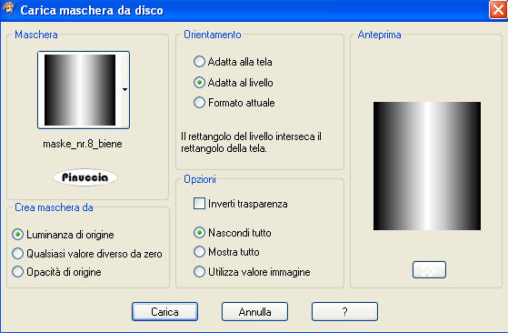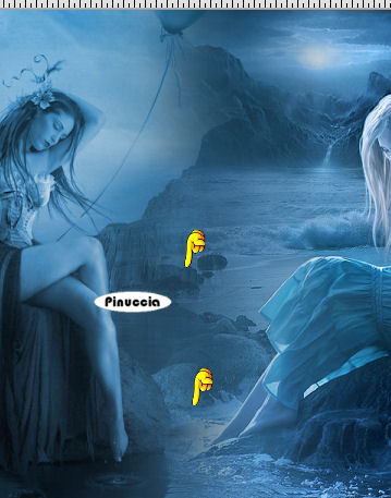 qui puoi trovare qualche risposta ai tuoi dubbi. Se l'argomento che ti interessa non è presente, ti prego di segnalarmelo. Questo tutorial è stato scritto con PSP X2, ma può essere eseguito anche con le altre versioni di PSP. Per tradurlo, ho usato PSP X. ©Biene - tutti i diritti riservati. Il © della traduzione è mio. Occorrente: A scelta due immagini o due tubes. Per il mio esempio ho usato due immagini http://elenadudina.deviantart.com/©Elena Dudina Il lavoro di Elena Dudina non può essere usato senza il permesso dell'autrice. *Thank you for the wonderful permission Elena!* Il resto del materiale qui Un ringraziamento ai creatori di tubes dei vari gruppi cui appartengo. Il watermark di ognuno è inserito nei tubes. Per favore, rispetta il lavoro degli autori: non cambiare il nome del file e non rimuovere il watermark. Il © appartiene agli artisti originali. ![]() Metti il pennello (composto da due files che non devono essere separati: sr_flowers_013.PspBrush e Brush-Tip) nella cartella Pennelli. Metti la maschera maske_nr.8 nella cartella Maschere. Imposta il colore di primo piano con #153a50, e il colore di sfondo con #5496c6. Passa il colore di primo piano a Gradiente. ![]() Apri una nuova immagine trasparente 650 x 450 pixels, e riempila con il gradiente.Apri la prima immagine (la mia Corazon_al_aire by Elena Dudina) e vai a Modifica>Copia. Torna al tuo lavoro e vai a Modifica>Incolla come nuovo livello. Immagine>Rifletti. Immagine>Ridimensiona, al 75%, tutti i livelli non selezionato. Regola>Messa a fuoco>Metti a fuoco. Posiziona correttamente l'immagine.Livelli>Carica/Salva maschera>Carica maschera da disco. Cerca e carica la maschera maske_nr.8_biene: ![]() Livelli>Unisci>Unisci gruppo. Sposta il livello contro il bordo a sinistra.Cambia la modalità di miscelatura di questo livello in Luminanza. Apri la seconda immagine (la mia Mar_de_rocas by Elena Dudina) e vai a Modifica>copia. Torna al tuo lavoro e vai a Modifica>Incolla come nuovo livello. Immagine>Ridimensiona, al 75%, tutti i livelli non selezionato. Regola>Messa a fuoco>Metti a fuoco. Livelli>Carica/Salva maschera>Carica maschera da disco. Carica nuovamente la maschera maske_nr.8, con gli stessi settaggi. Livelli>Unisci>Unisci gruppo. Sposta l'immagine a destra contro il bordo.Attiva lo strumento Gomma , dimensione 70, opacità 10,e cancella in alto il bordo della montagna e in basso l'acqua. ![]() Attiva il livello sottostante (per vedere meglio ingrandisci l'immagine al 200% circa), e cancella le parti che disturbano. ![]() Attiva il livello sottostante. Apri wolke_sirenessecrets.pspimage e vai a Modifica>Copia. Torna al tuo lavoro e vai a Modifica>Incolla come nuovo livello. Sposta le nuvole in alto contro il bordo.Non vedrai le nuvole perchè si trovano sotto le immagini: puoi usare le frecce della tastiera, oppure premere il tasto D per attivare lo strumento Deformazione che "ingabbierà" il tube. Livelli>Unisci>Unisci tutto. Immagine>Aggiungi bordatura, 1 pixel, simmetriche, con il colore di sfondo. Modifica>Copia. Apri background_sirenes_biene.jpg. Duplicalo usando la combinazione di tasti maiuscola+D e chiudi l'originale. Sulla copia: Modifica>Incolla come nuovo livello. Livelli>Nuovo livello raster. Attiva lo strumento Pennello ![]() cerca e seleziona il pennello sr_flower013, imposta la dimensione a 150, e applicalo nell'angolo in alto a sinistra, cliccando con il tasto destro del mouse per usare il colore chiaro di sfondo. Effetti>Effetti di bordo>Aumenta. Livelli>Duplica. Immagine>Rifletti. Livelli>Unisci>Unisci giù. Livelli>Duplica. Immagine>Capovolgi. Livelli>Unisci>Unisci giù. Aggiungi il tuo nome e/o il tuo watermark senza dimenticare eventuali copyright delle immagini usate. Livelli>Unisci>Unisci tutto. Immagine>Aggiungi bordatura, 1 pixel, simmetriche, con il colore di sfondo. Se hai problemi o dubbi, o trovi un link non funzionante, o anche soltanto per un saluto, scrivimi.