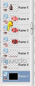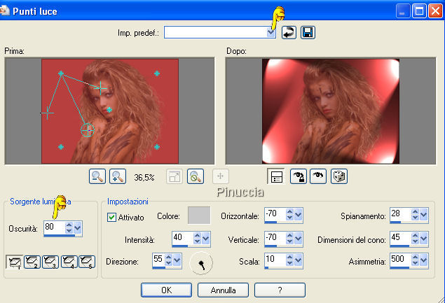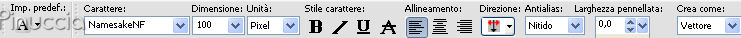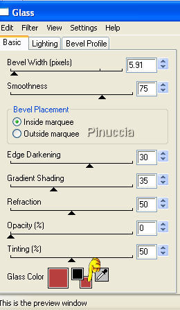 qui puoi trovare qualche risposta ai tuoi dubbi. Se l'argomento che ti interessa non è presente, ti prego di segnalarmelo. Questo tutorial è stato scritto con PSP X, ma può essere eseguito anche con le altre versioni di PSP. Per realizzare l'animazione ti servirà anche Animation Shop qui Occorrente: Il tube di una bella donna. Il resto del materiale qui Apri il font NamesakeNF e minimizzalo nella tua area di lavoro. Lo troverai nella lista dei font disponibili, quando ti servirà. Il tube che ho usato per il mio esempio è di Jet. Filtri: Eye Candy 4000 qui Apri una nuova immagine trasparente 537 x 411 pixels. Scegli dal tuo tube un colore scuro come colore di primo piano. Io ho usato #b7403f. Imposta il colore di sfondo con il nero. Livelli>Nuovo livello raster. Riempi questo livello con #b7403f.Apri il tube della donna che hai deciso di usare, e vai a Modifica>Copia. Torna al tuo lavoro e vai a Modifica>Incolla come nuovo livello. Abbassa l'opacità di questo livello al 50%. Chiudi il livello trasparente (Raster 1). Livelli>Unisci>Unisci visibile. Selezione>Seleziona tutto. Selezione>Modifica>Contrai di 2 pixels. Selezione>Inverti. Riempi la selezione con il nero.Selezione>Deseleziona. Selezione>Seleziona tutto. Selezione>Modifica>contrai, di 1 pixel. Selezione>Inverti. Riempi la selezione con il colore di primo piano.Selezione>Deseleziona. Effetti>Effetti di illuminazione>Punti luce: apri il menu delle impostazioni, e seleziona Predefinite, poi cambia Oscurità a 80. ![]() Effetti>Effetti geometrici>Prospettiva orizzontale: ![]() Modifica>Copia. Apri una nuova immagine trasparente 541 x 415 pixels. Modifica>Incolla come nuovo livello. Togli la visibilità a questo livello. Torna all'immagine più piccola. Modifica>Annulla azione Prospettiva orizzontale. Modifica>Annulla azione Punti luce. Ripeti: Effetti>Effetti di illuminazione>Punti luce, con i settaggi precedenti, ma portando l'Oscurità a 70. Effetti>Effetti geometrici>Prospettiva orizzontale, con i settaggi precedenti. Modifica>Copia. Torna all'ultima immagine aperta (541x415) e vai a Modifica>Incolla come nuovo livello. Togli la visibilità a questo livello. Attiva nuovamente l'immagine piccola. Modifica>Annulla azione Prospettiva orizzontale. Modifica>Annulla azione Punti luce. Ripeti: Effetti>Effetti di illuminazione>Punti luce, portando l'oscurità a 60. Effetti>Effetti geometrici>Prospettiva orizzontale, con i settaggi precedenti. Modifica>Copia. Ritorna all'immagine 541x415 e vai a Modifica>Incolla come nuovo livello. Togli la visibilità a questo livello. Immagine>Dimensione tela - 801 x 501 pixels. ![]() Posizionati nuovamente sul livello Raster 1. Riempi il livello con il nero.Apri il tube della donna e vai a Modifica>Copia. Torna al tuo lavoro e vai a Modifica>Incolla come nuovo livello. Sposta il tube a sinistra.Effetti>effetti 3D>Sfalsa ombra: ![]() Ripeti l'Effetto Sfalsa ombra, ma cambiando verticale e orizzontale a -5. Apri Bild63.psp. Immagine>Scala di grigi. Modifica>Copia. Torna al tuo lavoro e vai a Modifica>Incolla come nuovo livello. Immagine>Rifletti. Sposta il tube nell'angolo in basso a destra.Attiva il livello Raster 1. Livelli>Nuovo livello raster. Selezione>Seleziona tutto. Selezione>Modifica>Contrai, di 1 pixel. Selezione>inverti. Riempi la selezione con il colore di primo piano.Selezione>Deseleziona. Livelli>Disponi>Porta in alto. Immagine>Dimensione tela - 801 x 601 pixels e clicca sulla freccia in alto a destra. ![]() Clicca con la bacchetta magica sul livello Raster 1, nella parte trasparente.Attiva il livello con la fotografa e premi sulla tastiera il tasto CANC ![]() nel caso che anche il tuo tube avesse una parte visibile in questo spazio, attiva il livello del tube e premi sulla tastiera il tasto canc. Attiva il livello Raster 1. Livelli>Nuovo livello raster. Riempi la selezione con il colore di primo piano.Selezione>Modifica>Contrai, di 1 pixel. Riempi la selezione con il nero.Selezione>Deseleziona. Livelli>Nuovo livello raster. Selezione>Seleziona tutto. Selezione>Modifica>Contrai, di 1 pixel. Selezione>inverti. Riempi la selezione con il colore di primo piano.Selezione>Deseleziona. Attiva lo strumento testo ,Passa il colore rosso a colore di sfondo. seleziona il font NamesakeNF, dimensione 100, crea come vettore. ![]() Scrivi "Put me in the Spotlight" o il testo che preferisci, e posizionalo nella parte nera. Livelli>Converti in livello raster. Effetti>Plugins>Eye Candy 4000 - Glass: cliccando sulla piccola paletta con il colore per impostare questo colore nella paletta più grande. ![]() Aggiungi il tuo nome e/o il tuo watermark. Posizionati sul livello Raster 1. Attiva lo strumento Pennello ![]() cerca e seleziona il pennello Sterjes e applicalo con il colore rosso sull'immagine. avendo passato il rosso a colore di sfondo per aggiungere il testo, applica il pennello cliccando con il tasto destro del mouse E' il momento di unire i livelli per creare l'animazione. Apri il primo livello con l'Effetto punti luce (Raster 2), e chiudi gli altri due livelli. ![]() Modifica>Copia unione. Apri Animation Shop e vai a Modifica>Incolla>Incolla come nuova animazione. Torna in PSP. Chiudi il primo livello con i Punti luce, e apri il secondo (Raster 3). ![]() Modifica>Copia Unione. Torna in Animation Shop e vai a Modifica>Incolla>Incolla dopo il fotogramma corrente. Di nuovo in PSP. Chiudi il secondo livello con i Punti luce e apri il terzo (Raster 4). ![]() Modifica>Copia unione. Di nuovo in Animation Shop e vai a Modifica>Incolla>Incolla dopo il fotogramma corrente. Ecco pronta la tua animazione composta da tre fotogrammi. Clicca sul primo fotogramma per selezionarlo e vai a Modifica>Seleziona tutto. Animazione>Proprietà fotogramma, e imposta la velocità a 100. ![]() ![]() ![]() ![]() Se hai problemi o dubbi, o trovi un link non funzionante, o anche soltanto per un saluto, scrivimi. 13 Novembre 2007 |