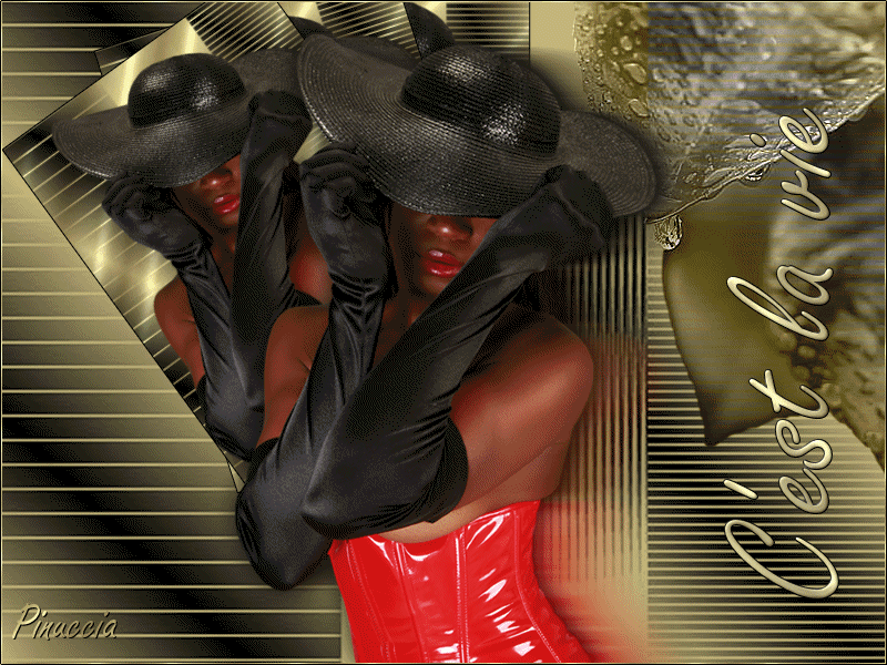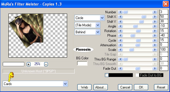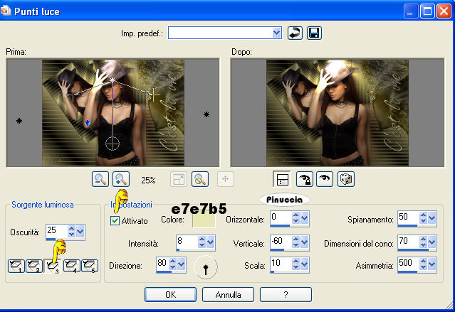 Inverti i colori nella paletta dei materiali:![]() scegli un bel font. Io ho usato Freestyle script, dimensione 150 pixels. ![]() Scrivi il tuo testo. Immagine>Ruota per gradi - 90 gradi a sinistra, tutti i livelli non selezionato. ![]() Sposta il testo a destra.Livelli>Converti in livello raster. Effetti>Effetti 3D>Smusso a incasso: ![]() Livelli>Nuovo livello raster. Selezione>Seleziona tutto. Selezione>Modifica>contrai, di 2 pixels. Selezione>Inverti. Riempi con il motivo oro.Effetti>Plugins>Bordermania, con i seguenti settaggi: ![]() Selezione>Deseleziona. Attiva il livello Gruppo Raster 1. ![]() Attiva l'immagine che hai messo da parte prima e vai a Modifica>Copia. Torna al tuo lavoro e vai a Modifica>Incolla come nuovo livello. Sposta l'immagine un po' più in alto.![]() attivando lo strumento Puntatore ,quando il mouse prende la forma dello spostamento ,ti sarà più facile spostare l'immagine che si trova su un livello inferiore. Effetti>Plugins>Mura's Meister - Copies: ![]() Se vuoi, questo è il momento di firmare il tuo lavoro. Livelli>Unisci>Unisci tutto. Livelli>Duplica, e ripeti 2 volte. Attiva il livello della prima copia. Effetti>Effetti di illuminazione>Punti luce. ![]() Chiudi questo livello (anche se lo lasci aperto, non fa differenza). Attiva il livello della seconda copia. Ripeti l'Effetto Punti luce, cambiando l'intensità a 11. Chiudi questo livello. Attiva il livello originale di sfondo e vai a Modifica>Copia. Apri Animation Shop e vai a Modifica>Incolla>Incolla come nuova animazione. Torna in PSP. Apri e attiva il livello della prima copia e vai a Modifica>Copia. Torna in Animation Shop e vai a Modifica>Incolla>Incolla dopo il fotogramma corrente. Di nuovo in PSP. Apri e attiva il livello della seconda copia e vai a Modifica>Copia. Per finire in Animation Shop: Modifica>Incolla>Incolla dopo il fotogramma corrente. Ed ecco la tua animazione composta da tre fotogrammi. Modifica>Seleziona tutto. Animazione>Proprietà fotogramma e e imposta la velocità a 30. ![]() Controlla il risultato cliccando su Visualizza , e salva in formato gif.Ecco l'esempio senza animazione: ![]() Ed ecco un altro esempio (anche per questo ho usato un tube di Jet). ![]() ![]() Se hai problemi o dubbi, o trovi un link non funzionante, o anche soltanto per un saluto, scrivimi 11 Gennaio 2008 |