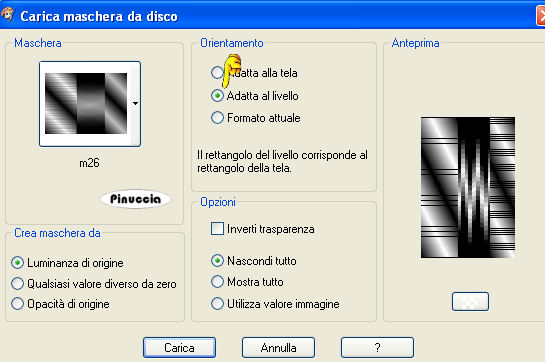 qui puoi trovare qualche risposta ai tuoi dubbi. Se l'argomento che ti interessa non è presente, ti prego di segnalarmelo. Questo tutorial è stato scritto con PSP X, ma può essere eseguito anche con le altre versioni di PSP. Occorrente: Il tube di una donna. Il resto del materiale qui Metti la maschera nella cartella Maschere. Metti il motivo oro nella cartella Motivi. Se lo apri in PSP e lo minimizzi nella tua area di lavoro, lo troverai nella lista dei motivi disponibili, quando ti servirà. Rispetta il lavoro degli autori e mantieni inalterati i tubes. Filtri: Bordermania qui Mura's Meister - Copies qui Ti servirà anche Animation Shop qui Imposta il colore di primo piano con il motivo oro, e il colore di sfondo con il nero. ![]() Apri una nuova immagine trasparente 280 x 420 pixels. Questo significa che il tube che sceglierai dovrà essere più lungo che largo. Poi lo potrai ridimensionare, per adattarlo alla tela. Riempi l'immagine con il motivo oro.Livelli>Nuovo livello raster. Riempi questo livello con il nero.ricorda che, per riempire con il colore di sfondo, devi cliccare con il tasto destro del mouse. Livelli>Carica/Salva maschera>Carica maschera da disco. Cerca e carica la maschera m26: ![]() Livelli>Unisci>Unisci gruppo. Apri il tuo tube e vai a Modifica>Copia. Torna al tuo lavoro e vai a Modifica>Incolla come nuovo livello. per il mio esempio ho usato un tube di Jet e l'ho ridimensionato al 70% Posiziona il tube adeguatamente sull'immagine.Livelli>Nuovo livello raster. Selezione>Seleziona tutto. Selezione>Modifica>Contrai, di 1 pixel. Selezione>Inverti. Riempi con il nero.Selezione>Deseleziona. Livelli>Unisci>Unisci tutto. Metti da parte l'immagine per il momento. Apri una nuova immagine BIANCA 800 x 600 pixels, e riempila con il motivo oro.Regola>Sfocatura>Sfocatura gaussiana, raggio 30: ![]() Livelli>Nuovo livello raster. Riempi il livello con il nero.Livelli>Carica/Salva maschera>Carica maschera da disco. Cerca e carica la maschera m26, con i settaggi precedenti. Livelli>Unisci>Unisci gruppo. Apri il tuo tube e vai a Modifica>Copia. Torna al tuo lavoro e vai a Modifica>Incolla come nuovo livello. Livelli>Duplica. Attiva il livello originale del tube. Effetti>Effetti di distorsione>Vento: ![]() Attiva il livello della copia del tube. Effetti>Effetti 3D>sfalsa ombra: ![]() Ripeti l'Effetto Sfalsa ombra, ma cambiando verticale e orizzontale a -5. Apri SKF_Bottle259.07.psp. Posizionati sul livello del tube. Attiva lo strumento Selezione a mano libera , da punto a punto,sfumatura 0, e traccia una selezione come mostrato nella schermata sotto: ![]() Modifica>Copia. Torna al tuo lavoro e vai a Modifica>Incolla come nuovo livello. Immagine>Rifletti. Sposta il tube nell'angolo in alto a destra.Cambia la modalità di miscelatura di questo livello in Luminanza (esistente). ![]() Attiva lo strumento Testo