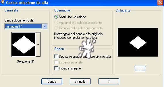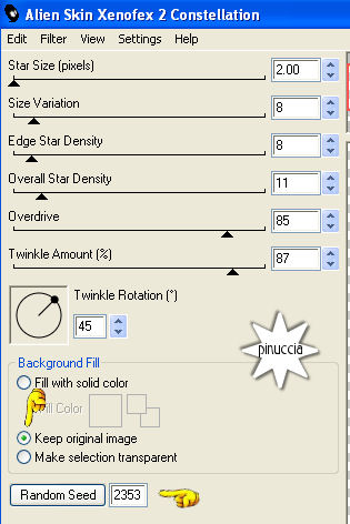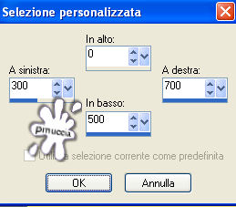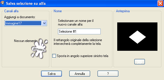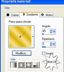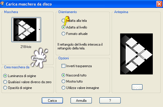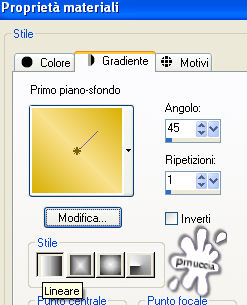 qui puoi trovare qualche risposta ai tuoi dubbi. Se l'argomento che ti interessa non è presente, ti prego di segnalarmelo. Questo tutorial è stato scritto con PSP X2, ma può essere eseguito anche con le altre versioni di PSP. Per tradurlo, l'ho eseguito con PSP X. Occorrente: Materiale qui I tubes che ho usato sono di Angie, Fredo e MTM(Brigitte). La maschera è di Kris Rispetta il lavoro degli autori e mantieni inalterati i tubes. Filtri: Penta.com VTR2 qui Texture qui Alien Skin Xenofex qui Ti servirà anche Animation Shop qui Metti la maschera 218-kris.Pspmask nella cartella Maschere. Imposta il colore di primo piano con #d9b004, e il colore di sfondo con #f8e18e. Passa il colore di primo piano a Gradiente di primo piano/sfondo, con i seguenti settaggi: ![]() fai attenzione: dovrai cambiare spesso da gradiente a colore e viceversa, a seconda delle istruzioni Apri una nuova immagine trasparente 700 x 500 pixels, e riempila con il gradiente.Livelli>Nuovo livello raster. Attiva lo strumento Selezione , rettangolo, sfumatura 0,clicca sull'icona Selezione personalizzata ![]() e imposta i seguenti settaggi: ![]() Riempi la selezione con il colore di primo piano.Selezione>Deseleziona. Livelli>Carica/Salva maschera>Carica maschera da disco. Cerca e carica la maschera 218-kris.PspMask: ![]() Effetti>Effetti di bordo>Aumenta. Livelli>Unisci>Unisci gruppo. Se non hai visibile il righello, vai a Visualizza>Righelli, e sposta la forma in modo che si trovi esattamente al centro dell'immagine (350 pixels).![]() Livelli>Duplica. Immagine>Rifletti. Adesso non dovrebbe esserci alcuna linea bianca al centro: ![]() Livelli>Unisci>Unisci giù. Attiva lo strumento Selezione a mano libera , sfumatura e spianamento 0,e seleziona il quadrato al centro. ![]() Selezione>Salva/Carica selezione>Salva selezione su canale alfa, dai un nome alla selezione - puoi anche lasciare quello che trovi - e clicca Salva. ![]() Livelli>Nuovo livello raster. Selezione>Modifica>Espandi di 1 pixel. Riempi la selezione con il colore di primo piano.Selezione>Modifica>Contrai, di 2 pixels. Premi sulla tastiera il tasto CANC ![]() Mantieni selezionato. Riempi la selezione con il gradiente.Selezione>Deseleziona. Apri FL-NOV2007-02.psp, e vai a Modifica>Copia. Torna al tuo lavoro e vai a Modifica>Incolla come nuovo livello. Immagine>Rifletti. Immagine>Ridimensiona, al 70%, tutti i livelli non selezionato. Sposta il fiore dentro il quadrato centrale.Selezione>Carica/Salva selezione>Carica selezione da canale alfa. E' presente la selezione che hai salvato prima. Clicca Carica. ![]() Selezione>Modifica>Contrai, di 2 pixels. Selezione>Inverti. Premi sulla tastiera il tasto CANC. Selezione>Deseleziona. Livelli>Nuovo livello raster. Attiva lo strumento Selezione a mano libera ![]() e seleziona il primo dei piccoli quadrati a sinistra. ![]() Riempi la selezione con il gradiente.Selezione>Deseleziona. Livelli>Duplica, e sposta il quadrato sulla forma successiva.Duplica nuovamente e sposta sul quadrato successivo, e ripeti fino a riempire i quadrati del lato sinistro.![]() Livelli>Unisci>Unisci giù, e ripeti per quattro volte. In questo modo avrai i cinque quadrati del lato sinistro in un unico livello. Livelli>Duplica. Immagine>Rifletti. Livelli>Unisci>Unisci giù. Rinomina questo livello Trama. Selezione>Seleziona tutto. Selezione>Mobile. Selezione>Modifica>Espandi, di 2 pixels. Livelli>Nuovo livello raster. Riempi i quadrati con il colore di primo piano.Selezione>Modifica>Contrai, di 2 pixels. Premi sulla tastiera il tasto CANC. Mantieni selezionato. Posizionati sul livello Trama. Effetti>Plugins>Texture - Texturizer: ![]() Effetti>Effetti di bordo>Aumenta. Selezione>Deseleziona. Livelli>Duplica. Livelli>Disponi>Sposta giù. Regola>Sfocatura>Sfocatura gaussiana, raggio 20: ![]() Effetti>Plugins>Penta.com - VTR2, con i settaggi standard. ![]() Cambia la modalità di miscelatura di questo livello in Luce Netta. Apri Mtm-photos 50-small- tube-27 feb 20071.pspimage, e vai a Modifica>Copia. Torna al tuo lavoro e vai a Modifica>Incolla come nuovo livello. Sposta il tube completamente a destra.Livelli>Duplica. Livelli>Disponi>Sposta giù. Regola>Sfocatura>Sfocatura gaussiana, raggio 20. Effetti>Plugins>Penta.com - VTR 2, con i settaggi standard. Cambia la modalità di miscelatura di questo livello in Luce netta. Livelli>Duplica. Cambia la modalità di miscelatura di questeo livello in Filtra. Attiva il livello superiore. Effetti>effetti 3D>Sfalsa ombra, con i seguenti settaggi, colore nero. ![]() Apri fredo_design_nature0056.pspimage, e vai a Modifica>copia. Torna al tuo lavoro e vai a Modifica>Incolla come nuovo livello. Immagine>Ridimensiona, all'85%, tutti i livelli non selezionato, per 2 volte. Sposta il tube in basso a sinistra.Livelli>Duplica. Livelli>Disponi>Sposta giù. Regola>Sfocatura>Sfocatura gaussiana, raggio 20. Cambia la modalità di miscelatura di questo livello in Indebolisci. Attiva il livello superiore. Immagine>Ridimensiona, all'85%, tutti i livelli non selezionato. Sistema il tube sull'angolo.Effetti>Effetti 3D>Sfalsa ombra, con i settaggi precedenti. Attiva lo strumento Testo e scegli un bel font.Io ho usato il font Tobacco NF, con i seguenti settaggi: ![]() Scrivi il tuo testo. Rinomina questo livello Testo. Livelli>Converti in livello raster. Selezione>Seleziona tutto. Selezione>mobile. Selezione>Modifica>Seleziona bordature selezione: ![]() Modifica>Copia. Livelli>Nuovo livello raster e rinomina questo livello Bling. Modifica>Incolla nella selezione. Livelli>Duplica, e ripeti. Attiva il livello Bling. Effetti>Plugins>Alien Skin - Xenofex 2 - Constellation, con i seguenti settaggi: ![]() Attiva il livello della prima copia di Bling. Ripeti l'Effetto Constellation, con gli stessi settaggi, ma cliccando una volta su Random Seed. Chiudi questo livello. Attiva il livello della seconda copia di Bling. Ripeti l'Effetto Constellatin, cliccando su Random Seed. Chiudi questo livello. Attiva il livello Testo. Effetti>Effetti 3D>Sf
