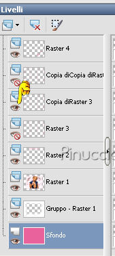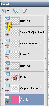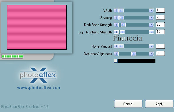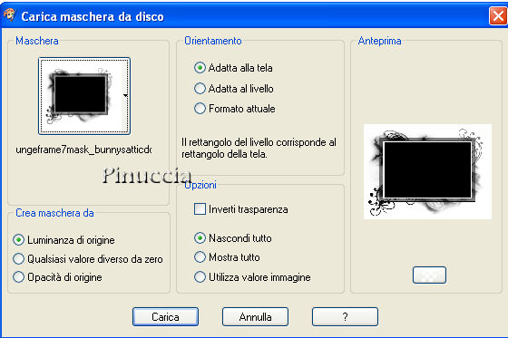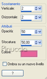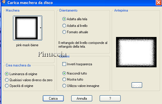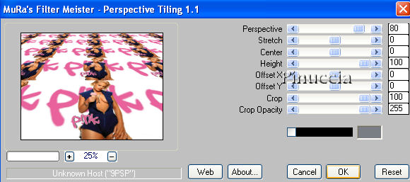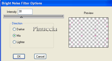 qui puoi trovare qualche risposta ai tuoi dubbi. Se l'argomento che ti interessa non è presente, ti prego di segnalarmelo. Questo tutorial è stato scritto con PSP X, ma può essere eseguito anche con le altre versioni di PSP. Occorrente: Materiale qui Metti le maschere nella cartella Maschere di PSP. Non conosco l'autore dell'immagine Zed_Musique_01316.jpg. Se mi verrà comunicato, all'autore sarà dato il proprio credito. Per favore, rispetta il lavoro degli autori e mantieni i tubes al loro stato originale. Filtri: Photoeffex qui DSB Flux qui Mura's Meister - Perspective Tile qui Ti servirà anche Animation Shop qui Apri l'immagine Zed_Musique_01316.jpg. attenzione, apri l'immagine, non il tube. Duplica l'immagine con shift+D e chiudi l'originale. Effetti>Plugins>Mura's Meister - Perspective Tiling, con i settaggi standard. ![]() Scegli dall'immagine un colore e impostalo come colore di primo piano. Imposta come colore di sfondo il bianco. Io ho scelto come colore di primo piano #e9629c. Livelli>Nuovo livello raster. Riempi il livello con il colore di primo piano.Effetti>Plugins>Photoeffects - Scanlines, con i settaggi standard. ![]() Livelli>Carica/Salva maschera>Carica maschera da disco. Cerca e carica la maschera cat132.jpg. ![]() Livelli>Unisci>Unisci gruppo. Attiva il livello di sfondo. Livelli>Nuovo livello raster. Riempi con il bianco.Abbassa l'opacità di questo livello al 45%. Attiva nuovamente il livello superiore. Livelli>Unisci>Unisci giù. Ripeti Livelli>Unisci>Unisci giù. Livelli>Nuovo livello raster. Riempi con il bianco.Attiva il livello di sfondo e vai a Livelli>Innalza livello di sfondo. Livelli>Disponi>Porta in alto. Livelli>Carica/Salva maschera>Carica maschera da disco. Cerca e carica la maschera pink-mask-biene.jpg, con i settaggi standard. ![]() Livelli>Unisci>Unisci gruppo. Effetti>Effetti 3D>Sfalsa ombra, con i seguenti settaggi: ![]() Apri il tube Zed_Musique_pink_biene.pspimage, e vai a Modifica>Copia. Torna al tuo lavoro e vai a Modifica>Incolla come nuovo livello. Effetti>Effetti 3D>Sfalsa ombra, con i seguenti settaggi: ![]() Immagine>Aggiungi bordatura, 1 pixel, simmetriche, con il colore di primo piano. Immagine>Aggiungi bordatura, 1 pixel, simmetriche, con il colore di sfondo. Immagine>Aggiungi bordatura, 1 pixel, simmetriche, con il colore di primo piano. Immagine>Ridimensiona, al 76%, tutti i livelli selezionato. Metti da parte l'immagine, per il momento. Apri una nuova immagine bianca 804 x 604 pixels, e riempila con il colore di primo piano.Livelli>Nuovo livello raster. Riempi il nuovo livello con il bianco.Livelli>Carica/Salva maschera>Carica maschera da disco. Cerca e carica la maschera Grungefram7mask_bunnys. ![]() Livelli>Unisci>Unisci gruppo. Attiva l'immagine che hai messo da parte prima e vai a Modifica>Copia. Torna alla nuova immagine 804-604 pixels, e vai a Modifica>Incolla come nuovo livello. Posiziona l'immagine un po' a sinistra, in modo che copra la vecchia cornice della maschera.Effetti>Effetti 3D>Sfalsa ombra, con i seguenti settaggi, con il colore rosa di primo piano: ![]() Attiva lo strumento Testo ,seleziona un font e scrivi il tuo testo. Io ho usato il font Andes, vettore, colore di sfondo impostato con il colore rosa, pennellata 1. Livelli>Converti in livello raster. Effetti>Effetti 3D>Sfalsa ombra, con i settaggi usati per la maschera. ![]() Apri accent stars gray~KRS.psp, e vai a Modifica>Copia. Torna al tuo lavoro e vai a Modifica>Incolla come nuovo livello. Regola>Saturazione e tonalità>Viraggio, con i seguenti settaggi. ![]() Posiziona le stelle in alto a sinistra.Livelli>Duplica. Immagine>Rifletti. Livelli>Unisci>Unisci giù. Livelli>Duplica. Immagine>Capovolgi. Livelli>Unisci>Unisci giù. *** Se non vuoi animare la tag, non duplicare adesso i livelli e applica il filtro una sola volta. *** Per animare la tag: Duplica il livello uniti (Livelli>Duplica) 2 volte. Attiva il primo livello. Effetti>Plugins>DSB Flux - Bright Noise, con i seguenti settaggi. ![]() Attiva il livello successivo e ripeti l'Effetto Bright Noise, ma con il valore 40. Chiudi questo livello. Attiva il livello successivo e applica l'Effetto Bright Noise con il valore 50. Chiudi questo livello. Apri PastelStarz~Smerfy.psp e posizionati sul livello Layer 1. Modifica>Copia. Torna al tuo lavoro e vai a Modifica>Incolla come nuovo livello. Immagine>Capovolgi. Posiziona il tube in basso a destra.Livelli>Duplica. Immagine>Rifletti. Aggiungi il tuo nome e/o il tuo watermark. Immagine>Dimensione tela 806 x 606 pixels, . Attenzione, il colore di sfondo deve essere bianco. ![]() Adesso dovrai unire i livelli per creare l'animazione. Chiudi le copie del livello al quale hai applicato il filtro Bright Noise. ![]() Modifica>Copia Unione. Apri Animation Shop e vai a Modifica>Incolla>Incolla come nuova animazione. Torna in PSP. Chiudi il livello originale del filtro e rendi visibile la prima copia. ![]() Torna in Animation Shop e vai a Modifica>Incolla>Incolla dopo il fotogramma corrente. Ancora in PSP. Chiudi il livello della prima copia e rendi visibile il livello della seconda copia. ![]() Modifica>Copia Unione. Ancora una volta in Animation Shop e vai a Modifica>Incolla>Incolla dopo il fotogramma corrente. Hai finito. Controlla il risultato cliccando su Visualizza e salva in formato gif.Ecco il risultato senza animazione. ![]() ![]() Se hai problemi o dubbi, o trovi un link non funzionante, o anche soltanto per un saluto, scrivimi. 15 Novembre 2007 |