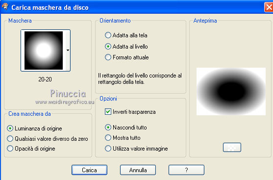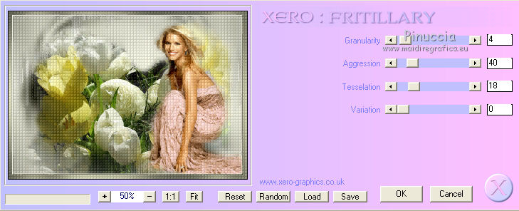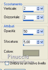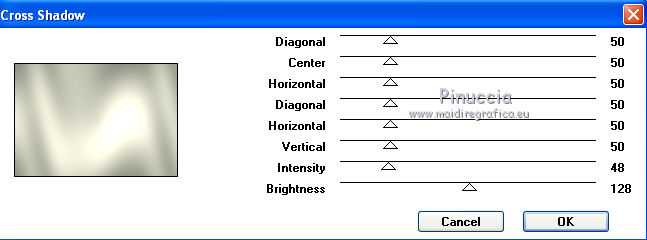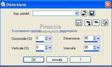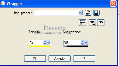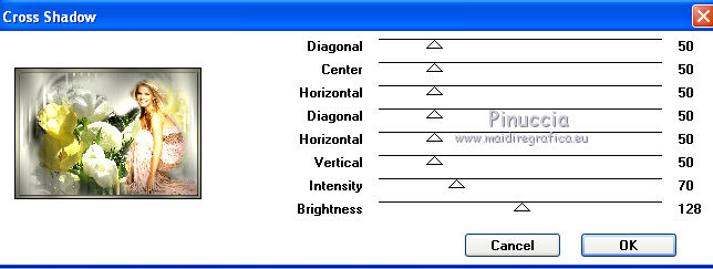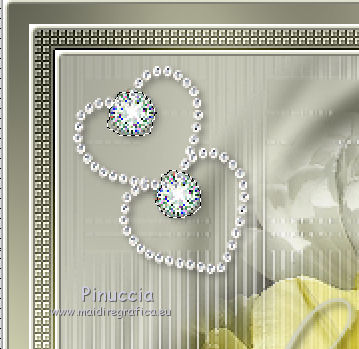 qui puoi trovare qualche risposta ai tuoi dubbi. Se l'argomento che ti interessa non è presente, ti prego di segnalarmelo. Questo tutorial è stato scritto con PSP X2, ma può essere eseguito anche con le altre versioni di PSP. Per tradurlo, ho usato PSP X. ©Biene - tutti i diritti riservati. Il © della traduzione è mio. Occorrente: Un tube a scelta. Il resto del materiale qui Per i miei esempi ho usato tubes di Anna.br e Alexandre Marques. Ho usato anche un tube ©Rainer Sturm e tube di Colombe e Patry. Un ringraziamento ai creatori di tubes dei vari gruppi cui appartengo. Il watermark di ognuno è inserito nei tubes. Per favore, rispetta il lavoro degli autori: non cambiare il nome del file e non rimuovere il watermark. Il © appartiene agli artisti originali. Filtri: Xero - Fritillary qui Graphics Plus - Cross Shadow qui Metti la maschera 20.20 nella cartella Maschere. Metti il pennello wordartspring.PspBrush assieme al suo script BrushTip (vedi sui Pennelli qui) nella cartella Pennelli. Apri il resto del materiale in PSP. Imposta il colore di primo piano con #c2c2b2, e il colore di sfondo con #a6a68e. Apri una nuova immagine trasparente 650 x 450 pixels, e riempila con il colore di primo piano #c2c2b2.Livelli>Duplica. Effetti>Plugins>Graphics Plus - Cross Shadow: ![]() Regola>Sfocatura>Sfocatura gaussiana - raggio 10. ![]() Abbassa l'opacità di questo livello al 57%. Apri PatryMists_06_Flowers_162.psd e vai a Modifica>Copia. Torna al tuo lavoro e vai a Modifica>Incolla come nuovo livello. Regola>Sfocatura>Sfocatura gaussiana - raggio 10. ![]() Effetti>Effetti di distorsione>Distorsione. ![]() Regola>Tonalità e saturazione>Viraggio. ![]() Cambia la modalità di miscelatura di questo livello in Luminanza (esistente). Apri AH_RainerSturm_pixelio_20091.psp e vai a Modifica>Copia. Torna al tuo lavoro e vai a Modifica>Incolla come nuovo livello. Sposta l'immagine un po' più in basso e a sinistra.Livelli>Nuovo livello raster. Selezione>Seleziona tutto. Apri after_hours_bg_lines.psd e vai a Modifica>Copia. Torna al tuo lavoro e vai a Modifica>Incolla nella selezione. Effetti>Effetti di bordo>Aumenta. Selezione>Deseleziona. Livelli>Carica/Salva maschera>Carica maschera da disco. Cerca e carica la maschera 20.20. ![]() Livelli>Unisci>Unisci gruppo. Apri il tuo tube e vai a Modifica>copia. Torna al tuo lavoro e vai a Modifica>Incolla come nuovo livello. Spostalo a destra.Livelli>Duplica. Regola>Sfocatura>Sfocatura gaussiana - raggio 10. Effetti>Effetti di distorsione>Vento - da sinistra, intensità 100. ![]() Cambia la modalità di miscelatura di questo livello in Luminanza (esistente). naturalmente, dovrai valutare questo settaggio in base al tube che hai scelto di usare Livelli>Unisci>Unisci tutto. Selezione>Seleziona tutto. Livelli>Nuovo livello raster. Riempi la selezione con il colore di primo piano.Selezione>Modifica>Contrai - 3 pixels. Premi sulla tastiera il tasto CANC. Selezione>Inverti. Effetti>Effetti 3D>Smusso a incasso. ![]() Selezione>Deseleziona. Selezione>Seleziona tutto. Immagine>Aggiungi bordatura, 10 pixels, simmetriche, con il colore di sfondo. Selezione>Inverti. Effetti>Plugins>Graphics Plus - Cross Shadow. ![]() Effetti>Plugins>Xero - Fritillary: ![]() Effetti>Effetti di bordo>Aumenta. Selezione>Deseleziona. Selezione>Seleziona tutto. Immagine>Aggiungi bordatura, 3 pixels, simmetriche, con il colore di primo piano. Selezione>Inverti. Effetti>Effetti 3D>Smusso a incasso, con i settaggi precedenti. Selezione>Seleziona tutto. Immagine>Aggiungi bordatura, 10 pixels, simmetriche, con il colore di sfondo. Selezione>Inverti. Effetti>Plugins>Graphics Plus - Cross Shadow, con i settaggi precedenti. Selezione>Seleziona tutto. Immagine>Aggiungi bordatura, 3 pixels, simmetriche, con il colore di primo piano. Selezione>Inverti. Effetti>Effetti 3D>Smusso a incasso, con i settaggi precedenti. Selezione>Deseleziona. Imposta il colore di primo piano con #929276. Livelli>Nuovo livello raster. Attiva lo strumento Pennello ![]() cerca e seleziona il pennello wordartspring.PspBrush, e applicalo a sinistra cliccando una volta con il tasto sinistro del mouse per usare il colore di primo piano. Effetti>Plugins>Graphics Plus - Cross Shadow, con i settaggi precedenti. Effetti>Effetti 3D>Sfalsa ombra, con il colore nero. ![]() Livelli>Duplica, e abbassa l'opacità di questo livello al 30%. Apri cuori.psp e vai a Modifica>Copia. Torna al tuo lavoro e vai a Modifica>Incolla come nuovo livello. Sposta questo tube in alto a sinistra.Attiva lo strumento Selezione a mano libera , da punto a punto,e seleziona i due diamanti blu. ![]() Regola>Tonalità e saturazione>Viraggio. ![]() Selezione>Deseleziona. Effetti>Effetti 3D>Sfalsa ombra, con il colore di sfondo. ![]() Aggiungi il tuo nome e/o il tuo watermark, senza dimenticare eventuali copyright delle immagini usate. Livelli>Unisci>Unisci tutto e salva in formato jpg. ![]() Se hai problemi o dubbi, o trovi un link non funzionante, o anche soltanto per un saluto, scrivimi.