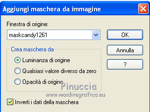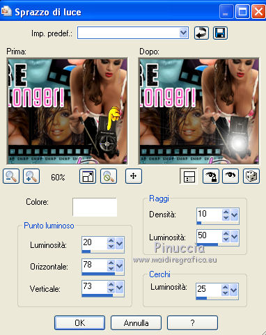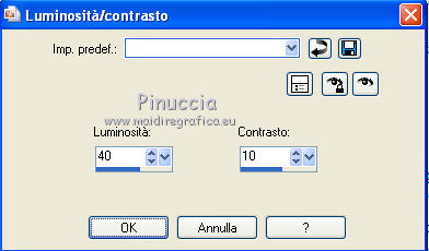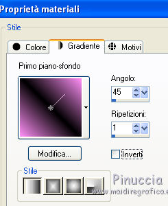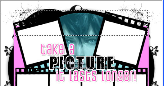 qui puoi trovare qualche risposta ai tuoi dubbi. Se l'argomento che ti interessa non è presente, ti prego di segnalarmelo. Questo tutorial è stato scritto con PSP X2, ma può essere eseguito anche con le altre versioni di PSP. Per tradurlo, ho usato PSP X. ©Biene - tutti i diritti riservati. Il © della traduzione è mio. Occorrente: A scelta il tube di una donna e alcuni tubes di visi. I tubes che ho usato per i miei esempi sono di Maryse e Lori Rhae. Il Template 115 di Yvette che puoi scaricare https://www.blogger.com/blogin.g?blogspotURL=http%3A%2F%2Fessenceofcreativity1.blogspot.com%2F" qui, sotto 10.Mai 2010. Il resto del materiale qui La maschera è di Candy e l'Accent è di Ivy. Starframe_takeapicture_biene.pspimage è ©Biene. Per favore leggi i Termini d'uso di Biene che trovi nello zip. Un ringraziamento ai creatori di tubes dei vari gruppi cui appartengo. Il watermark di ognuno è inserito nei tubes. Per favore, rispetta il lavoro degli autori: non cambiare il nome del file e non rimuovere il watermark. Il © appartiene agli artisti originali. Filtri: Penta.com - Jeans qui Ti servirà anche Animation Shop qui ![]() Apri la maschera maskcandy1261.jpg e minimizzala assieme al resto del materiale. Imposta il colore di primo piano con #ff8ff6, e il colore di sfondo con il colore bianco. Apri il Template. Duplicalo usando la combinazione di tasti maiuscola+D e chiudi l'originale. La copia sarà la base del tuo lavoro. Elimina il livello ©. Attiva il livello Raster 1. Riempi il livello con il colore bianco (tasto destro del mouse).Livelli>Nuovo livello raster. Imposta il colore di sfondo con il nero. Riempi il nuovo livello con il nero (tasto destro del mouse).Livelli>Nuovo livello maschera. Apri il menu sotto la finestra di origine e vedrai la lista dei files aperti. Tra questi la maschera. Seleziona la maschera maskcandy1261. ![]() Livelli>Unisci>Unisci gruppo. Apri ivy_jeweled_hears_stars.psp. Attiva il livello Layer 6 e vai a Modifica>Copia. Torna al tuo lavoro e vai a Modifica>Incolla come nuovo livello. Regola>Tonalità e saturazione>Viraggio. ![]() Regola>Luminosità e contrasto>Luminosità e contrasto: ![]() Sposta il tube in alto a sinistra.Se vuoi: Livelli>Duplica. Immagine>Capovolgi. Attiva il livello "Oval". Effetti>Effetti 3D>Sfalsa ombra, con il colore nero. ![]() Ripeti l'Effetto Sfalsa ombra, cambiando verticale e orizzontale con -2. Attiva il livello "rectangle". Selezione>Seleziona tutto. Selezione>Mobile. Selezione>Immobilizza. Livelli>Nuovo livello raster. Riempi con il colore di primo piano.Selezione>Deseleziona. Effetti>Effetti 3D>Sfalsa ombra, con il colore nero. ![]() Adesso puoi eliminare il livello "rectangle". Attiva il livello "blur circle". Apri il tube di uno dei tuoi visi (puoi anche ingrandire il particolare del tuo tube). Modifica>Copia. Torna al tuo lavoro e vai a Modifica>Incolla come nuovo livello. Posiziona il tube nell'area del cerchio.Attiva nuovamente il livello "blur circle". Selezione>Seleziona tutto. Selezione>Mobile. Selezione>Immobilizza. Attiva il livello soprastante del tube. Premi sulla tastiera il tasto CANC. Selezione>Deseleziona. Cambia la modalità di miscelatura di questo livello in Luminanza (esistente), e abbassa l'opacità al 60%. Livelli>Duplica. Regola>Sfocatura>Sfocatura gaussiana - raggio 3. ![]() Cambia la modalità di miscelatura del livello in Luce diffusa. Attiva ancora una volta il livello "Blur circle". Effetti>Effetti 3D>Sfalsa ombra, con il colore nero. ![]() Attiva lo strumento Selezione , rettangolo,e traccia una selezione pressappoco come nell'esempio. ![]() Modifica>Copia. Attiva il livello soprastante. Livelli>Nuovo livello raster. Modifica>Incolla nella selezione. Effetti>Plugins>Penta.com - Jeans, con i settaggi standard. ![]() Selezione>Deseleziona. Effetti>Effetti di bordo>Aumenta. Cambia la modalità di miscelatura di questo livello in Moltiplica, e abbassa l'opacità al 73%. Attiva il livello soprastante. Apri starframe_takeapicture_biene.pspimage e vai a Modifica>Copia. Torna al tuo lavoro e vai a Modifica>Incolla come nuovo livello. Posiziona correttamente la cornice sul bordo nero.Se vuoi, aggiungi delle stelle trasparenti. Le mie fanno parte dello scrapkit Punkky di Tamie Attiva il livello "framebackground1". Selezione>Seleziona tutto. Selezione>Mobile. Selezione>Immobilizza. Passa il colore di primo piano a Gradiente. ![]() Livelli>Nuovo livello raster. Riempi la selezione con il gradiente.Selezione>Deseleziona. Apri uno dei tuoi tubes e copia una selezione di questo - per esempio il viso. Torna al tuo lavoro e vai a Modifica>Incolla come nuovo livello. Immagine>Ruota per gradi - 25 gradi a sinistra. ![]() Posiziona correttamente il tube sulla fotogramma a sinistra.Apri un altro tube e copia una selezione di questo. Torna al tuo lavoro e vai a Modifica>Incolla come nuovo livello. Immagine>Ruota per gradi - 20 gradi a destra. ![]() Sposta questo tube nel fotogramma di destra.Attiva il livello frame1. Attiva lo strumento Bacchetta magica , sfumatura e tolleranza 0,e clicca all'interno dei fotogrammi. Selezione>Modifica>Espandi - pixels. Selezione>Inverti. Attiva il livello del primo tube e premi sulla tastiera il tasto CANC. Attiva il livello del secondo tube e premi sulla tastiera il tasto CANC. Selezione>Deseleziona. Cambia la modalità di miscelatura dei livelli dei tubes a tuo piacimento. Per il mio esempio ho usato, per entrambi i livelli, la modalità Filtra, opacità 100%. Attiva nuovamente il livello frame1. Effetti>Effetti 3D>Sfalsa ombra, con il colore nero. ![]() Attiva il livello "frame bg2". Selezione>Seleziona tutto. Selezione>Mobile. Selezione>Immobilizza. Riempi con il colore nero.Selezione>Deseleziona. Puoi eliminare il livello "frame bg2". Adesso copia 4 tubes con un viso o una selezione dei tuoi tubes, e incollali nei fotogrammi in basso. La sequenza è la stessa che hai usato per i fotogrammi in alto. Posiziona i tubes nell'area dei quattro fotogrammi.Quando hai finito: *** Atti