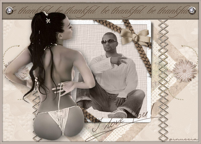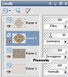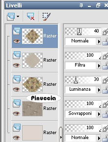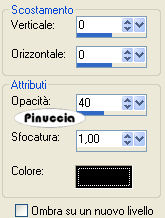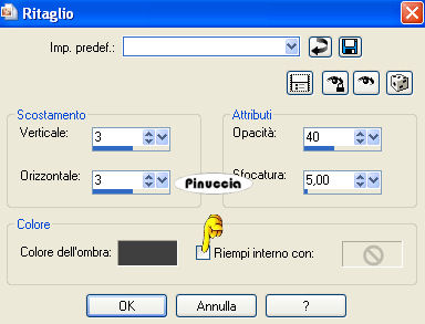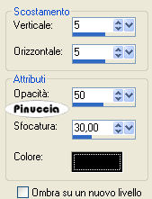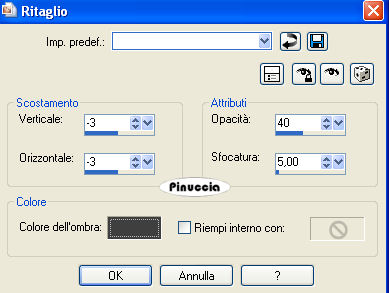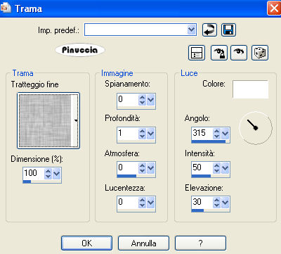 qui puoi trovare qualche risposta ai tuoi dubbi. Se l'argomento che ti interessa non è presente, ti prego di segnalarmelo. Questo tutorial è stato scritto con PSP X2, ma può essere eseguito anche con le altre versioni di PSP. Per tradurlo, l'ho eseguito con PSP X. Occorrente: Materiale qui I tubes che ho usato sono di Jet, Angie, Lisa e Gwyn. Il materiale scrap è di Scrappy Expressions. Nello zip trovi i termini d'uso di Melissa. Rispetta il lavoro degli autori e mantieni inalterati i tubes. Imposta il colore di primo piano con #84746b, e il colore di sfondo con #e1d6cf. Apri una nuova immagine trasparente 700 x 500 pixels, e riempila con il colore chiaro di sfondo.ricorda che, per riempire con il colore di sfondo, devi cliccare con il tasto destro del mouse. Livelli>Nuovo livello raster. Selezione>Seleziona tutto. Apri SE_Thanksgiving_Paper_2.png, e vai a Modifica>Copia. Torna al tuo lavoro e vai a Modifica>Incolla nella selezione. Selezione>Deseleziona. Cambia la modalità di miscelatura di questo livello in Sovrapponi. Apri SE_Thankful_Paper2.jpg, e vai a Modifica>Copia. Torna al tuo lavoro e vai a Modifica>Incolla come nuovo livello. Immagine>Ruota per gradi - 45 gradi a destra, tutti i livelli non selezionato. ![]() Cambia la modalità di miscelatura di questo livello in Luminanza, e abbassa l'opacità al 30%. Apri SE_Thanksgiving_Burlap.psp, e vai a Modifica>Copia. Torna al tuo lavoro e vai a Modifica>Incolla come nuovo livello. Immagine>Ruota per gradi, 45 gradi a destra, tutti i livelli non selezionato. Cambia la modalità di miscelatura di questo livello in Filtra. ![]() Attiva il livello Raster 3 (Thankful Paper 2). ![]() Modifica>Copia. Attiva nuovamente il livello superiore. Modifica>Incolla come nuovo livello. Immagine>Ridimensiona, all'85%, tutti i l ivelli non selezionato, per 2 volte. Riporta la modalità di miscelatura di questo livello a Normale, e abbassa l'opacità al 40%. ![]() ![]() Apri SE_Thanksgiving_Frame.psp, e vai a Modifica>Copia. Torna al tuo lavoro e vai a Modifica>Incolla come nuovo livello. Attiva lo strumento Bacchetta magica ![]() ![]() e clicca più volte all'interno della cornice, finchè non è tutta selezionata. Fai attenzione a non lasciare "sfrangiamenti". Se vedi aree come quelle mostrate nella schermata: ![]() continua a cliccare finchè la selezione non è uniforme. ![]() Posizionati sul livello sottostante a quello della cornice. Livelli>Nuovo livello raster. Riempi la selezione con il colore chiaro di sfondo.Selezione>Deseleziona. Effetti>Effetti di trama>Trama - seleziona la trama Tratteggio fine, con i seguenti settaggi. ![]() Apri jet-man2-januari-20081.psp, e vai a Modifica>Copia. Torna al tuo lavoro e vai a Modifica>Incolla come nuovo livello. Immagine>Ridimensiona, al 55%, tutti i livelli non selezionato. Regola>Messa a fuoco>Metti a fuoco. Posiziona il tube nella cornice.Cambia la modalità di miscelatura di questo livello in Luminanza (esistente), e abbassa l'opacità al 90%. ![]() ![]() Attiva il livello superiore. Apri Flower.pspimage, e vai a Modifica>Copia. Torna al tuo lavoro e vai a Modifica>Incolla come nuovo livello. Regola>Saturazione e Tonalità>Viraggio: ![]() Sposta il fiore a destra, come nel mio esempio.Livelli>Duplica. Immagine>Rifletti. Attiva il livello Raster 6 (il livello della cornice). Apri accent_lh.pspimage, e vai a Modifica>Copia. Torna al tuo lavoro e vai a Modifica>Incolla come nuovo livello. Sposta il tube a sinistra, sotto il fiore.Effetti>Effetti 3D>Sfalsa ombra: ![]() Livelli>Duplica. Immagine>Rifletti. Attiva nuovamente il livello superiore. Apri gwyn-stiksel.psp, e vai a Modifica>copia. Torna al tuo lavoro e vai a Modifica>Incolla come nuovo livello. Sposta il tube a destra, tra la cornice e il fiore, vedi il mio esempio.Cambia la modalità di miscelatura di questo livello in Luminanza. Livelli>Duplica. Immagine>Rifletti. Apri SE_Thanksgiving_Ribbon.pspimage, e vai a Modifica>Copia. Torna al tuo lavoro e vai a Modifica>Incolla come nuovo livello. Sposta la striscia con il testo in alto, vicino al bordo.Apri SE_Thanksgiving_Bling.psp, e vai a Modifica>Copia. Torna al tuo lavoro e vai a Modifica>Incolla come nuovo livello. Posiziona la pietra sull'occhiello a destra del nastro.Livelli>Duplica. Immagine>Rifletti. Apri bellucci01.psp, e vai a Modifica>Copia. Torna al tuo lavoro e vai a Modifica>Incolla come nuovo livello. Immagine>Rifletti. Immagine>Ridimensiona, al 90%, tutti i livelli non selezionato. Sposta il tube a sinistra.Effetti>Effetti 3D>Sfalsa ombra: ![]() Regola>Messa a fuoco>Metti a fuoco. Attiva lo strumento Pennello ![]() cerca e seleziona il pennello Brush love, dimensione 280, ![]() e applicalo con il colore scuro di primo piano (quindi, cliccando con il tasto sinistro del mouse), in basso a destra, vedi il mio esempio. Cambia la modalità di miscelatura di questo livello in Moltiplica. Questo è il momento di aggiungere il tuo nome e/o il tuo watermark al lavoro. Livelli>Unisci>Unisci tutto. Immagine>Aggiungi bordatura, 1 pixel, simmetriche, con il colore scuro di primo piano. Immagine>Aggiungi bordatura, 2 pixels, simmetriche, con il colore chiaro di sfondo. Immagine>Aggiungi bordatura, 1 pixel, simmetriche, con il colore scuro di primo piano. Immagine>Aggiungi bordatura, 2 pixels, simmetriche, con il colore chiaro di sfondo. Immagine>Aggiungi bordatura, 1 pixel, simmetriche, con il colore scuro di primo piano. Selezione>Seleziona tutto. Selezione>modifica>contrai di 7 pixels. Livelli>Nuovo livello raster. Effetti>Effetti 3D>Ritaglio: ![]() Livelli>Nuovo livello raster. Ripeti l'Effetto Ritaglio, ma questa volta cambiando orizzontale e verticale in -3. ![]() Selezione>Deseleziona. Livelli>Unisci>Unisci tutto e salva in formato jpg. ![]() Se hai problemi o dubbi, o trovi un link non funzionante, o anche soltanto per un saluto, scrivimi 2 Febbraio 2008 |