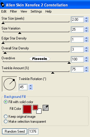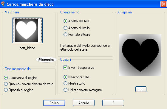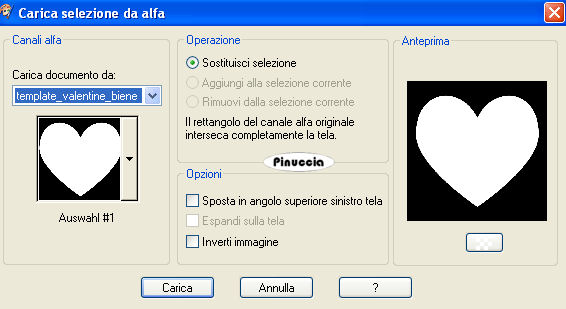 qui puoi trovare qualche risposta ai tuoi dubbi. Se l'argomento che ti interessa non è presente, ti prego di segnalarmelo. Questo tutorial è stato scritto con PSP X, ma può essere eseguito anche con le altre versioni di PSP. Occorrente: Materiale qui I tubes usati sono di Marcio, Clarey, Melissa e Mou. Rispetta il lavoro degli autori e mantieni inalterati i tubes. La carta HS_paper_hearts.jpg fa parte dello Scrapkit HS_Scrapkit_06 di Melissa. Aprila in PSP e minimizzala nella tua area di lavoro. La troverai nella lista dei Motivi disponibili, quando ti servirà. La trama lace1.pspimage fa parte di uno scrapkit di Gwyn. Metti la trama nella cartella Trame di PSP. Filtri: Alien Skin Xenofex - Constellation qui Imposta il colore di primo piano con il bianco e il colore di sfondo con #a80006. Apri template_valentine_biene.pspimage. Questa immagine, che sarà la base del tuo lavoro, non è vuota, ma contiene una selezione salvata su canale alfa. Riempi l'immagine con il bianco.Livelli>Nuovo livello raster. Apri il motivo HS_paper_hearts.jpg e minimizzalo nella tua area di lavoro. Passa il colore di primo piano a Motivi e cercalo nella lista dei motivi disponibili. ![]() Riempi il livello con questo motivo.Selezione>Carica/Salva selezione>Carica selezione da canale alfa. E' già presente la selezione Auswahl#1. Devi soltanto cliccare Carica. ![]() Selezione>inverti. Premi sulla tastiera il tasto CANC ![]() Selezione>Deseleziona. Livelli>Nuovo livello raster. Riempi con il colore rosso impostato come colore di sfondo.ricorda che, per riempire con il colore di sfondo, devi cliccare con il tasto destor del mouse Livelli>Carica/Salva maschera>Carica maschera da disco. Cerca e carica la maschera herz_biene.jpg. ![]() Livelli>Unisci>Unisci gruppo. Selezione>Carica/Salva selezione>Carica selezione da canale alfa. La selezione Auswahl#1 è già presente. Clicca Carica. Premi sulla tastiera il tasto CANC. Selezione>Deseleziona. Attiva il livello Raster 2. Apri il tube hmo_woman beauty.psp, e vai a Modifica>Copia. Torna al tuo lavoro e vai a Modifica>Incolla come nuovo livello. Sposta la donna entro i bordi del cuore.Selezione>Carica/Salva selezione>Carica selezione da canale alfa. E' sempre presente la selezione Auswahl#1. Clicca Carica. Selezione>Inverti. Premi sulla tastiera il tasto CANC. Selezione>Deseleziona. Effetti>Effetti 3D>Sfalsa ombra, con i seguenti settaggi: ![]() Attiva il livello superiore (il livello Gruppo Raster 3). Livelli>Nuovo livello raster. Selezione>Carica/Salva selezione>Carica selezione da canale alfa. E' sempre presente la selezione Auswahl#1. Clicca Carica. Effetti>effetti 3D>Ritaglio ![]() Livelli>Nuovo livello raster. Ripeti l'Effetto ritaglio, ma cambiando verticale e orizzontale a -5. Selezione>Deseleziona. Apri mc713.psp, vai a Modifica>Copia. Torna al tuo lavoro e vai a Modifica>Incolla come nuovo livello. Immagine>Rifletti. Immagine>Ridimensiona, all'85%, tutti i livelli non selezionato. Ripeti per 3 volte (quindi in totale 4). Sposta il tube nell'angolo in basso a sinistra.Livelli>Carica/Salva maschera>Carica maschera da disco. Cerca e carica la maschera 20-20: ![]() Livelli>Unisci>Unisci gruppo. Livelli>Nuovo livello raster. Attiva lo strumento Pennello ![]() cerca e seleziona il pennello Brush Love, dimensione 280, e applicalo con il colore bianco a destra sotto il cuore. Livelli>Unisci>Unisci tutto. Modifica>Copia. Apri zerrissen_rahmen_biene.pspimage. Duplica l'immagine con shift+d e chiudi l'originale. Continua sulla copia. Posizionati sul livello Raster 1 e vai a Modifica>Incolla come nuovo livello. ![]() Attiva il livello superiore (Zusammengefasst). ![]() Livelli>Unisci>Unisci giù. Immagine>Ridimensiona, all'85%, tutti i livelli non selezionato. Metti da parte l'immagine per il momento. Apri una nuova immagine trasparente 700 x 600 pixels, e riempila con il colore rosso.Livelli>Nuovo livello raster. Riempi il nuovo livello con il bianco.Livelli>Carica/Salva maschera>Carica maschera da disco. Cerca e carica la maschera Conte, con i seguenti settaggi. ![]() Livelli>Unisci>Unisci gruppo. Livelli>Unisci>Unisci giù. Effetti>Effetti di trama>Trama - seleziona la trama lace1 con i seguenti settaggi. ![]() Attiva l'immagine con la cornice che hai messo da parte prima e vai a Modifica>Copia. Torna al lavoro con la trama e vai a Modifica>Incolla come nuovo livello. Effetti>Effetti 3D>Sfalsa ombra: ![]() Ripeti l'Effetto Sfalsa ombra, ma cambiando verticale e orizzontale a -1. Livelli>Duplica, per due volte. Attiva il livello originale. Immagine>Ruota per gradi, 10 gradi a sinistra, tutti i livelli non selezionato. ![]() Attiva il livello successivo (la prima copia). Immagine>Ruota per gradi, 10 gradi a destra, tutti i livelli non selezionato. ![]() Attiva il livello superiore. Livelli>Unisci>Unisci giù. Ripeti Livelli>Unisci>Unisci giù. Immagine>Ridimensiona, al 90%, tutti i livelli non selezionato. Regola>Messa a fuoco>Metti a fuoco. Apri clarey_berryblush_eyeletribbon2.png, e vai a Modifica>Copia. Torna al tuo lavoro e vai a Modifica>Incolla come nuovo livello. Immagine>Ridimensiona, all'85%, tutti i livelli non selezionato. Ripeti altre 3 volte. Immagine>Ruota per gradi, 90 gradi a sinistra, tutti i livelli non selezionato. ![]() Sposta il tube a sinistra.Effetti>Effetti 3D>Sfalsa ombra, con i settaggi precedenti. Livelli>Duplica. Immagine>Rifletti. Apri schriftzug_valentine1_biene.pspimage, e vai a Modifica>Copia. Torna al tuo lavoro e vai a Modifica>Incolla come nuovo livello. Sposta il testo sopra il cuore.Se vuoi rifinire il testo come nel mio esempio, prosegui. Altrimenti, salta il passo seguente e aggiungi soltanto l'Effetto Sfalsa ombra. Attiva il livello del testo. Selezione>Seleziona tutto. Selezione>Mobile. Selezione>Modifica>Contrai, di 1 pixel. Modifica>Copia. Livelli>Nuovo livello raster. Modifica>Incolla nella selezione. Mantieni selezionato. Selezione>Modifica>Contrai, di 1 pixel. Effetti>Plugins>Alien Skin Xenofex - Constellation. ![]() Effett