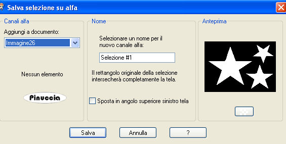 Selezione>Carica/Salva selezione>Salva selezione su canale alfa.