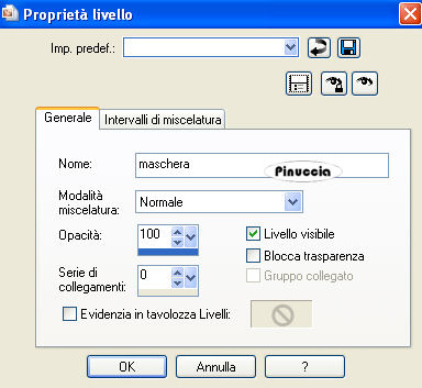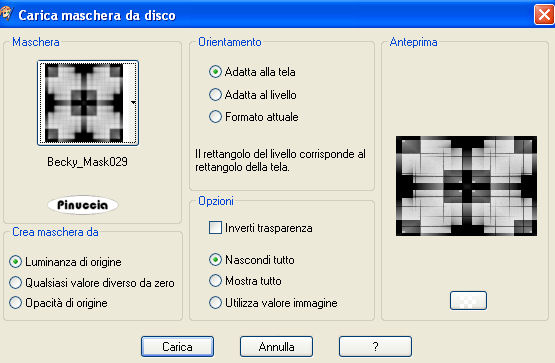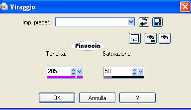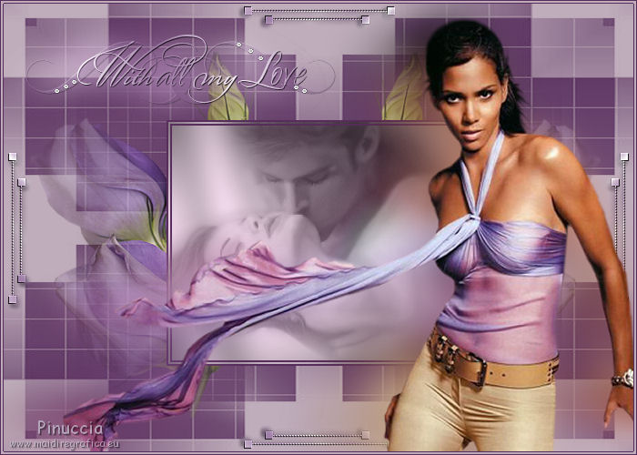 qui puoi trovare qualche risposta ai tuoi dubbi. Se l'argomento che ti interessa non è presente, ti prego di segnalarmelo. Questo tutorial è stato scritto con PSP X2, ma può essere eseguito anche con le altre versioni di PSP. Per tradurlo, l'ho eseguito con PSP X. Occorrente: Materiale qui I tubes che ho usato sono di MTM Brigitte, Linda e Misssilly. Rispetta il lavoro degli autori e mantieni inalterati i tubes. Filtro: Graphics Plus qui Metti il pennello nella cartella Pennelli. Attenzione, il pennello è composto da due files che non devono essere separati. Vedi gli appunti sui Pennelli qui Metti le Maschere 20-20 e Becky_Mask029.jpg nella cartella Maschere. Metti il motivo argento nell cartella Motivi. Imposta il colore di primo piano con #bfadbb, e il colore di sfondo con #572d5c. ![]() Apri una nuova immagine trasparente 700 x 500 pixels, e riempila con il colore di primo piano.Livelli>Nuovo livello raster. Riempi con il colore di sfondo.Livelli>Carica/Salva maschera>Carica maschera da disco. Cerca e carica la maschera Becky_Mask029.jpg. ![]() Livelli>Unisci>Unisci gruppo. Livelli>Proprietà, e rinomina questo livello Maschera. ![]() ![]() Apri Mtm_Bloemen 226-25 juli 20071.psp, e vai a Modifica>Copia. Torna al tuo lavoro e vai a Modifica>Incolla come nuovo livello. Immagine>Ridimensiona, al 95%, tutti i livelli non selezionato. Sposta il tube a destra.Livelli>Carica/Salva maschera>Carica maschera da disco. Cerca e carica la maschera 20-20: ![]() Livelli>Unisci>Unisci gruppo. Sposta i fiori un po' più in basso e a destra.Livelli>Duplica. Immagine>Rifletti. Attiva lo strumento Selezione , rettangolo,e traccia una seleziona come nel mio esempio. ![]() Livelli>Nuovo livello raster. Selezione>Modifica>Espandi - 2 pixels. Riempi la selezione con il colore di sfondo.Selezione>Modifica>Contrai - 2 pixels. Premi sulla tastiera il tasto CANC ![]() Riempi la selezione con il colore di primo piano.Effetti>Plugins>Graphics Plus - Cross Shadow: ![]() Selezione>Carica/Salva selezione>Carica selezione su canale alfa. Puoi assegnare un nome alla selezione o lasciare quello predefinito: Selezione#1. Salva. ![]() Mantieni selezionato. Livelli>Nuovo livello raster. Selezione>Modifica>Contrai - 2 pixels. Riempi la selezione con il colore di sfondo.Selezione>Modifica>Contrai - 2 pixels. Premi sulla tastiera il tasto CANC. Selezione>Deseleziona. Attiva il livello sottostante. Apri COUPLE_IN_LOVE_MIST_12_27_05_LMS_LINDA_1_1.png e vai a Modifica>Copia. Torna al tuo lavoro e vai a Modifica>Incolla come nuovo livello. Posiziona il tube nell'area del piccolo rettangolo chiaro.Livelli>Carica/Salva maschera>Carica maschera da disco. Carica nuovamente la maschera 20-20, con gli stessi settaggi. Liveli>Unisci>Unisci gruppo. Selezione>Carica/Salva selezione>Carica selezione da canale alfa. E' già presente la selezione che hai salvato prima. Devi soltanto cliccare Carica. ![]() Selezione>Inverti. Premi sulla tastiera il tasto CANC. Selezione>Deseleziona. Cambia la modalità di miscelatura di questo livello in Luminanza. Se non stai usando PSP X2, l'effetto di questa modalità potrebbe dare un risultato non gradevole. Cambia la modalità in Luminanza (Esistente) e abbassa l'opacità al 75%. Attiva il livello superiore. Apri Misssilly-berryversace2007.psp e vai a Modifica>Copia. Torna al tuo lavoro e vai a Modifica>Incolla come nuovo livello. Immagine>Ridimensiona, al 120%, tutti i livelli non selezionato. Sposta il tube in basso a destra.![]() Livelli>Duplica. Livelli>Disponi>Sposta giù. Effetti>Effetti di distorsione>Vento - da destra - intensità 100. ![]() Regola>Sfocatura>Sfocatura gaussiana - raggio 20. ![]() Attiva il livello del primo fiore. Attiva lo strumento Gomma dimensione 60, opacità 17,e cancella gli steli dei fiori. ![]() Ripeti attivando il livello del livello della copia dei fiori. Attiva il livello "Maschera". Livelli>Nuovo livello raster. Passa il colore di primo piano a Motivi e seleziona il motivo argento: ![]() Attiva lo strumento Pennello ![]() cerca e seleziona il pennello hbg2003_lines3 002.PspBrush, e applicalo a destra, al centro, nel bordo esterno, vedi il mio esempio per controllare la posizione. Regola>Tonalità e saturazione>Viraggio ![]() Effetti>Effetti 3D>Sfalsa ombra, con i seguenti settaggi, colore nero. ![]() Regola>Messa a fuoco>Metti a fuoco. Livelli>Unisci>Unisci giù. Livelli>Duplica. Immagine>Rifletti. Livelli>Duplica. Immagine>Ruota per gradi - 90 gradi a destra: ![]() Spostalo in alto al centro, sulla parte chiara.Livelli>Duplica. Immagine>Capovolgi. ![]() Apri il file di testo schriftzug_withallmylove_biene.pspimage e vai a Modifica>Copia. Torna al tuo lavoro e vai a Modifica>Incolla come nuovo livello. Spostalo in alto a sinistra.Livelli>Duplica. Livelli>Disponi>Sposta giù. Effetti>Effetti di distorsione>Vento, con i settaggi precedenti. Regola>Sfocatura>sfocatura gaussiana, raggio 15. ![]() Livelli>Duplica. Attiva il livello superiore. Livelli>Nuovo livello raster. Selezione>Seleziona tutto. Selezione>Modifica>Contrai - 4 pixels. Selezione>Inverti. Riempi la selezione con il colore di sfondo.Livelli>Nuovo livello raster. Selezione>Modifica>Contrai - 1 pixel. Riempi la selezione con il colore di primo piano.Aggiungi il tuo nome e/o il tuo watermark. Livelli>Unisci>Unisci tutto e salva in formato jpg. ![]() Se hai problemi o dubbi, o trovi un link non funzionante, o anche soltanto per un saluto, scrivimi. 12 Agosto 2008 |