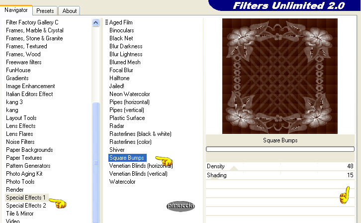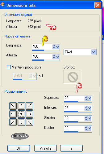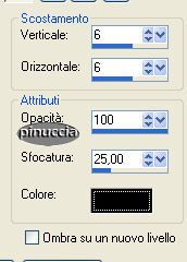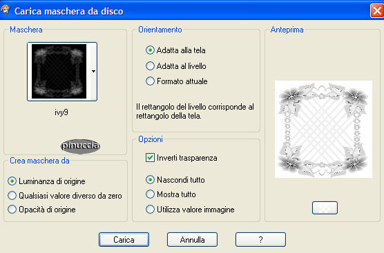 qui puoi trovare qualche risposta ai tuoi dubbi. Se l'argomento che ti interessa non è presente, ti prego di segnalarmelo. Occorrente: Materiale qui Filtro: Greg's Factory Output 2 qui Unlimited 2 qui Apri l'immagine pSecrets01. Immagine>Ridimensiona, a 400 pixels di altezza. Attiva lo strumento Selezione , rettangolo arrotondato,sfumatura 20 ![]() traccia un rettangolo attorno all'immagine. ![]() per effetto della sfumatura, la selezione si allargherà. Modifica>Copia. Modifica>incolla>incolla come nuova immagine. Abbassa l'opacità al 60%. Immagine>Dimensione tela, 400 x 400 pixels. ![]() la selezione dell'immagine potrebbe essere diversa dalla mia, quindi in questo caso le dimensioni indicate dalla manina rossa non saranno le stesse. Livelli>Nuovo livello raster. Riempi il nuovo livello con un colore chiaro preso dall'immagine.Io ho scelto #e5d3c4. Effetti>Plugins>Greg Factory / Poolshadow: ![]() Livelli>Disponi sotto. Livelli>Nuovo livello raster. Riempi il nuovo livello con un colore scuro preso dall'immagine.Io ho scelto #481d0c. Livelli>Carica/Salva maschera>Carica maschera da disco. Cerca e seleziona la maschera Ivy9, inverti trasparenza selezionato: ![]() Livelli>Elimina. Rispondi sì alla finestra "Unire la maschera al livello corrente?". Livelli>Unisci>Unisci gruppo. 5. Effetti>Plugins>Unlimited - Special Effect 1 - Square bumps. ![]() Livelli>Unisci>unisci tutto. Immagine>Aggiungi bordatura, 3 pixels, simmetriche, con il colore chiaro. Seleziona il bordo con la bacchetta magica ![]() Effetti>Plugins>Greg Factory, Poolshadow, con i settaggi precedenti. Selezione>Nessuna selezione. Livelli>Nuovo livello raster. Chiudi il colore di primo piano, imposta il colore chiaro come colore di sfondo. Attiva lo strumento Testo ,Io ho usato il font Roughbrush con questi settaggi: ![]() scrivi il testo e posizionalo. Effetti>Plugins>Greg Factory - Poolshadow, con i settaggi precedenti. Effetti>Effetti 3D>Sfalsa ombra, con i seguenti settaggi, colore nero: ![]() Aggiungi la tua firma o il tuo watermark. Livelli>Unisci>Unisci tutto e salva in formato jpg. ![]() ![]() ![]() Se hai problemi o dubbi, o trovi un link non funzionante, o anche soltanto per un saluto, scrivimi. Novembre 2006 |