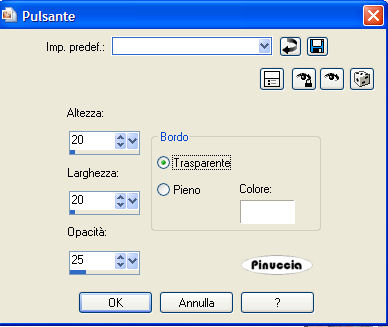 qui puoi trovare qualche risposta ai tuoi dubbi. Se l'argomento che ti interessa non è presente, ti prego di segnalarmelo. Occorrente: Materiale (tube e font) qui Filtro Toadies qui Apri l'immagine in PSP. Immagine>Ridimensiona, a 300 pixels di altezza. ![]() Livelli>Innalza livello di sfondo. Immagine>Dimensione tela a 450 x 450 pixels. Livelli>Duplica. Attiva il livello inferiore. Effetti>Plugins>Toadies - What are you?, con i settaggi a 50. ![]() Attiva il livello superiore. Modifica>Copia. Livelli>Nuovo livello raster. Livelli>Disponi>Sposta sotto. Selezione>Seleziona tutto. Modifica>Incolla nella selezione. Avrai questo: ![]() Selezione>Deseleziona. Effetti>Plugins>Toadies - Old color, con i seguenti settaggi: ![]() Abbassa l'opacità di questo livello al 50%. Livelli>Unisci>Unisci tutto (appiattisci). Effetti>Effetti 3D>Pulsante, con i seguenti settaggi: ![]() Aggiungi il tuo nome o il tuo watermark. Io ho usato il font Amethyst script. Effetti>Effetti 3D>Sfalsa ombra, con i seguenti settaggi, colore nero. ![]() Livelli>Unisci>Unisci tutto e salva in formato jpg. ![]() Se hai problemi o dubbi, o trovi un link non funzionante, o anche soltanto per un saluto, scrivimi. 5 Marzo 2007 |