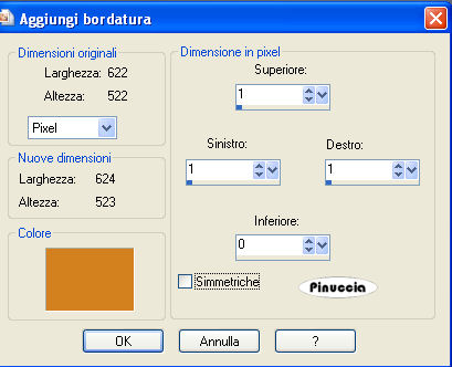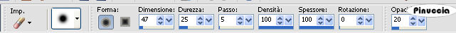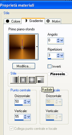 qui puoi trovare qualche risposta ai tuoi dubbi. Se l'argomento che ti interessa non è presente, ti prego di segnalarmelo. Questo tutorial è stato scritto con PSP X2, ma può essere eseguito anche con le altre versioni di PSP. Per tradurlo, ho usato PSP X. Il copyright del tutorial appartiene all'autrice. Occorrente: Materiale qui Rispetta il lavoro degli autori, non rimuovere il copyright e non cambiare il nome dei tubes. Metti la maschera 20-20 nella cartella Maschere. Filtri: Adjust - Variations qui Graphics Plus qui FM Tile Tools qui Xero - Mistifier qui 1. Apri i tubes in PSP, duplicali usando sulla tastiera la combinazione di tasti shift(maiuscola)+D e chiudi gli originali. 2. Apri una nuova immagine trasparente 600 x 450 pixels. 3. Imposta il colore di primo piano con un colore chiaro; il mio #d3811f, e il colore di sfondo con un colore scuro; il mio #1f0400. 4. Passa il colore di primo piano a Gradiente di primo piano/sfondo, con i seguenti settaggi. ![]() Riempi l'immagine trasparente con il colore di sfondo.5. Effetti>Plugins>Variations - seleziona Saturation e clicca una volta su Less Saturation: ![]() 6. Regola>Sfocatura>Sfocatura gaussiana - raggio 5. ![]() 7. Apri il tube "Autumn" e vai a Modifica>Copia. Torna al tuo lavoro e vai a Modifica>Incolla come nuovo livello. Sposta il tube in alto.8. Premi sulla tastiera il tasto K e allarga il tube a destra e a sinistra, non in basso. ![]() 9. Effetti>Plugins>FM Tile Tools - Blend Emboss, con i settaggi standard. ![]() 10. Apri il tube "Dark-beauty", e vai a Modifica>copia. Torna al tuo lavoro e vai a Modifica>Incolla come nuovo livello. 11. Regola>Rimozione disturbo in un passaggio. Abbassa l'opacità di questo livello al 70%. 12. Attiva il livello Raster 2. Attiva lo strumento Gomma con i seguenti settaggi:![]() 13. "Pulisci" il viso della donna. ![]() 14. Attiva nuovamente il livello superiore. 15. Apri il tube "368NLF130308" e vai a Modifica>copia. Torna al tuo lavoro e vai a Modifica>Incolla come nuovo livello. Immagine>Ridimensiona, all'80%, tutti i livelli non selezionato. 16. Livelli>Carica/Salva maschera>Carica maschera da disco. Cerca e carica la maschera 20-20: ![]() Livelli>Elimina e rispondi sì alla domanda Unire la maschera nel livello corrente. Livelli>Unisci>Unisci gruppo. Sposta il tube in basso a sinistra.17. Apri il tube "mc2603" e vai a Modifica>Copia. Torna al tuo lavoro e vai a Modifica>Incolla come nuovo livello. Immagine>Ridimensiona, 2 volte all'80%, tutti i livelli non selezionato. 18. Livelli>Carica/Salva maschera>Carica maschera da disco. La maschera 20-20 è ancora presente. Devi soltanto cliccare Carica. Livelli>Elimina. Livelli>Unisci>Unisci gruppo. Sposta il tube in basso a destra.19. Livelli>Unisci>Unisci tutto. 20. Immagine>Aggiungi bordatura, 1 pixel, simmetriche, con il colore di primo piano. 21. Immagine>Aggiungi bordatura, simmetriche non selezionato, con i seguenti settaggi: ![]() 22. Seleziona il bordo con la bacchetta magica ![]() ![]() Riempi il bordo con il gradiente.23. Effetti>Plugins>Graphics Plus - Cross Shadow, con i settaggi standard. ![]() Selezione>Deseleziona. 24. Immagine>Aggiungi bordatura, simmetriche non selezionato, con il colore di sfondo: ![]() Seleziona il bordo con la bacchetta magica ![]() 25. Livelli>Nuovo livello raster. 26. Attiva nuovamente il tube "Autumn" e vai a Modifica>Copia. Torna al tuo lavoro e vai a Modifica>Incolla nella selezione. Mantieni selezionato. 27. Livelli>Nuovo livello raster. Riempi con il colore di primo piano.28. Selezione>Modifica>Contrai - 1 pixel. Premi sulla tastiera il tasto CANC ![]() Selezione>Deseleziona. 29. Immagine>Aggiungi bordatura, simmetriche non selezionato, con il colore di primo piano. ![]() 30. Effetti>Plugins>Xero - Mistifier, con i settaggi standard. ![]() 31. Attiva lo strumento Testo e scrivi un testo sulla striscia in basso.32. Livelli>Unisci>Unisci tutto. 33. Immagine>Ridimensiona, a 600 pixels di larghezza, tutti i livelli selezionato. Aggiungi il tuo nome e/o il tuo watermark e salva in formato jpg. ![]() Se hai problemi o dubbi, o trovi un link non funzionante, o anche soltanto per un saluto, scrivimi. 30 Settembre 2008 |