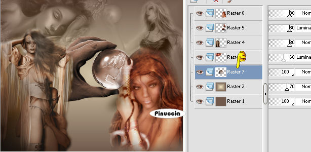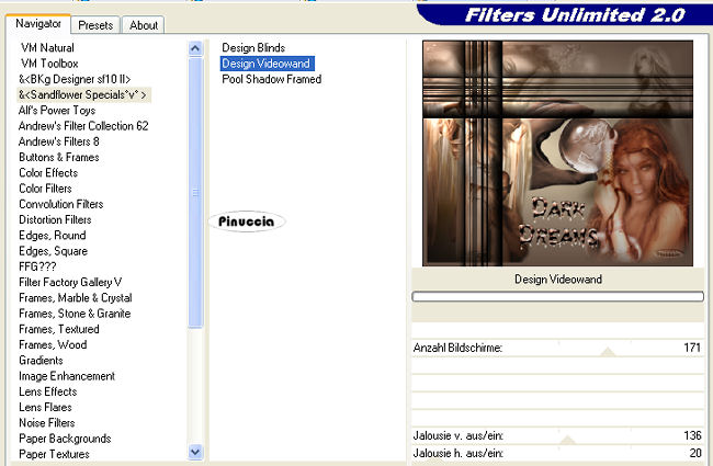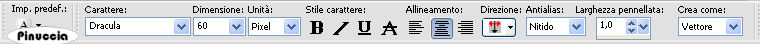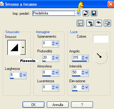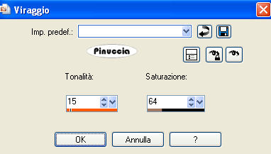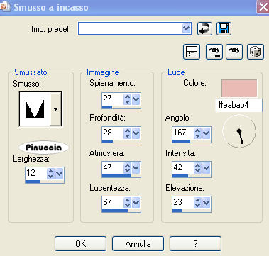 qui puoi trovare qualche risposta ai tuoi dubbi. Se l'argomento che ti interessa non è presente, ti prego di segnalarmelo. Questo tutorial è stato scritto con PSP X, ma può essere eseguito anche con le altre versioni di PSP. Il copyright del tutorial appartiene all'autrice. Occorrente: Materiale qui Rispetta il lavoro degli autori, non rimuovere il copyright e non cambiare il nome dei tubes. Filtri: Graphics Plus qui Xero - Porcelain qui Filters Unlimited qui Sandflower qui Il filtro Sandflower si usa importato in Filters Unlimited. Come fare vedi qui 1. Apri i tubes in PSP, duplicali usando sulla tastiera la combinazione di tasti shift(maiuscola)+D e chiudi gli originali. 2. Apri una nuova immagine trasparente 600 x 500 pixels. 3. Imposta il colore di primo piano con un colore chiaro; il mio #faf0cb, e il colore di sfondo con un colore scuro; il mio #715a4c. 4. Riempi l'immagine trasparente con il colore di sfondo.5. Livelli>Nuovo livello raster. Passa il colore di primo piano a Gradiente, con i seguenti settaggi. ![]() Riempi il livello con il gradiente.Abbassa l'opacità di questo livello al 70%. 6. Apri il tube MoonSP07, e vai a Modifica>copia. Torna al tuo lavoro e vai a Modifica>Incolla come nuovo livello. Sposta il tube in alto a sinistra.Cambia la modalità di miscelatura di questo livello in Luminanza (Esistente), e abbassa l'opacità al 60%. 7. Apri il tube AH_Fantasy_Paar e vai a Modifica>copia. Torna al tuo lavoro e vai a Modifica>Incolla come nuovo livello. Attiva lo strumento Gomma e cancella la parte marrone.![]() Sposta il tube a sinistra.Abbassa l'opacità di questo livello all'80%. 8. Apri il tube "fantasy_lady" e vai a Modifica>copia. Torna al tuo lavoro e vai a Modifica>Incolla come nuovo livello. Immagine>Rifletti. Immagine>Ridimensiona, all'80%, tutti i livelli non selezionato. Sposta il tube in alto a destra.Cambia la modalità di miscelatura di questo livello in Luminanza (Esistente), e abbassa l'opacità all'80%. 9. Apri il tube Kat_NKDA_2007 e vai a Modifica>copia. Torna al tuo lavoro e vai a Modifica>Incolla come nuovo livello. Immagine>Ridimensiona, 3 volte all'80%, tutti i livelli non selezionato. Sposta il tube in basso a destra.Abbassa l'opacità di questo livello all'80%. Attiva lo strumento Gomma ![]() Attiva il livello precedente e cancella le tracce di questo tube. ![]() 10. Attiva nuovamente il livello superiore. Apri il tube SKF_Hand, e vai a Modifica>copia. Torna al tuo lavoro e vai a Modifica>Incolla come nuovo livello. Immagine>Ridimensiona, 2 volte all'80%, tutti i livelli non selezionato. Regola>Tonalità e Saturazione>Viraggio: ![]() Nella paletta dei livelli sposta questo livello di quattro posizioni, e posiziona il tube al centro.![]() 11. Attiva lo strumento Gomma ![]() e cancella le tracce del tube della mano da quello del tube sovrastante. ![]() 12. Attiva il livello superiore. Attiva lo strumento Testo ![]() e scrivi un testo nello spazio libero. Per il mio testo ho usato il font Dracula con i seguenti settaggi: ![]() Livelli>Converti in livello raster. 13. Effetti>Effetti 3D>Smusso a incasso, con i seguenti settaggi: ![]() 14. Livelli>Unisci>Unisci tutto. 15. Immagine>Aggiungi bordatura, 10 pixels, simmetriche, con un colore qualsiasi purchè non presente nell'immagine. 16. Seleziona questo bordo con la bacchetta magica ![]() ![]() Riempi con il colore di sfondo.17. Effetti>Plugins>Filters Unlimited - Sandflower Spezial - Design Videowand, con i settaggi standard. ![]() 18. Effetti>Plugins>Graphics Plus - Cross Shadow, con i settaggi standard, 2 volte. ![]() 20. Effetti>Effetti 3D>smusso a incasso, con i settaggi standard. ![]() 21. Selezione>Deseleziona. 22. Effetti>Plugins>Xero - Porcelain, con i settaggi standard. ![]() Aggiungi il tuo nome e /o il tuo watermark e salva in formato jpg. ![]() Se hai problemi o dubbi, o trovi un link non funzionante, o anche soltanto per un saluto, scrivimi. 30 Settembre 2008 |