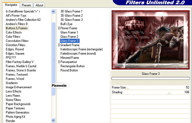36. Effetti>Plugins>Filters Unlimited - Buttons and Frames - Glass Frame 3, con i seguenti settaggi:
