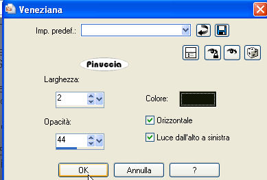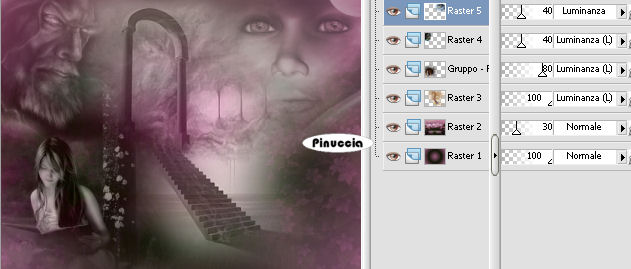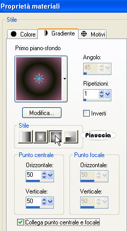 qui puoi trovare qualche risposta ai tuoi dubbi. Se l'argomento che ti interessa non è presente, ti prego di segnalarmelo. Questo tutorial è stato scritto con PSP X, ma può essere eseguito anche con le altre versioni di PSP. Il copyright del tutorial appartiene all'autrice. Occorrente: Materiale qui Metti la maschera 20-20 nella cartella Maschere. Rispetta il lavoro degli autori, non rimuovere il copyright e non cambiare il nome dei tubes. 1. Apri i tubes in PSP. Duplicali usando sulla tastiera la combinazione di tasti shift(maiuscola)+D e chiudi gli originali. 2. Apri una nuova immagine trasparente 600 x 450 pixels. 3. Imposta il colore di primo piano con un colore chiaro (il mio #111506), e il colore di sfondo con un colore scuro (il mio #9e5e81). 4. Passa il colore di primo piano a Gradiente, con i seguenti settaggi: ![]() Riempi l'immagine trasparente con il gradiente.5. Selezione>Seleziona tutto. 6. Livelli>Nuovo livello raster. Apri l'immagine di sfondo "Plaatje bewerken" e vai a Modifica>copia. Torna al tuo lavoro e vai a Modifica>Incolla nella selezione. Selezione>Deseleziona. Abbassa l'opacità di questo livello al 30%. 7. Apri il tube "KAT_misted_stairwaytoheaven", e vai a Modifica>copia. Torna al tuo lavoro e vai a Modifica>Incolla come nuovo livello. Sposta l'immagine al centro.Cambia la modalità di miscelatura di questo livello in Luminanza (Esistente). 8. Apri il tube "fantasy 207" e vai a Modifica>copia. Torna al tuo lavoro e vai a Modifica>Incolla come nuovo livello. 9. Livelli>Carica/Salva maschera>Carica maschera da disco. Cerca e carica la maschera 20-20: ![]() 10. Livelli>Elimina e rispondi sì alla domanda Unire la maschera nel livello corrente. ![]() Livelli>Unisci>Unisci gruppo. Sposta l'immagine a sinistra.Cambia la modalità di miscelatura di questo livello in Luminanza (esistente), e abbassa l'opacità all'80%. ![]() 11. Apri il tube "Glen Angus" e vai a Modifica>copia. Torna al tuo lavoro e vai a Modifica>Incolla come nuovo livello. Immagine>Ridimensiona, al 60%, tutti i livelli non selezionato. Immagine>Rifletti. Sposta il tube in alto a sinistra.Cambia la modalità di miscelatura di questo livello in Luminanza (Esistente), e abbassa l'opacità al 40%. ![]() 12. Apri il tube "CEBARRE" e vai a Modifica>copia. Torna al tuo lavoro e vai a Modifica>Incolla come nuovo livello. Sposta il tube in alto a destra.Cambia la modalità di miscelatura di questo livello in Luminanza, e abbassa l'opacità al 40%. ![]() 13. Apri il tube "stephane-planet" e vai a Modifica>copia. Torna al tuo lavoro e vai a Modifica>Incolla come nuovo livello. Immagine>Ridimensiona, al 60%, tutti i livelli non selezionato. Immagine>Rifletti. Sposta il tube in basso al centro.Cambia la modalità di miscelatura di questo livello in Luminanza (Esistente), e abbassa l'opacità all'80%. 14. Livelli>Unisci>Unisci tutto. 15. Immagine>Aggiungi bordatura, 2 pixels, simmetriche, con il colore di sfondo. 16. Immagine>Aggiungi bordatura, 10 pixels, simmetriche, con un colore qualsiasi, purchè non sia presente nell'immagine. 17. Seleziona questo bordo con la bacchetta magica ![]() ![]() Riempi la selezione con il gradiente.18. Selezione>Inverti. Effetti>Effetti 3D>Sfalsa ombra, con i seguenti settaggi, colore di primo piano. ![]() 19. Ripeti l'Effetto Sfalsa ombra, cambiando verticale e orizzontale con -1. Selezione>Inverti. 20. Effetti>Effetti di trama>Veneziana. ![]() 21. Effetti>Effetti di bordo>Aumenta. 22. Selezione>Deseleziona. 23. Immagine>Aggiungi bordatura, 2 pixels, simmetriche, con il colore di sfondo. Aggiungi il tuo nome e/o il tuo watermark e salva in formato jpg. ![]() Se hai problemi o dubbi, o trovi un link non funzionante, o anche soltanto per un saluto, scrivimi. 11 Agosto 2008 |