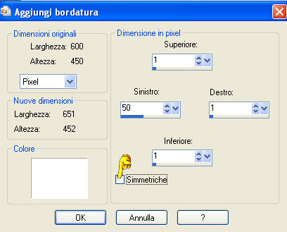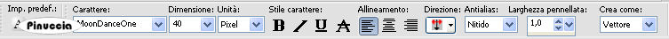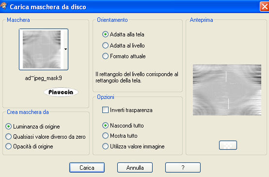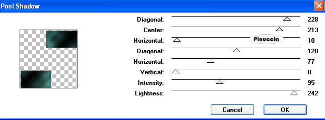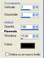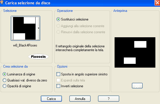 qui puoi trovare qualche risposta ai tuoi dubbi. Se l'argomento che ti interessa non è presente, ti prego di segnalarmelo. Questo tutorial è stato scritto con PSP X2, ma può essere eseguito anche con le altre versioni di PSP. Per tradurlo, ho usato PSP X. Il copyright del tutorial appartiene all'autrice. Occorrente: Materiale qui Rispetta il lavoro degli autori, non rimuovere il copyright e non cambiare il nome dei tubes. Filtri: Greg's Factory Output qui Graphics Plus qui Metti la maschera ad_jpeg_mask 9 nella cartella Maschere. Metti le selezioni nella cartella Selezioni. Metti l'ornamento "H sparkle-white" nella cartella Ornamenti. 1. Apri i tubes in PSP, duplicali usando sulla tastiera la combinazione di tasti shift(maiuscola)+D e chiudi gli originali. 2. Apri una nuova immagine trasparente 600 x 450 pixels. 3. Imposta il colore di primo piano con #264844, e il colore di sfondo con il nero. 4. Riempi l'immagine trasparente con il colore di sfondo.5. Livelli>Nuovo livello raster. Riempi con il colore di primo piano.6. Livelli>Carica/Salva maschera>Carica maschera da disco. Cerca e carica la maschera ad~jpeg_mask9: ![]() Livelli>Elimina e rispondi sì alla domanda Unire la maschera nel livello corrente. Livelli>Unisci>Unisci gruppo. 7. Effetti>Effetti di bordo>Aumenta di più. 8. Passa il colore di primo piano a Gradiente, con i seguenti settaggi. ![]() 9. Livelli>Nuovo livello raster. 10. Selezione>Carica/Salva selezione>Carica selezione da disco. Cerca e carica la selezione w8_Black4Roses: ![]() 11. Selezione>Modifica>Espandi - 3 pixels. Riempi la selezione con il gradiente.12. Effetti>Plugins>Greg's Factory Output vol. II - Pool Shadow: ![]() 13. Effetti>Effetti di trama>Veneziana: ![]() 14. Effetti>Effetti 3D>Sfalsa ombra, con i seguenti settaggi, colore bianco. ![]() 15. Selezione>Deseleziona. 16. Apri il tube "Isharimal_girl" e vai a Modifica>Copia. Torna al tuo lavoro e vai a Modifica>Incolla come nuovo livello. Non occorre spostarlo. E' già correttamente posizionato. 17. Livelli>Nuovo livello raster. 18. Selezione>Carica/Salva selezione>Carica selezione da disco. Cerca e carica la selezione w9_Black4Roses: ![]() 19. Selezione>Modifica>Espandi - 3 pixels. Riempi la selezione con il gradiente.20. Effetti>Effetti di trama>Veneziana, come al punto 13, ma Orizzontale non selezionato: ![]() Mantieni selezionato. 21. Livelli>Nuovo livello raster. 22. Apri il tube "bloem004" e vai a Modifica>copia. Torna al tuo lavoro e vai a Modifica>Incolla nella selezione. 23. Effetti>Effetti 3D>Sfalsa ombra, con i settaggi precedenti. ![]() 24. Selezione>Deseleziona. ![]() 25. Effetti>Effetti 3D>Sfalsa ombra, con i seguenti settaggi, colore nero: (Sfalsa ombra per il fiore). ![]() 26. Attiva lo strumento Testo e scrivi un testo.Per il mio testo ho usato il font Moondance One: ![]() 27. Aggiungi il tuo nome e/o il tuo watermark su un nuovo livello. 28. Livelli>Unisci>Unisci visibile. 29. Selezione>Seleziona tutto. 30. Immagine>Aggiungi bordatura, simmetriche non selezionato: ![]() 31. Effetti>Effetti 3D>Ritaglio: ![]() Ripeti l'Effetto Ritaglio, cambiando verticale e orizzontale con -1. 32. Selezione>Inverti. Riempi la selezione con il gradiente.33. Effetti>Plugins>Graphics Plus - Cross Shadow, con i settaggi standard. ![]() 34. Selezione>Deseleziona. 35. Immagine>Aggiungi bordatura, 1 pixel, simmetriche, con il colore nero. 36. Apri "renamed Bs ChromeGlass Element Pack. E' attivo il livello "Chrome Bar1": Modifica>copia. Torna al tuo lavoro e vai a Modifica>Incolla come nuovo livello. 37. Immagine>Ruota per gradi - 90 gradi a sinistra. ![]() 38. Premi sulla tastiera il tasto K e barra sarà circondata dalla griglia del Puntatore. Porta il tube nei limiti dell'altezza dell'immagine: ![]() Posiziona la barra a sinistra, come nel mio esempio.Clicca sulla manina per far sparire la griglia.39. Attiva lo strumento Ornamento ![]() e seleziona H_Sparkle_White, scala 100. 40. Applica l'ornamento a sinistra, in alto e in basso. 41. Cambia il settaggio della scala con 20 e applica altre piccole stelle tra le due stelle più grandi. 42. Livelli>Unisci>Unisci tutto. 43. Immagine>Ridimensiona, a 600 pixels di larghezza, tutti i livelli selezionato. 44. Hai finito. Puoi salvare in formato jpg. ![]() Se hai problemi o dubbi, o trovi un link non funzionante, o anche soltanto per un saluto, scrivimi 30 Settembre 2008 |