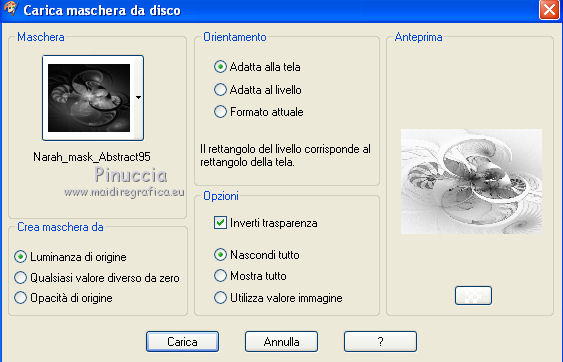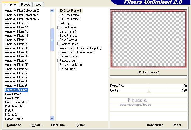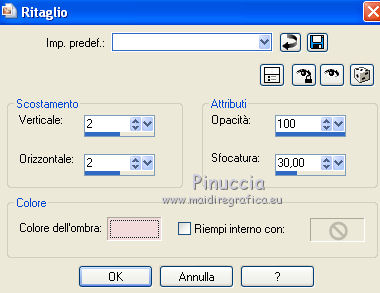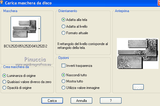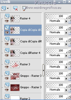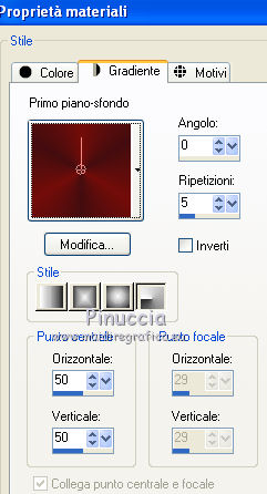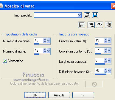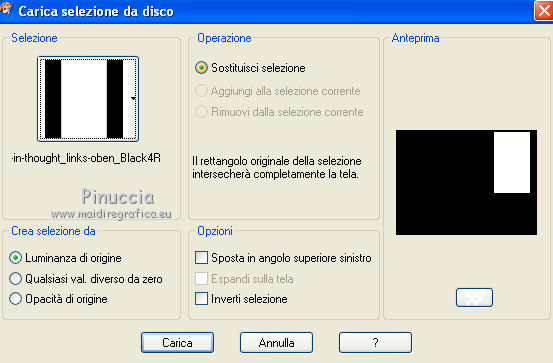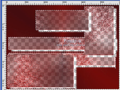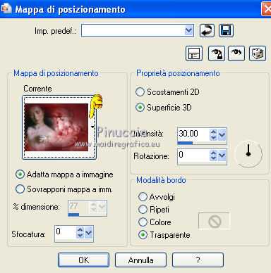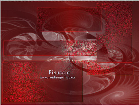 qui puoi trovare qualche risposta ai tuoi dubbi. Se l'argomento che ti interessa non è presente, ti prego di segnalarmelo. Questo tutorial è stato scritto con PSP X2, ma può essere eseguito anche con le altre versioni di PSP. Per tradurlo ho usato PSP X. Il copyright del tutorial appartiene a Black4roses. Il copyright della traduzione è mio. Occorrente: Materiale qui Rispetta il lavoro degli autori. Non cambiare il nome dei files e non cancellare il copyright. Filtri: Graphics Plus - Cross Shadow qui Filters Unlimited 2.0 qui Xero - Moonlight qui ![]() Metti le maschere nella cartella Maschere. Metti la selezione nella cartella Selezioni. 1. Apri i tubes, duplicali usando la combinazione di tasti shift(maiuscola)+D e chiudi gli originali. Apri una nuova immagine trasparente 600 x 450 pixels. 3. Imposta il colore di primo piano con il colore bianco, e il colore di sfondo con #440d10. 4. Riempi l'immagine trasparente con il colore di sfondo.5. Livelli>Nuovo livello raster. Riempi il nuovo livello con il colore bianco.6. Imposta il colore di primo piano con #730d0b. Passa il colore di primo piano a Gradiente con i seguenti settaggi. ![]() Livelli>Nuovo livello raster. Riempi il livello con il gradiente.7. Livelli>Carica/Salva maschera>Carica maschera da disco. Cerca e carica la maschera Narah_maskAbstrakt95. ![]() Livelli>Elimina e rispondi sì alla domanda Unire la maschera nel livello corrente. ![]() Livelli>Unisci>Unisci gruppo. 7. Effetti>Effetti di bordo>Aumenta. 9. Livelli>Nuovo livello raster. Riempi ancora con il gradiente.10. Livelli>Carica/Salva maschera>Carica maschera da disco. Cerca e carica la maschera BC%252D05%252D04%252D2. ![]() Livelli>Elimina e rispondi sì. Livelli>Unisci>Unisci gruppo. 11. Effetti>Effetti di bordo>Aumenta. 12. Chiudi i tre livelli inferiori (per visualizzare meglio quello che dovrai fare). 13. Attiva lo strumento Bacchetta magica , tolleranza 0,e clicca sulle parti rosse (dovrai cliccare più volte per selezionare bene tutte le parti). ![]() 14. Premi sulla tastiera il tasto CANC. 15. Selezione>Deseleziona. 16. Attiva lo strumento Gomma ,e "pulisci" il livello, cancellando le tracce dei bordi. 17. Livelli>Visualizza>Tutto. Dovresti avere questo. ![]() Rimani sul livello superiore. 18. Apri il tube "Rw_pearls_and_flowers_misted" e vai a Modifica>Copia. Torna al tuo lavoro e vai a Modifica>Incolla come nuovo livello. Lascialo come sta. E' già correttamente posizionato al centro dell'immagine. 19. Apri il tube "SS_317" e vai a Modifica>Copia. Torna al tuo lavoro e vai a Modifica>Incolla come nuovo livello. 20. Immagine>Ridimensiona, al 90%, tutti i livelli non selezionato. Sposta il tube a sinistra.21. Livelli>Duplica. 22. Livelli>Disponi>Sposta giù. 23. Effetti>Effetti di distorsione>Mappa di posizionamento. Apri il menu delle mappe e nella lista vedrai anche i files aperti in PSP, tra questi l'immagine sulla quale stai lavorando, denominata "Corrente". Seleziona questo immagine e imposta i seguenti settaggi. ![]() 24. Immagine>Ridimensiona, al 110%, tutti i livelli non selezionato. 25. Livelli>Duplica. 26. Immagine>Ridimensiona, al 110%, tutti i livelli non selezionato. 27. Livelli>Duplica. 28. Immagine>Ridimensiona, al 110%, tutti i livelli non selezionato. 29. Hai tre livelli duplicati sotto il livello originale. ![]() Livelli>Unisci>Unisci giù - 2 volte. 30. Effetti>Effetti di trama>Mosaico di vetro. ![]() 31. Cambia la modalità di miscelatura di questo livello in Filtra, e abbassa l'opacità al 60%. 32. Attiva il livello superiore. Livelli>Nuovo livello raster. 33. Selezione>Carica/Salva selezione da disco>Carica selezione da disco. Cerca e carica la selezione "lost-in-thought-links-oben_Black4Roses". ![]() 34. Apri il tube "man_byClo©" e vai a Modifica>Copia. Torna al tuo lavoro e vai a Modifica>Incolla nella selezione. 35. Livelli>Nuovo livello raster. Imposta il colore di primo piano con #ff1e1a, e riempi il livello con questo colore.36. Selezione>Modifica>Contrai - 2 pixels. Premi sulla tastiera il tasto CANC. Selezione>Deseleziona. 37. Effetti>Plugins>Graphics Plus - Cross Shadow, con i settaggi standard. ![]() 38. Apri il wordart "lost-in-thought-WordArt_Black4Roses" e vai a Modifica>Copia. Torna al tuo lavoro e vai a Modifica>Incolla come nuovo livello. Spostalo in basso a destra.39. Effetti>Effetti 3D>Sfalsa ombra, con il colore #d1c1c1. ![]() 40. Livelli>Unisci>Unisci tutto. 41. Selezione>Seleziona tutto. 42. Effetti>Effetti 3D>Ritaglio, con il colore #f3dbdc. ![]() Ripeti l'Effetto Ritaglio cambiando verticale e orizzontale con -2. 43. Selezione>Deseleziona. 44. Modifica>Copia. 45. Immagine>Aggiungi bordatura, 1 pixel, simmetriche, con il colore di sfondo. 46. Immagine>Aggiungi bordatura, 20 pixels, simmetriche, con il colore di primo piano. 47. Seleziona questo bordo con la bacchetta magica , sfumatura e tolleranza 0.48. Livelli>Nuovo livello raster. Modifica>Incolla nella selezione. 49. Effetti>Plugins>Filters Unlimited 2.0 - Buttons & Frames - 3D Glass Frame 1. ![]() 50. Effetti>Plugins>Xero - Moonlight. ![]() 51. Selezione>Deseleziona. 52. Immagine>Aggiungi bordatura, 1 pixel, simmetriche, con il colore di sfondo. 53. Immagine>Ridimensiona, a 600 pixels di larghezza, tutti i livelli non selezionato. Aggiungi il tuo nome e/o il tuo watermark e salva in formato jpg. ![]() Se hai problemi o dubbi, o trovi un link non funzionante, o anche soltanto per un saluto, scrivimi. 29 Luglio 2011 |