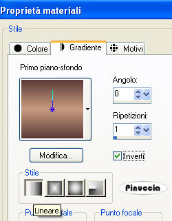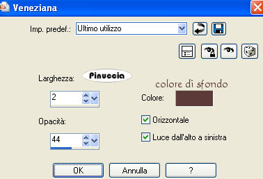 qui puoi trovare qualche risposta ai tuoi dubbi. Se l'argomento che ti interessa non è presente, ti prego di segnalarmelo. Questo tutorial è stato scritto con PSP X, ma può essere eseguito anche con le altre versioni di PSP. Il copyright del tutorial appartiene all'autrice. Il copyright della traduzione è mio. Occorrente: Materiale qui Rispetta il lavoro degli autori e mantieni i tubes al loro stato originale. Non cambiare il nome dei files e non cancellare il copyright. Metti la maschera gabeemask2 nella cartella Maschere, e il motivo oro nella cartella Motivi. 1. Apri tutto il materiale in PSP. Duplica i files usando sulla tastiera la combinazione di tasti shift(maiuscola)+D, e chiudi gli originali. Apri anche la maschera e minimizzala nella tua area di lavoro. 2. Apri una nuova immagine trasparente 600 x 450 pixels. 3. Imposta il colore di primo piano con un colore chiaro (il mio: #c79b7f), e il colore di sfondo con un colore scuro (il mio: #5c3b37). ![]() 4. Riempi l'immagine trasparente con il colore di primo piano.5. Livelli>Nuovo livello raster. Riempi questo livello con il colore di sfondo.6. Livelli>Nuovo livello maschera>Da immagine: Apri il menu sotto la finestra di origine e vedrai tutti i files aperti in Psp, vedrai anche la maschera che hai minimizzato all'inizio. Seleziona la maschera *gabeemask2* con i seguenti settaggi. ![]() 7. Livelli>Elimina e rispondi sì alla domanda Unire la maschera nel livello corrente. ![]() Livelli>Unisci>Unisci gruppo. 8. Apri il tube "couple12" e vai a Modifica>Copia. Torna al tuo lavoro e vai a Modifica>Incolla come nuovo livello. 9. Sposta il tube in basso a sinistra.Livelli>Duplica. 10. Effetti>Effetti 3D>Sfalsa ombra, con i seguenti settaggi, con il colore di sfondo. ![]() 11. Livelli>Unisci>Unisci giù. 12. Attiva il tube "Guitare&Wine", e vai a Modifica>copia. Torna al tuo lavoro e vai a Modifica>Incolla come nuovo livello. Immagine>Rifletti. Sposta il tube a destra.Cambia la modalità di miscelatura di questo livello in Luminanza (Esistente). Nella paletta dei livelli sposta questo livello sotto il livello della coppia. 13. Attiva il tube "flower&feathers", e vai a Modifica>Copia. Torna al tuo lavoro e vai a Modifica>Incolla come nuovo livello. Sposta il tube a destra.Cambia la modalità di miscelatura di questo livello in Luminanza (esistente). Nella paletta dei livelli sposta questo livello sotto il livello della chitarra. 14. Attiva il livello superiore. 15. Attiva il tube "cornergold_honeymoon", e vai a Modifica>Copia. Torna al tuo lavoro e vai a Modifica>Incolla come nuovo livello. 16. Questa dovrebbe essere la tua paletta dei livelli. ![]() Livelli>Unisci>Unisci tutto. 17. Immagine>Aggiugni bordatura, 1 pixels, simmetriche, con un colore qualsiasi purchè non sia presente nella tua immagine. 18. Attiva la bacchetta magica ![]() ![]() ingrandisci l'immagine usando la rotellina del mouse (se non hai la rotellina nel mouse attiva lo strumento zoom ![]() Passa il colore di primo piano a Motivi, e seleziona un motivo oro. se non hai un motivo oro clicca qui ![]() Riempi la selezione con questo motivo.Selezione>Deseleziona. 19. Immagine>Aggiungi bordatura, 15 pixels, simmetriche, con un colore qualsiasi purchè non presente nella tua immagine. 20. Seleziona questo bordo con la bacchetta magica ![]() Passa il colore di primo piano a Gradiente, con i seguenti settaggi: ![]() Riempi il bordo con questo gradiente.21. Effetti>Effetti di trama>Veneziana: ![]() 22. Ripeti l'Effetto Veneziana, selezionando anche Luce da sinistra: ![]() Selezione>Deselesiona. 23. Immagine>Aggiungi bordatura, 1 pixels, simmetriche, con un colore qualsiasi purchè non sia presente nella tua immagine. Seleziona il bordo con la bacchetta magica ![]() e riempilo con il motivo oro.Selezione>Deseleziona. 24. Aggiungi il tuo nome e/o il tuo watermark e salva in formato jpg. ![]() Se hai problemi o dubbi, o trovi un link non funzionante, o anche soltanto per un saluto, scrivimi. 12 Luglio 2008 |
