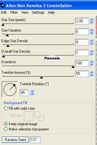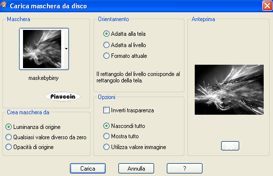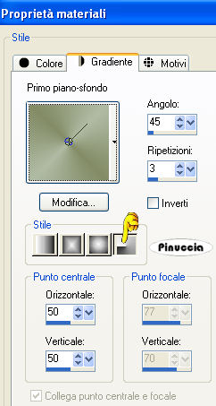qui puoi trovare qualche risposta ai tuoi dubbi. Se l'argomento che ti interessa non è presente, ti prego di segnalarmelo. Questo tutorial è stato scritto con PSP X2, ma può essere eseguito anche con le altre versioni di PSP. Per tradurlo, ho usato PSP X. Il copyright del tutorial appartiene all'autrice. Il copyright della traduzione è mio. Occorrente: Materiale qui Rispetta il lavoro degli autori. Non cambiare il nome dei files e non rimuovere il copyright. Metti le maschera nella cartella Maschere. Filtri: Graphics Plus qui Alien Skin Xenofex2 - Constellation qui Animation Shop qui 1. Apri il materiale in PSP. Duplicalo, usando sulla tastiera la combinazione di tasti shift(maiuscola)+D, e chiudi gli originali. 2. Apri una nuova immagine trasparente 600 x 450 pixels. 3. Imposta il colore di primo piano con un colore chiaro (il mio #afbba3), e il colore di sfondo con un colore scuro (il mio #838b66). 4. Passa il colore di primo piano a Gradiente, con i seguenti settaggi: ![]() Riempi l'immagine trasparente con questo gradiente.5. Livelli>Nuovo livello raster. Riempi questo livello con il colore di sfondo.6. Livelli>Carica/Salva maschera>Carica maschera da disco. Cerca e carica la maschera maskebybirry: ![]() Livelli>Elimina. Rispondi sì alla domanda unire la maschera nel livello corrente: ![]() Livelli>Unisci>Unisci gruppo. 7. Effetti>Effetti di bordo>Aumenta. 8. Livelli>Duplica. Immagine>Rifletti. 9. Attiva il tube faces(3) e vai a Modifica>copia. Torna al tuo lavoro e vai a Modifica>Incolla come nuovo livello. Sposta il tube in basso a destra.Cambia la modalità di miscelatura di questo livello in Luminanza (esistente). Abbassa l'opacità di questo livello al 60%. 10. Attiva il tube "CEBARRE_EYESOFTHESTARS", e vai a Modifica>copia. Torna al tuo lavoro e vai a Modifica>Incolla come nuovo livello. Sposta il tube in alto a destra.Cambia la modalità di miscelatura di questo livello in Luminanza (esistente). Abbassa l'opacità di questo livello al 60%. 11. Attiva il tube "woman002_Black4Roses", e vai a Modifica>copia. Torna al tuo lavoro e vai a Modifica>Incolla come nuovo livello. Immagine>Ridimensiona, al 60%, tutti i livelli non selezionato. Sposta il tube in alto a sinistra.Cambia la modalità di miscelatura di questo livello in Sovrapponi. Abbassa l'opacità di questo livello all'80%. 12. Attiva il tube "didier_face01_avril_2008", e vai a Modifica>copia. Torna al tuo lavoro e vai a Modifica>Incolla come nuovo livello. Immagine>Ridimensiona, al 70%, tutti i livelli non selezionato. Sposta il tube in basso a sinistra.Cambia la modalità di miscelatura di questo livello in Luminanza (esistente). 13. Livelli>Nuovo livello raster. Aggiungi il tuo watermark (non troppo vicino ai bordi). 14. Livelli>Unisci>Unisci tutto. ![]() 15. Selezione>Seleziona tutto. Selezione>Modifica - Contrai - 2 pixels. Selezione>Inverti. 16. Livelli>Nuovo livello raster. Imposta il colore di primo piano con #4f533f. Riempi il livello con questo colore.17. Effetti>Plugins>Graphics Plus - Cross Shadow, con i settaggi standard. ![]() 18. Livelli>Unisci>Unisci giù. 19. Selezione>inverti. 20. Livelli>Nuovo livello raster. Imposta nuovamente il colore di primo piano con il tuo colore di primo piano (#afbba3). Riempi il livello con questo colore.21. Selezione>Deseleziona. 22. Livelli>Carica/Salva maschera>Carica maschera da disco. Cerca e carica la maschera sg_icy-blast-frame: ![]() Livelli>Elimina. Rispondi sì alla domanda unire la maschera nel livello corrente: ![]() Livelli>Unisci>Unisci gruppo. 23. Effetti>Effetti di bordo>Aumenta. 24. Livelli>Duplica, e ripeti. Avrai così tre livelli della maschera. Attiva il livello originale. Effetti>Plugins>Alien Skin - Xenofex 2, con i seguenti settaggi: ![]() 25. Attiva il livello della prima copia. Effetti>Plugins>Alien Skin - Xenofex 2, con gli stessi settaggi, ma clicca una volta su Random Seed. Chiudi questo livello. 26. Attiva il livello della seconda copia. Effetti>Plugins>Alien Skin - Xenofex 2, e clicca su Random Seed. Chiudi questo livello. 27. Assicurati che siano chiusi i livelli delle copie del livello della maschera. ![]() Modifica>Copia Unione. Apri Animation Shop e vai a Modifica>Incolla>Incolla come nuova animazione. Torna in PSP. Chiudi il livello della maschera e apri il livello della prima copia. ![]() Modifica>Copia Unione. Torna in Animation Shop e vai a Modifica>Incolla>Incolla dopo il fotogramma corrente. 28. Di nuovo in Psp. Chiudi il livello della prima copia e apri il livello della seconda copia. ![]() Modifica>Copia Unione. Per finire, in Animation Shop: Modifica>Incolla>Incolla dopo il fotogramma corrente. Controlla il risultato cliccando su Visualizza e salva in formato gif.![]() ![]() Se hai problemi o dubbi, o trovi un link non funzionante, o anche soltanto per un saluto, scrivimi. 12 Luglio 2008 |