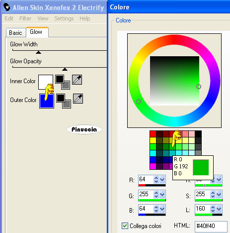 e imposta il colore esterno (outer color) con un verde (clicca sulla paletta del colore e scegli il colore nella finestra successiva).