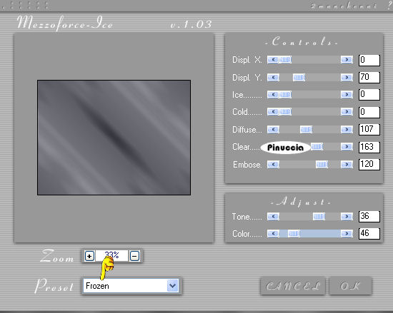 5. Effetti>Plugins>Mezzoforce ice - seleziona Frozen, con i settaggi standard.