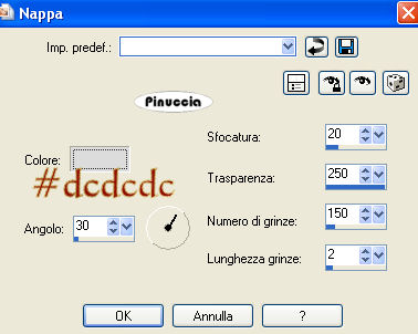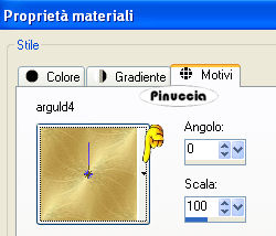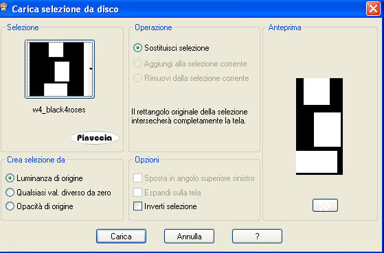 qui puoi trovare qualche risposta ai tuoi dubbi. Se l'argomento che ti interessa non è presente, ti prego di segnalarmelo. Questo tutorial è stato scritto con PSP X, ma può essere eseguito anche con le altre versioni di PSP. Il copyright del tutorial appartiene all'autrice. Occorrente: Materiale qui Rispetta il lavoro degli autori, non rimuovere il copyright e non cambiare il nome dei tubes. Metti la selezione "w4_black4roses" nella cartella Selezioni. Metti il motivo oro nella cartella Motivi. Filtri: Graphics Plus qui 1. Apri il materiale in PSP, duplicalo usando sulla tastiera la combinazione di tasti Shift(maiuscola)+D, e chiudi gli originali. 2. Apri una nuova immagine trasparente 199 x 410 pixels. 3. Passa il colore di primo piano a Motivi e seleziona il motivo oro Arguld4, con i settaggi standard. ![]() Imposta il colore di sfondo con un colore scuro; io ho usato #910f00: ![]() 4. Selezione>Carica/Salva selezione>Carica selezione da disco. Cerca e carica la selezione "w4_black4roses": ![]() 5. Riempi la selezione con il colore di sfondo.6. Effetti>Effetti di trama>Nappa: ![]() 7. Regola>Rimozione disturbo in un passaggio. 8. Livelli>Nuovo livello raster. Riempi la selezione con il motivo oro.9. Selezione>Modifica>Contrai - 1 pixel. Premi sulla tastiera il tasto CANC. Selezione>Deseleziona. 10. Attiva lo strumento Bacchetta magica ![]() ![]() e clicca sul riquadro superiore per selezionarlo. 11. Livelli>Nuovo livello raster. 12. Attiva il tube mc2537 e vai a Modifica>copia. Torna al tuo lavoro e vai a Modifica>Incolla nella selezione. Selezione>Deseleziona. Abbassa l'opacità di questo livello all'80%. 13. Attiva il livello Raster 2 e seleziona il riquadro centrale con la bacchetta magica ![]() 14. Livelli>Nuovo livello raster. 15. Attiva il tube "DivasShoe_TubedByGini_01-21-07", e vai a Modifica>Copia. Torna al tuo lavoro e vai a Modifica>Incolla nella selezione. Selezione>Deseleziona. Abbassa l'opacità di questo livello all'80%. 16. Nella paletta dei livelli attiva il livello Raster 2, e seleziona con la bacchetta magica il riquadro inferiore.17. Livelli>Nuovo livello raster. 18. Attiva il tube "parfum22-tube-colombe", e vai a Modifica>copia. Torna al tuo lavoro e vai a Modifica>Incolla nella selezione. Selezione>Deseleziona. Abbassa l'opacità di questo livello all'80%. 19. Livelli>Unisci>Unisci visibile. 20. Effetti>Effetti 3D>Sfalsa ombra: ![]() 21. Minimizza per il momento l'immagine. La riprenderai più tardi. 22. Apri una nuova immagine trasparente 600 x 450 pixels, e riempila con il colore di sfondo.23. Effetti>Effetti di trama>Veneziana: ![]() 24. Attiva il tube "@nn_171106_FashionColl_WakingSummer_TD", e vai a Modifica>Copia. Torna al tuo lavoro e vai a Modifica>Incolla come nuovo livello. Immagine>Ridimensiona, al 95%, tutti i livelli non selezionato. Sposta il tube a sinistra.25. Attiva il tube "FL-J2008-18", e vai a Modifica>Copia. Torna al tuo lavoro e vai a Modifica>Incolla come nuovo livello. Sposta il tube in alto a destra.Cambia la modalità di miscelatura di questo livello in Luminanza (esistente). 26. Effetti>Effetti di bordo>Aumenta. 27. Livelli>Duplica. Livelli>Unisci>Unisci giù. 28. Attiva il livello Raster 2. 29. Attiva lo strumento Gomma ![]() e cancella dalla foglia la traccia dei capelli della donna: ![]() 30. Attiva nuovamente il livello Raster 3. 31. Attiva il tube "traviata_jewels16", e vai a Modifica>Copia. Torna al tuo lavoro e vai a Modifica>Incolla come nuovo livello. Sposta il tube completamente in alto, contro il bordo (vedi il mio esempio).32. Immagine>Aggiungi bordatura, 1 pixel, simmetriche, con il colore bianco. Seleziona questo bordo con la bacchetta magica ![]() e riempilo con il motivo oro.Selezione>Deseleziona. 33. Immagine>Aggiungi bordatura, 1 pixel, simmetriche, con il colore nero. 34. Immagine>Aggiungi bordatura, 25 pixels, simmetriche, con il colore di sfondo. Seleziona questo bordo con la bacchetta magica ![]() 35. Effetti>Plugins>Graphics Plus - Cross Shadow, con i settaggi standard. ![]() Selezione>Deseleziona. 36. Immagine>Aggiungi bordatura, 1 pixel, simmetriche, con il colore bianco. Seleziona questo bordo con la bacchetta magica ![]() e riempilo con il motivo oro.Selezione>Deseleziona. 37. Immagine>Aggiungi bordatura, 1 pixel, simmetriche, con il colore nero. 38. Attiva l'immagine più piccola che hai messo da parte prima e vai a Modifica>Copia. Torna al tuo lavoro più grande e vai a Modifica>Incolla come nuovo livello. Sposta l'immagine a destra (vedi il mio esempio).38. Livelli>Nuovo livello raster. Aggiungi il tuo nome e/o il tuo watermark. 39. Livelli>Unisci>Unisci tutto e salva in formato jpg. ![]() Se hai problemi o dubbi, o trovi un link non funzionante, o anche soltanto per un saluto, scrivimi 12 Luglio 2008 |