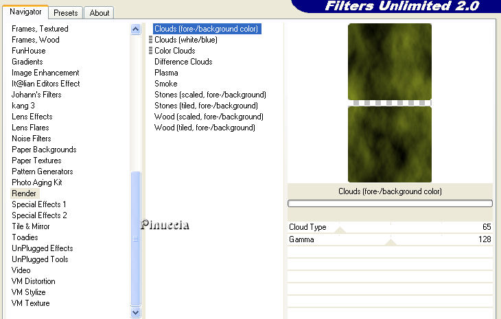 89. Effetti>Plugins>Filters Unlimited 2.0 - Render - Cloud(fore-/background color).