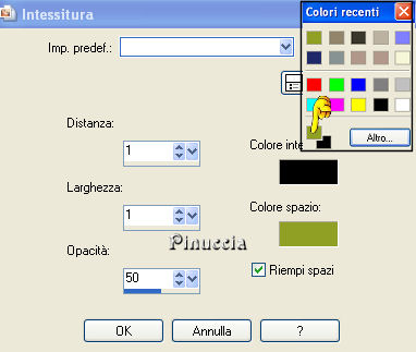19. Effetti>Effetti di trama>Intessitura, colore intessitura nero; colore spazi colore di primo piano #91a026.