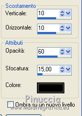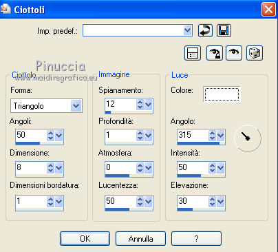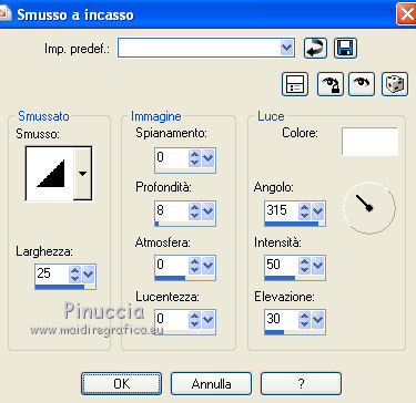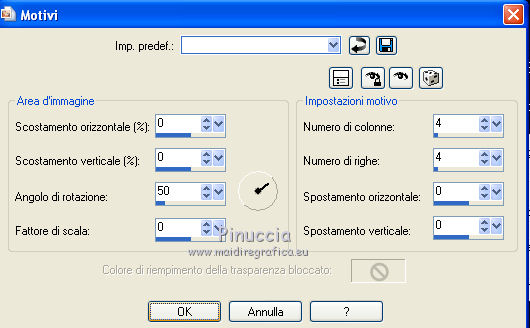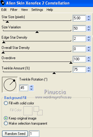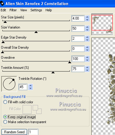 qui puoi trovare qualche risposta ai tuoi dubbi. Se l'argomento che ti interessa non è presente, ti prego di segnalarmelo. Per tradurre questo tutorial ho usato PSP X, ma può essere eseguito anche con le altre versioni di PSP. Questo tutorial è una creazione di ©Bluefay e non può essere copiato su altri siti nè essere offerto per il download. Lo stesso vale per la mia traduzione. Il materiale viene da vari gruppi di condivisione. Il copyright appartiene ai rispettivi autori. Grazie ai creatori dei tubes che mettono a disposizione il loro lavoro in vari gruppi di condivisione. Rispetta il lavoro degli autori, non cambiare il nome del file e non cancellare il watermark. Occorrente: Materiale qui Filtri: Filters Unlimited 2.0 qui Alien Skin Xenofex 2.0 - Constellation qui Ti servirà anche Animation Shop qui ![]() Apri la tua immagine. Immagine>Ridimensiona, a 400 pixels di larghezza. L'immagine fornita con il materiale ha già le corrette dimensioni 2. Scegli un bel colore dalla tua immagine, e impostalo come colore di primo piano (il mio #5f492c). Imposta il colore di sfondo con il nero. 3. Immagine>Aggiungi bordatura, 1 pixel, simmetriche, con il colore bianco. Ti ricordo che puoi richiamare i colori impostati nella tua paletta dei materiali. Cliccando con il tasto destro del mouse sulla paletta, ti apparirà la finestra con gli ultimi colori utilizzati. Tra questi, sono fissi il bianco e il nero alla fine della lista e - in basso a sinistra - i colori di primo piano e sfondo che hai impostato prima di eseguire il tutorial. ![]() 4. Immagine>Aggiungi bordatura, 2 pixels, simmetriche, con il colore di primo piano. 5. Immagine>Aggiungi bordatura, 1 pixel, simmetriche, con il colore bianco. 6. Immagine>Aggiungi bordatura, 15 pixels, simmetriche, con il colore nero. 7. Seleziona il bordo nero con la bacchetta magica ![]() 8. Effetti>Effetti di riflesso>Motivi. ![]() 9. Effetti>Effetti di bordo>Aumenta. Selezione>Deseleziona. 10.Immagine>Aggiungi bordatura, 2 pixels, simmetriche, con il colore di primo piano. Immagine>Aggiungi bordatura, 1 pixel, simmetriche, con il colore bianco. Immagine>Aggiungi bordatura, 15 pixels, simmetriche, con il colore nero. 11. Passa il colore di primo piano a Gradiente. ![]() 12. Immagine>Aggiungi bordatura, 25 pixels, simmetriche, con il colore nero. Seleziona questo bordo con la bacchetta magica ![]() e riempilo con il gradiente.13. Regola>Sfocatura>Sfocatura gaussiana - raggio 25. ![]() 14. Effetti>Plugins>Filters Unlimited 2.0 - Tile & Mirror - Distortion Mirror(horizontal). ![]() 15. Selezione>Deseleziona. 16. Immagine>Aggiungi bordatura, 1 pixel, simmetriche, con il colore bianco. 17. Immagine>Aggiungi bordatura, 2 pixels, simmetriche, con il colore di primo piano. 18. Immagine>Aggiungi bordatura, 1 pixel, simmetriche, con il colore bianco. 19. Immagine>Aggiungi bordatura, 35 pixels, simmetriche, con il colore nero. 20. Seleziona questo bordo con la bacchetta magica ,e riempi la selezione con il gradiente.21. Regola>Sfocatura>Sfocatura gaussiana - raggio 25. 22. Effetti>Effetti di trama>Ciottoli. ![]() 23. Effetti>Effetti 3D>Smusso a incasso. ![]() 24. Selezione>Deseleziona. 25. Immagine>Aggiungi bordatura, 1 pixel, simmetriche, con il colore bianco. 26. Immagine>Aggiungi bordatura, 2 pixels, simmetriche, con il colore di primo piano. 27. Immagine>Aggiungi bordatura, 1 pixel, simmetriche, con il colore bianco. 28. Immagine>Aggiungi bordatura, 15 pixels, simmetriche, con il colore nero. 29. Seleziona questo bordo con la bacchetta magica .30. Effetti>Effetti di riflesso>Motivi, con i settaggi precedenti. ![]() 31. Effetti>Effetti di bordo>Aumenta. Selezione>Deseleziona. 32. Immagine>Aggiungi bordatura, 1 pixel, simmetriche, con il colore bianco. 33. Immagine>Aggiungi bordatura, 2 pixels, simmetriche, con il colore di primo piano. 34. Immagine>Aggiungi bordatura, 1 pixel, simmetriche, con il colore bianco. 35. Immagine>Aggiungi bordatura, 45 pixels, simmetriche, con il colore nero. 36. Seleziona questo bordo con la bacchetta magica ,e riempi la selezione con il gradiente.37. Effetti>Plugins>Filters Unlimited 2.0 - Tile&Mirror - Kaleidoscope2: ![]() 38. Selezione>Inverti. Effetti>Effetti 3D>Sfalsa ombra, con il colore nero. ![]() Ripeti l'Effetto Sfalsa ombra, cambiando verticale e orizzontale con -10. 39. Selezione>Deseleziona. 40. Immagine>Aggiungi bordatura, 1 pixel, simmetriche, con il colore bianco. 41. Immagine>Aggiungi bordatura, 2 pixels, simmetriche, con il colore di primo piano. 42. Immagine>Aggiungi bordatura, 1 pixel, simmetriche, con il colore bianco. 43. Aggiungi il tuo nome e/o il tuo watermark su un nuovo livello. 44. Livelli>Unisci>Unisci tutto. 45. Apri il tube "corner" e vai a Modifica>copia. Torna al tuo lavoro e vai a Modifica>Incolla come nuovo livello. Spostalo nell'angolo in alto a sinistra della cornice interna - vedi il mio esempio.46. Livell>Duplica. Immagine>Rifletti. Immagine>Capovolgi. 47. Livelli>Unisci>Unisci giù. 48. Effetti>Plugins>Alien Skin Xenofex 2.0 - Constellation. ![]() Modifica>Copia Unione. 49. Apri Animation Shop e vai a Modifica>Incolla>Incolla come nuova animazione. 50. Torna in PSP. Modifica>Annulla azione Constellation. 51. Ripeti l'Effetto Constellation cambiando soltanto Star Size con 5,00. ![]() Modifica>Copia Unione. 52. Torna in Animation Shop e vai a Modifica>Incolla>Incolla dopo il fotogramma corrente. 53. Controlla il risultato cliccando su Visualizza e salva in formato gif.I tubes usati per questi esempi sono di Macha e Mentali. ![]() ![]() ![]() Se hai problemi o dubbi, o trovi un link non funzionante, o anche soltanto per un saluto, scrivimi 4 Luglio 2010 |
