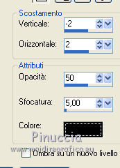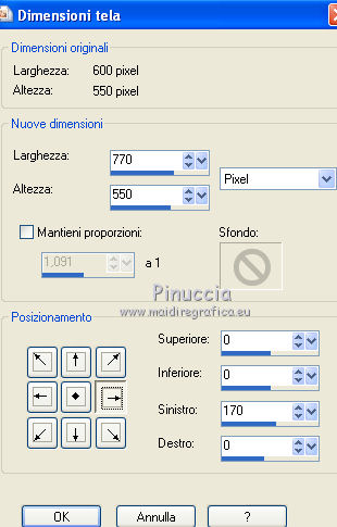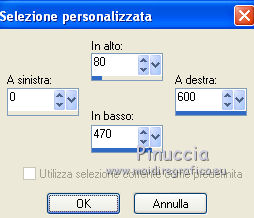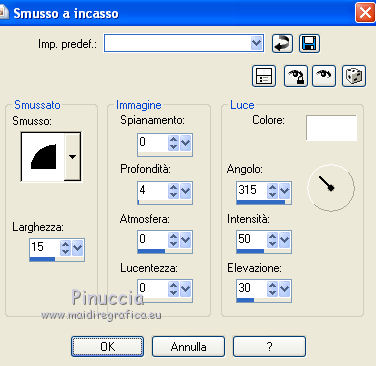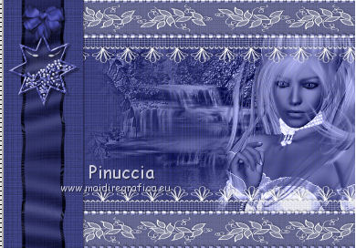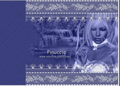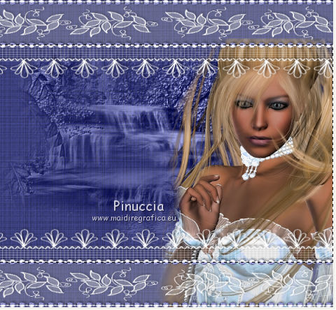 qui puoi trovare qualche risposta ai tuoi dubbi. Se l'argomento che ti interessa non è presente, ti prego di segnalarmelo. Per tradurre questo tutorial ho usato PSP X, ma può essere eseguito anche con le altre versioni di PSP. I diritti d'autore del tutorial e dell'esecuzione del tutorial Beautiful Easter appartengono a ©Bluefay. Tutti i tubes di questo tutorial sono stati creati da Bluefay con Photoshop e 3D Studio DAZ. Il copyright di tutto il materiale è ©Bluefay. Tutti i diritti riservati. Nessuno dei lavori e del materiale di Bluefay (se non diversamente specificato) può essere riprodotto, in tutto o in parte, in qualsiasi modo o forma, senza la sua autorizzazione scritta. ***** Allo stesso modo, il copyright della traduzione e della creazione appartengono a ©Maidiregrafica.eu. ***** Occorrente: Scrapkit ©Bluefay "Blue Dreams" qui Filtri: FM Tile Tools - Blend Emboss qui 1. Apri una nuova immagine trasparente 600 x 550 pixels. 2. Selezione>Seleziona tutto. Apri il tube di "BluefayTubes Paper2" e vai a Modifica>Copia. Torna al tuo lavoro e vai a Modifica>Incolla nella selezione. Selezione>Deseleziona. 3. Apri il tube di "BluefayTubes LaceRibbon1" e vai a Modifica>Copia. Torna al tuo lavoro e vai a Modifica>Incolla come nuovo livello. Spostalo in alto, contro il bordo.![]() 4. Livelli>Duplica. Immagine>Capovolgi. Livelli>Unisci>Unisci giù. 5. Effetti>Effetti 3D>Sfalsa ombra, con il colore nero. ![]() 6. Attiva lo strumento Selezione ,clicca sull'icona Selezione personalizzata ![]() e imposta i seguenti settaggi: ![]() Livelli>Nuovo livello raster. 7. Apri il tube di "BluefayScenicTubes PaintingWaterFall" e vai a Modifica>Copia. Torna al tuo lavoro e vai a Modifica>Incolla nella selezione. Mantieni selezionato. 8. Livelli>Disponi>Sposta giù. Nella paletta dei livelli cambia la modalità di miscelatura di questo livello in Luminanza (esistente). Mantieni ancora selezionato. 9. Effetti>Plugins>FM Tile Tools - Blend Emboss, con i settaggi standard. ![]() 10. Apri il poser di "BluefayTubes Vivien" e vai a Modifica>Copia. Torna al tuo lavoro e vai a Modifica>Incolla come nuovo livello. Spostalo in basso a destra.![]() 11. Selezione>Inverti. Premi sulla tastiera il tasto CANC. Selezione>Deseleziona. 12. Cambia la modalità di miscelatura di questo livello in Luminanza (esistente). 13. Livelli>Unisci>Unisci visibile. 14. Livelli>Nuovo livello raster. Livelli>Disponi>Sposta giù. 15. Immagine>Dimensioni tela. ![]() 16. Livelli>Unisci>Unisci visibile. 17. Apri il tube di "BluefayTubes Paper1" e vai a Modifica>Copia. Torna al tuo lavoro e vai a Modifica>Incolla come nuovo livello. Spostalo a sinistra.![]() 18. Effetti>Effetti 3D>Sfalsa ombra, con il colore nero. ![]() 19. Apri il tube di "BluefayTubes BlueRibbon1" e vai a Modifica>Copia. Torna al tuo lavoro e vai a Modifica>Incolla come nuovo livello. Immagine>Ruota per gradi. ![]() Spostalo a sinistra.![]() 19. Apri il tube di "BluefayTubes DecoStern1" e vai a Modifica>Copia. Torna al tuo lavoro e vai a Modifica>Incolla come nuovo livello. Spostalo in alto a sinistra.![]() 20. Effetti>Effetti 3D>Sfalsa ombra, con il colore nero. ![]() 21. Livelli>Unisci>Unisci tutto. 22. Immagine>Aggiungi bordatura, 2 pixels, simmetriche, con il colore bianco. 23. Immagine>Aggiungi bordatura, 20 pixels, simmetriche, con il colore nero. 24. Seleziona il bordo nero con la bacchetta magica ![]() 25. Apri il tube di "BluefayTubes Paper4" e vai a Modifica>Copia. Torna al tuo lavoro e vai a Modifica>Incolla nella selezione. 26. Effetti>Effetti 3D>Smusso a incasso. ![]() 27. Selezione>Deseleziona. 28. Immagine>Aggiungi bordatura, 2 pixels, simmetriche, con il colore bianco. 29. Immagine>Aggiungi bordatura, 30 pixels, simmetriche, con il colore nero. Seleziona questo bordo con la bacchetta magica ![]() 30. Apri il tube di "BluefayTubes Paper2" e vai a Modifica>Copia. Torna al tuo lavoro e vai a Modifica>Incolla nella selezione. Effetti>Effetti di bordo>Aumenta. 31. Effetti>Effetti 3D>Smusso a incasso, con i settaggi precedenti. ![]() 32. Selezione>Deseleziona. 33. Apri il tube di "BluefayTubes BlueFlower1" e vai a Modifica>Copia. Torna al tuo lavoro e vai a Modifica>Incolla come nuovo livello. Spostalo in basso a destra.![]() 34. Immagine>Aggiungi bordatura, 2 pixels, simmetriche, con il colore bianco. Immagine>Aggiungi bordatura, 20 pixels, simmetriche, con il colore nero. Seleziona questo bordo con la bacchetta magica ![]() 35. Apri il tube di "BluefayTubes Paper4" e vai a Modifica>Copia. Torna al tuo lavoro e vai a Modifica>Incolla nella selezione. Effetti>Effetti 3D>Smusso a incasso, con i settaggi precedenti. ![]() 36. Selezione>Deseleziona. 37. Immagine>Aggiungi bordatura, 2 pixels, simmetriche, con il colore bianco. Regola>Messa a fuoco>Metti a fuoco. Firma il tuo lavoro e salva in formato jpg. ![]() Se hai problemi o dubbi, o trovi un link non funzionante, o anche soltanto per un saluto, scrivimi 25 Ottobre 2011 |
