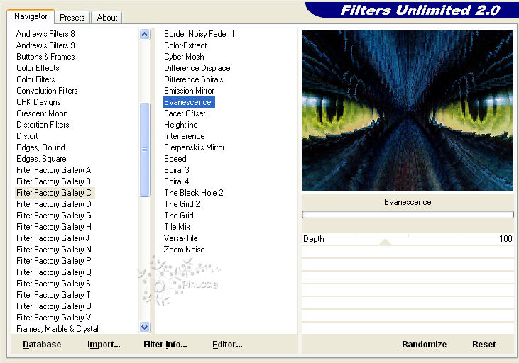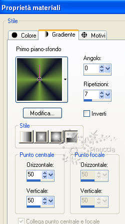 qui puoi trovare qualche risposta ai tuoi dubbi. Se l'argomento che ti interessa non è presente, ti prego di segnalarmelo. Per tradurre questo tutorial ho usato PSP X, ma può essere eseguito anche con le altre versioni di PSP. Questo tutorial è una creazione di ©Bluefay e non può essere copiato su altri siti nè essere offerto per il download. Lo stesso vale per la mia traduzione. Il materiale viene da vari gruppi di condivisione. Il copyright appartiene ai rispettivi autori. Grazie ai creatori dei tubes che mettono a disposizione il loro lavoro in vari gruppi di condivisione. Rispetta il lavoro degli autori, non cambiare il nome del file e non cancellare il watermark. Occorrente: Materiale qui Il tube usato è di Gini. Filtri: Filters Unlimited 2.0 qui Filter Factory Gallery C - Evanescence qui Filter Factory Gallery D - Vertigo qui I filtri Factory Gallery per essere usati devono prima essere convertiti. Come fare vedi qui Si usano importandoli in Filters Unlimited (come fare vedi qui) ma possono funzionare anche da soli. Le mie Gallery D, che non sono più reperibili sul sito ufficiale, ma soltanto nei vari files che girano in rete - sono state già convertite. ![]() 1. Apri il tube di Gini. Duplicalo usando la combinazione maiuscola+D e chiudi l'originale. La copia sarà la base del tuo lavoro. Elimina il livello del watermark. Livelli>Unisci>Unisci tutto. Immagine>Ridimensiona, a 500 pixels di larghezza. ![]() 2. Imposta il colore di primo piano con un colore brillante (il mio #749c3c), e il colore di sfondo con il colore #0f1328. 3. Immagine>Aggiungi bordatura, 1 pixel, simmetriche, con il colore chiaro di primo piano. Prima di continuare, ti ricordo che puoi richiamare i colori impostati nella tua paletta dei materiali. Cliccando con il tasto destro del mouse sulla paletta, ti apparirà la finestra con gli ultimi colori utilizzati. Tra questi, sono fissi il bianco e il nero alla fine della lista e - in basso a sinistra - i colori di primo piano e sfondo che hai impostato prima di eseguire il tutorial. ![]() 4. Immagine>Aggiungi bordatura, 2 pixels, simmetriche, con il colore scuro di sfondo. 5. Immagine>Aggiungi bordatura, 2 pixels, simmetriche, con il colore chiaro di primo piano. 6. Selezione>Seleziona tutto. Selezione>Modifica>Contrai - 4 pixels. Selezione>Inverti. 7. Effetti>Effetti 3D>Smusso a incasso. ![]() 8. Selezione>Deseleziona. Immagine>Aggiungi bordatura, 10 pixels, simmetriche, con il colore scuro di sfondo. 9. Seleziona questo bordo con la bacchetta magica ![]() 10. Effetti>Plugins>Filters Unlimited - Filter Factory Gallery C - Evanescence. ![]() 11. Selezione>Deseleziona. 12. Immagine>Aggiungi bordatura, 1 pixel, simmetriche, con il colore chiaro di primo piano. 13. Immagine>Aggiungi bordatura, 2 pixels, simmetriche, con il colore scuro di sfondo. 14. Immagine>Aggiungi bordatura, 1 pixel, simmetriche, con il colore chiaro di primo piano. 15. Selezione>Seleziona tutto. Selezione>Modifica>Contrai - 4 pixels. Selezione>Inverti. 16. Effetti>Effetti 3D>Smusso a incasso. ![]() 17. Selezione>Deseleziona. Passa il colore di primo piano a Gradiente. ![]() 18. Immagine>Aggiungi bordatura, 25 pixels, simmetriche, con il colore nero. 19. Seleziona questo bordo con la bacchetta magica ![]() 20. Riempi la selezione con il gradiente.21. Effetti>Effetti di trama>Veneziana. ![]() 22. Ripeti l'Effetto Veneziana, togliendo la selezione a Orizzontale. ![]() 23. Selezione>Deseleziona. 24. Immagine>Aggiungi bordatura, 1 pixel, simmetriche, con il colore chiaro di primo piano. 25. Immagine>Aggiungi bordatura, 2 pixels, simmetriche, con il colore scuro di sfondo. 26. Immagine>Aggiungi bordatura, 1 pixel, simmetriche, con il colore chiaro di primo piano. 27. Selezione>Seleziona tutto. Selezione>Modifica>Contrai - 4 pixels. Selezione>Inverti. 28. Effetti>Effetti 3D>Smusso a incasso. ![]() 29. Selezione>Deseleziona. Cambia i settaggi del gradiente. ![]() 30. Immagine>Aggiungi bordatura, 35 pixels, simmetriche, con il colore nero. 31. Seleziona questo bordo con la bacchetta magica ![]() 32. Riempi la selezione con il gradiente.33. Effetti>Plugins>Filters Unlimited - Filter Factory Gallery D - Vertigo. ![]() 34. Effetti>Effetti di bordo>Aumenta. 35. Effetti>Effetti 3D>Smusso a incasso. ![]() 36. Selezione>Deseleziona. 37. Immagine>Aggiungi bordatura, 1 pixel, simmetriche, con il colore scuro di sfondo. 38. Immagine>Aggiungi bordatura, 1 pixel, simmetriche, con il colore chiaro di primo piano. 39. Immagine>Aggiungi bordatura, 2 pixels, simmetriche, con il colore scuro di sfondo. 40. Immagine>Aggiungi bordatura, 1 pixel, simmetriche, con il colore chiaro di primo piano. 41. Selezione>Seleziona tutto. Selezione>Modifica>Contrai - 5 pixels. Selezione>Inverti. 42.Effetti>Effetti 3D>Smusso a incasso. ![]() 43. Selezione>Deseleziona. Immagine>Aggiungi bordatura, 10 pixels, simmetriche, con il colore scuro di sfondo. 44. Seleziona questo bordo con la bacchetta magica ![]() 45. Effetti>Plugins>Filters Unlimited - Filter Factory Gallery C - Evanescence. ![]() 46. Selezione>Deseleziona. 47. Immagine>Aggiungi bordatura, 1 pixel, simmetriche, con il colore chiaro di primo piano. 48. Immagine>Aggiungi bordatura, 2 pixels, simmetriche, con il colore scuro di sfondo. 49. Immagine>Aggiungi bordatura, 1 pixel, simmetriche, con il colore chiaro di primo piano. 50. Selezione>Seleziona tutto. Selezione>modifica>Contrai - 4 pixels. Selezione>inverti. 51. Effetti>Effetti 3D>Smusso a incasso. ![]() 52. Selezione>Deseleziona. Immagine>Ridimensiona, a 620 pixels di larghezza. ![]() 53. Apri il tube "corner76" e vai a Modifica>copia. Torna al tuo lavoro e vai a Modifica>Incolla come nuovo livello. 54. Sposta il tube nell'angolo in alto a sinistra.55. Regola>Tonalità e saturazione>Viraggio, con i settaggi corrispondenti al tuo colore di chiaro. ![]() 56. Livelli>Duplica. Immagine>Rifletti. Immagine>Capovolgi. 57. Livelli>Unisci>Unisci tutto. 58. Aggiungi il tuo nome e/o il tuo watermark su un nuovo livello. Livelli>
