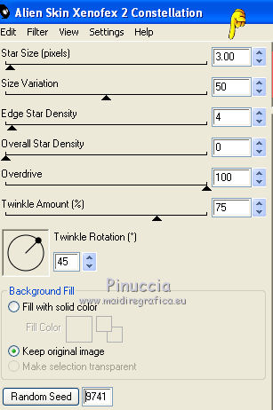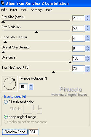 qui puoi trovare qualche risposta ai tuoi dubbi. Se l'argomento che ti interessa non è presente, ti prego di segnalarmelo. Per tradurre questo tutorial ho usato PSP X, ma può essere eseguito anche con le altre versioni di PSP. Questo tutorial è una creazione di ©Bluefay e non può essere copiato su altri siti nè essere offerto per il download. Lo stesso vale per la mia traduzione. Il materiale viene da vari gruppi di condivisione. Il copyright appartiene ai rispettivi autori. Grazie ai creatori dei tubes che mettono a disposizione il loro lavoro in vari gruppi di condivisione. Rispetta il lavoro degli autori, non cambiare il nome del file e non cancellare il watermark. Occorrente: Lo scrapkit di Bluefay "Dreaming of silence" qui Il ©copyright di questo scrapkit appartiene a Bluefay. Filtri: Alien Skin Xenofex 2.0 - Constellation qui Ti servirà anche Animation Shop qui ![]() 1. Apri una nuova immagine trasparente 825 x 596 pixels, e riempila con il colore nero.2. Apri "element 1" e vai a Modifica>Copia. Torna al tuo lavoro e vai a Modifica>Incolla come nuovo livello. 3. Apri "element 3" e vai a Modifica>Copia. Torna al tuo lavoro e vai a Modifica>Incolla come nuovo livello. 4. Attiva lo strumento Bacchetta magica , sfumatura e tolleranza 0,![]() e clicca al centro della cornice per selezionarla. 5. Selezione>Modifica>Espandi - 4 pixels. 6. Livelli>Nuovo livello raster. 7. Apri "element 2" e vai a Modifica>Copia. Torna al tuo lavoro e vai a Modifica>Incolla nella selezione. 8. Livelli>Disponi>Sposta giù e mantieni selezionato. 9. Apri "site femmes 1220639femmes" e vai a Modifica>Copia. Torna al tuo lavoro e vai a Modifica>Incolla come nuovo livello. Sposta il tube un po' più in alto, come nel mio esempio.![]() 10. Selezione>Inverti. Premi sulla tastiera il tasto CANC. Selezione>Deseleziona. 11. Cambia la modalità di miscelatura di questo livello in Luminanza (esistente). 12. Livelli>Unisci>Unisci visibile. 13. Apri "element 4" e vai a Modifica>Copia. Torna al tuo lavoro e vai a Modifica>Incolla come nuovo livello. Sposta l'elemento in basso, come nel mio esempio.![]() 14. Apri "element 5" e vai a Modifica>Copia. Torna al tuo lavoro e vai a Modifica>Incolla come nuovo livello. Sposta l'elemento a destra, come nel mio esempio.![]() 15. Livelli>Duplica. Immagine>Rifletti. 16. Livelli>Unisci>Unisci visibile. 17. Apri "element 6" e vai a Modifica>Copia. Torna al tuo lavoro e vai a Modifica>Incolla come nuovo livello. Sposta l'elemento un po' più in alto, come nel mio esempio.![]() 18. Apri "element 7" e vai a Modifica>Copia. Torna al tuo lavoro e vai a Modifica>Incolla come nuovo livello. Sposta il tube in basso, come nel mio esempio.![]() 19. Apri "element 8" e vai a Modifica>Copia. Torna al tuo lavoro e vai a Modifica>Incolla come nuovo livello. Sposta l'elemento in basso sopra le foglie, come nel mio esempio.![]() 20. Apri "element 9" e vai a Modifica>Copia. Torna al tuo lavoro e vai a Modifica>Incolla come nuovo livello. Sposta anche questo elemento in basso, come nel mio esempio.![]() 21. Aggiungi il tuo nome e/o il tuo watermark su un nuovo livello. 22. Effetti>Plugins>Alien Skin Xenofex 2.0 - Constellation. ![]() 23. Modifica>Copia. Apri Animation Shop e vai a Modifica>Incolla>Incolla come nuova animazione. 24. Torna in PSP. Modifica>Annulla azione Constellation. Puoi anche cliccare sull'icona corrispondente nella barra superiore degli strumenti. ![]() 24. Ripeti l'Effetto Constellation cambiando soltanto Star Size con 3,00. ![]() 25. Modifica>Copia. Torna in Animation Shop e vai a Modifica>Incolla>Incolla dopo il fotogramma corrente. Controlla il risultato cliccando su Visualizza e salva in formato gif.![]() Se hai problemi o dubbi, o trovi un link non funzionante, o anche soltanto per un saluto, scrivimi 1 Giugno 2010 |